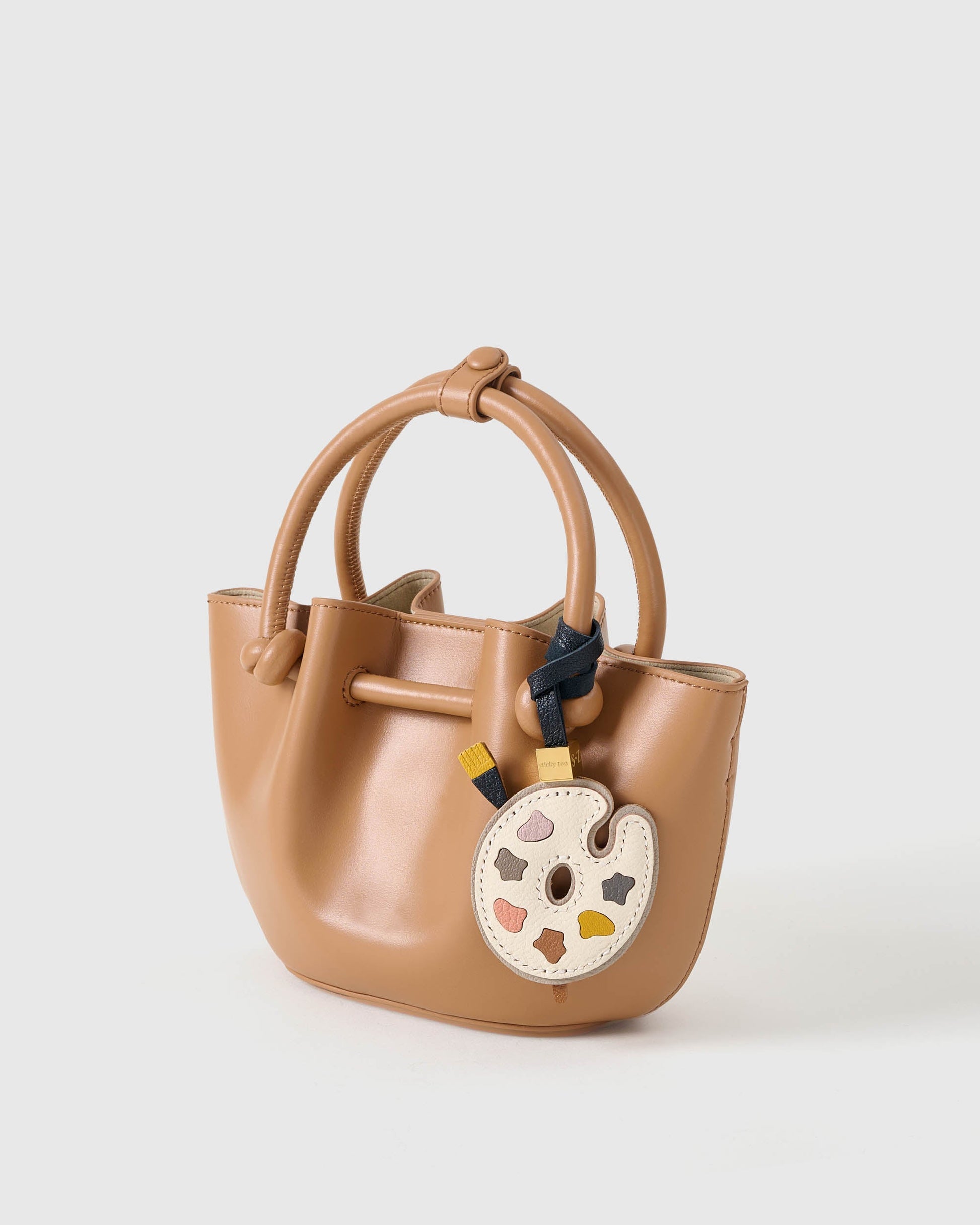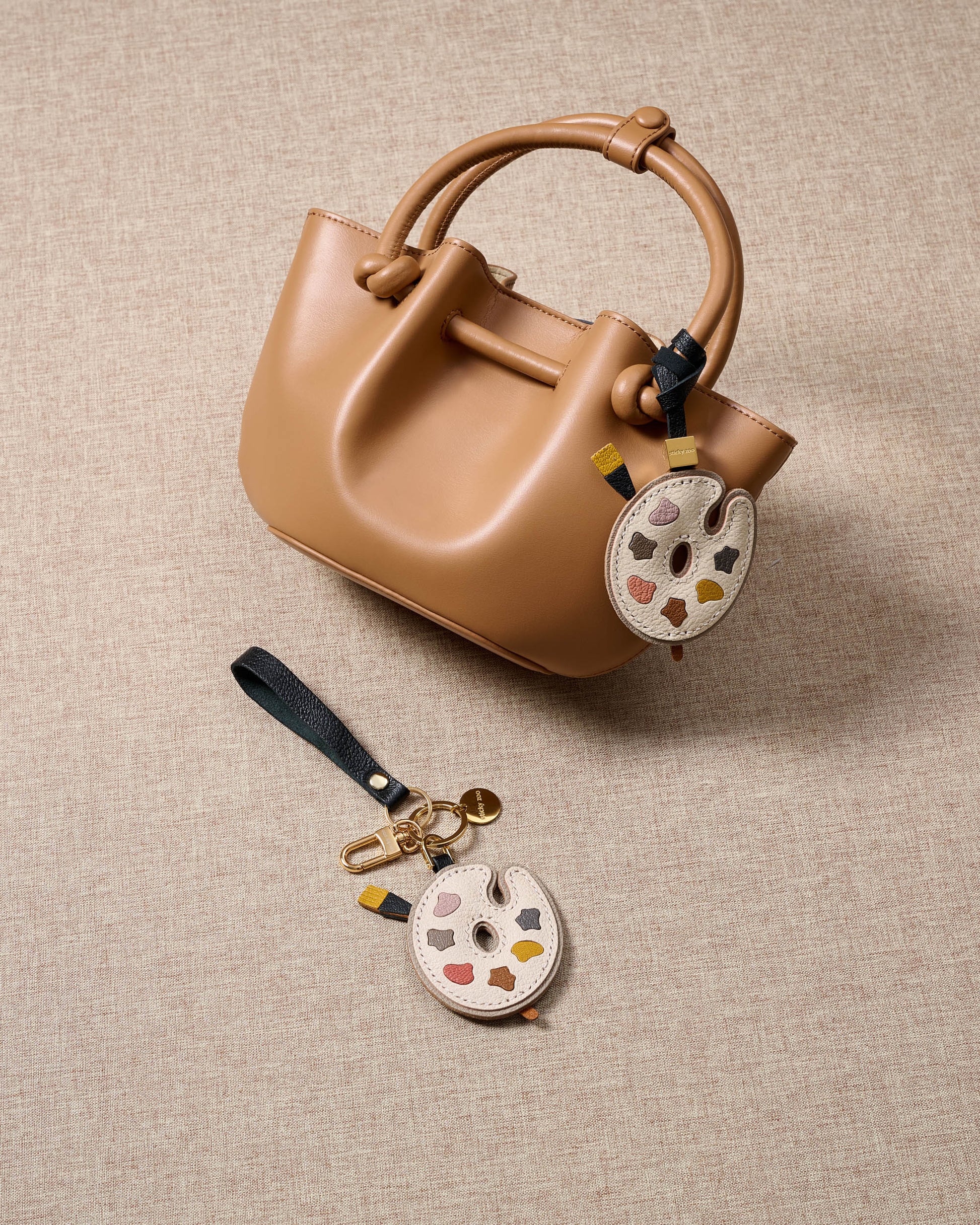 The Artist Palette Charm is a playful nod to every dreamer who sees the world in color. Sculpted from pure sheepskin and French ALRAN goatskin, each palette is detailed with miniature daubs of leather “paint” in soft sunset tones—complete with two handcrafted brush straps. It's wearable art, for creative hearts.