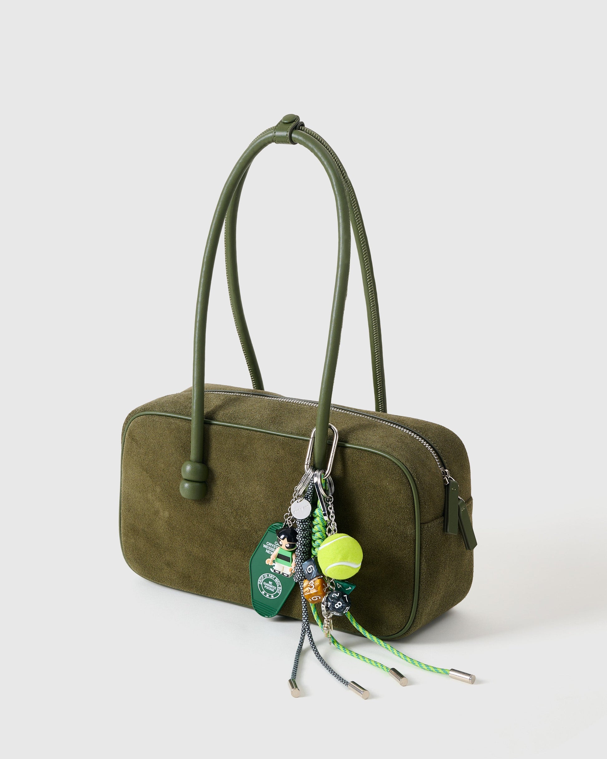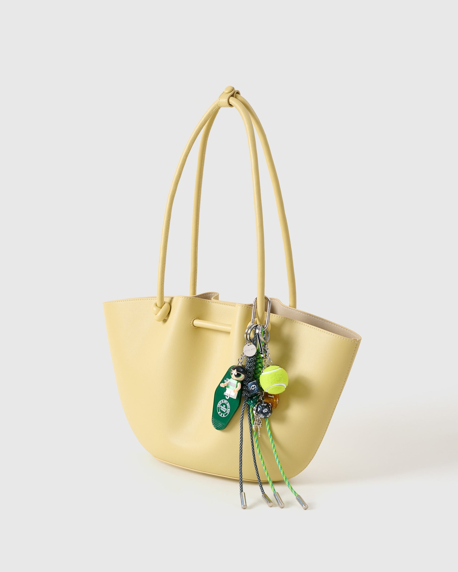 | Materials | Resin figure, fabric tennis ball, motel tag, polyhedral dice, zinc alloy charm set, nylon paracord |