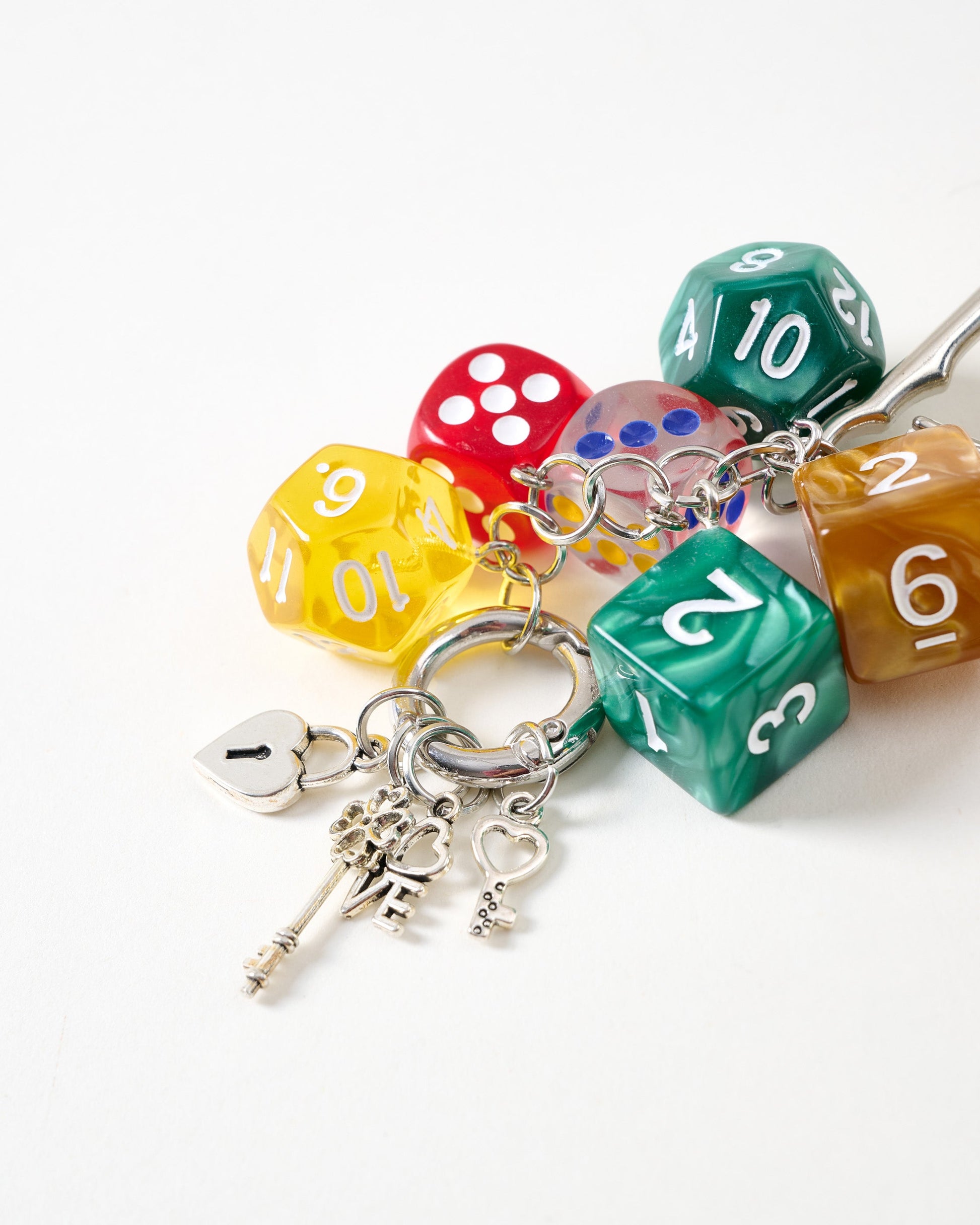 | Materials | Resin dice, molded mini figure, faux tennis ball, woven cord |