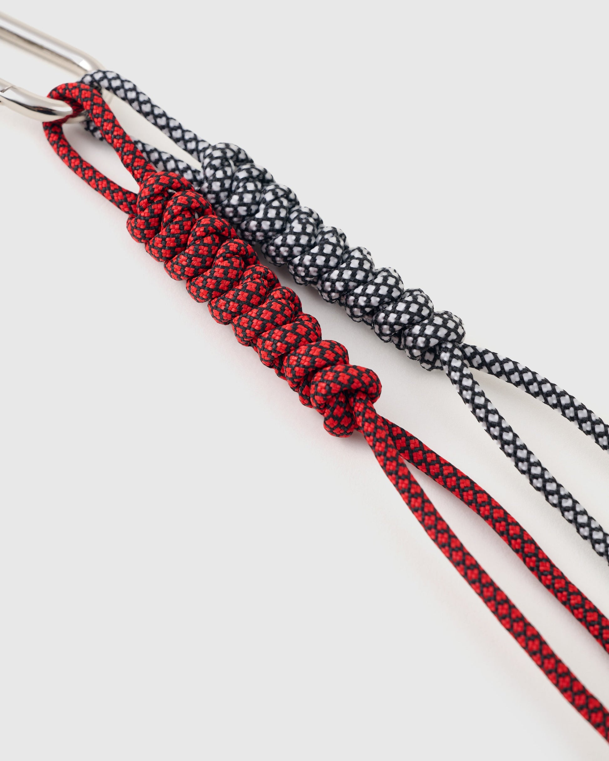 - Hand-knotted paracord ropes in dynamic red and grey tones