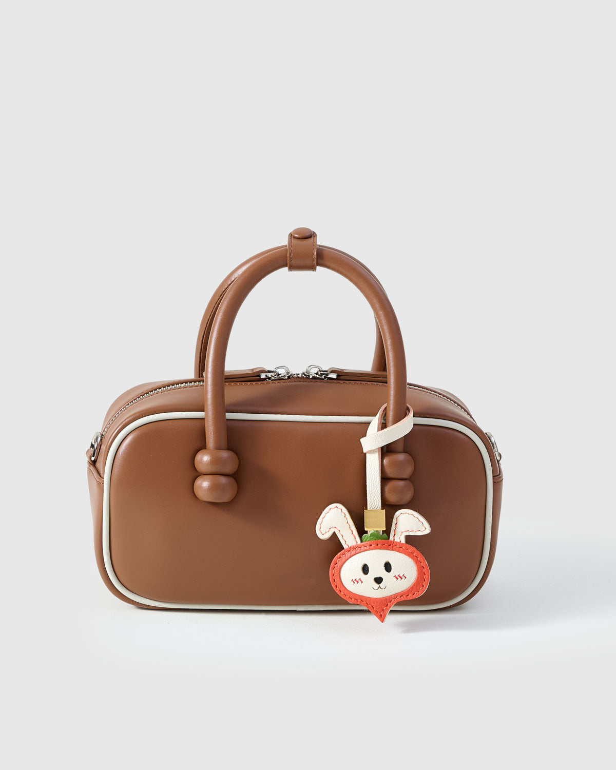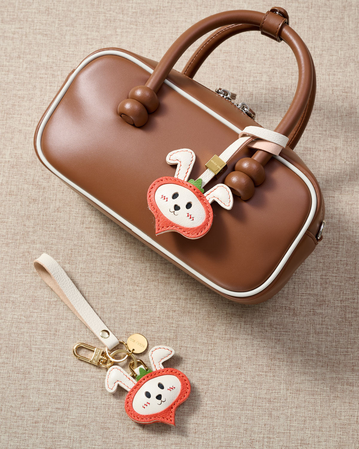 Carrot Rabbit design — made from premium French Alran leather in soft ivory, orange, and green tones. Every detail is lovingly stitched, from the blushing cheeks to the textured carrot “hood.” The contrast strap and gold cube hardware complete its refined yet adorable look.