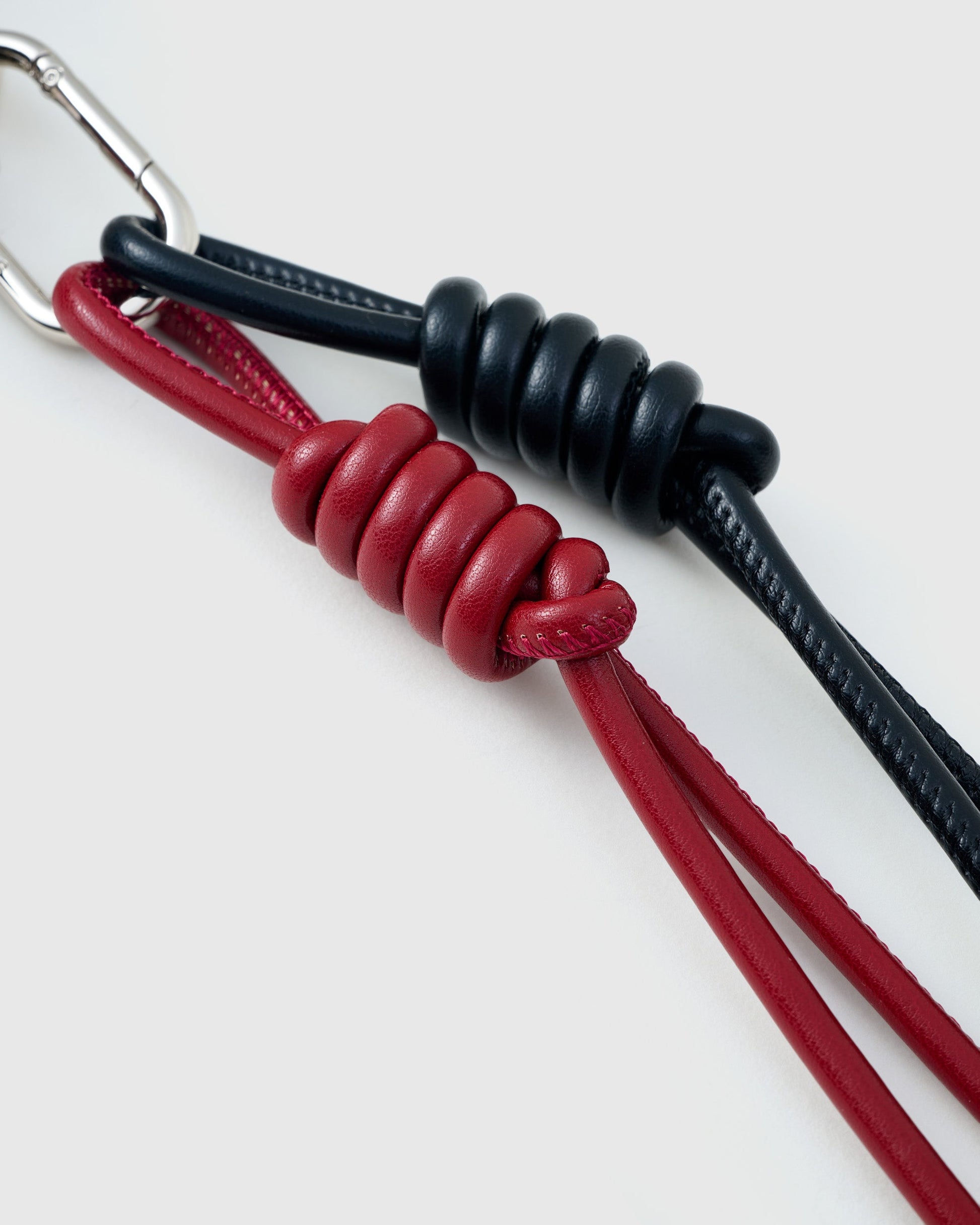 - Black & cranberry leather cords add elegant movement