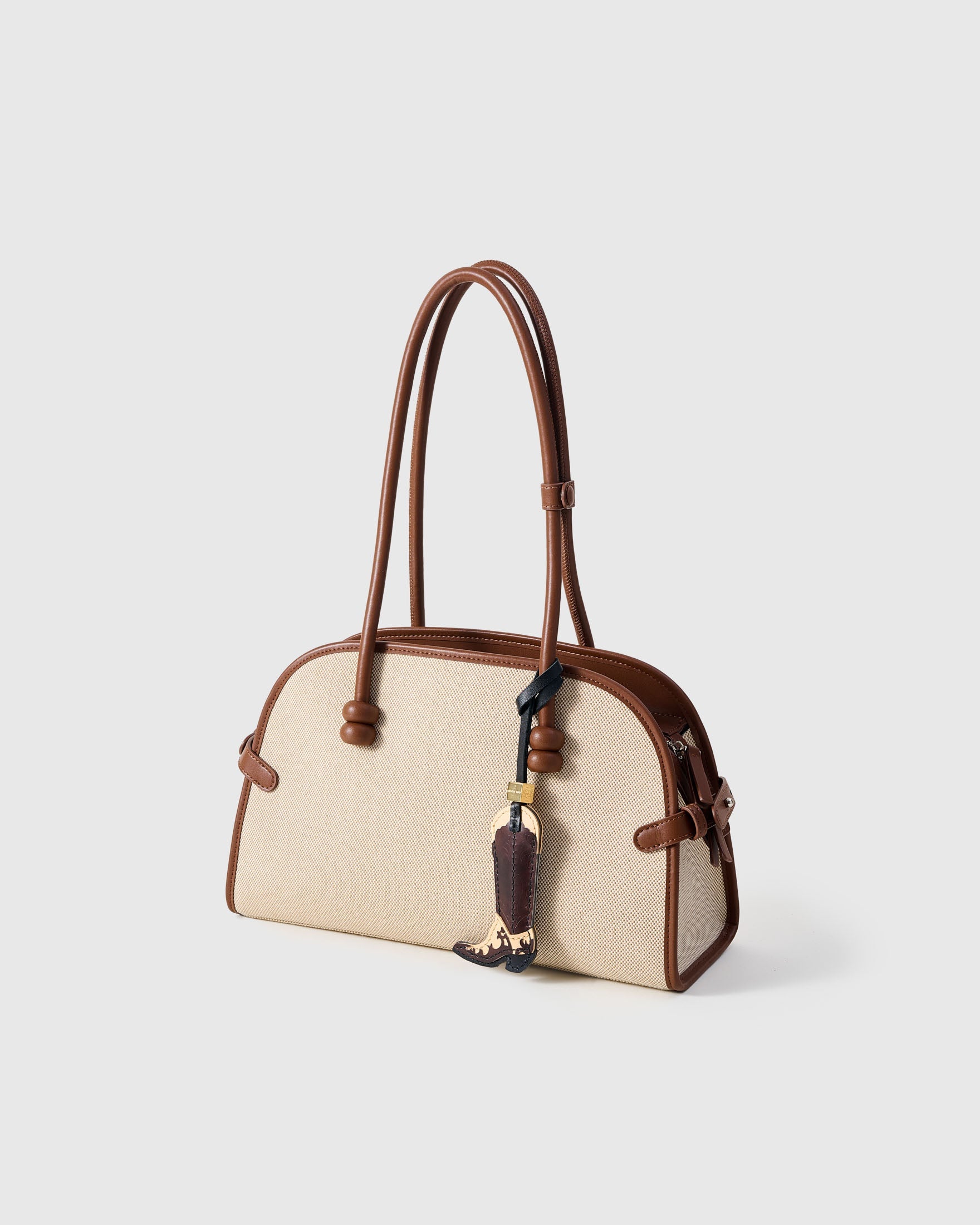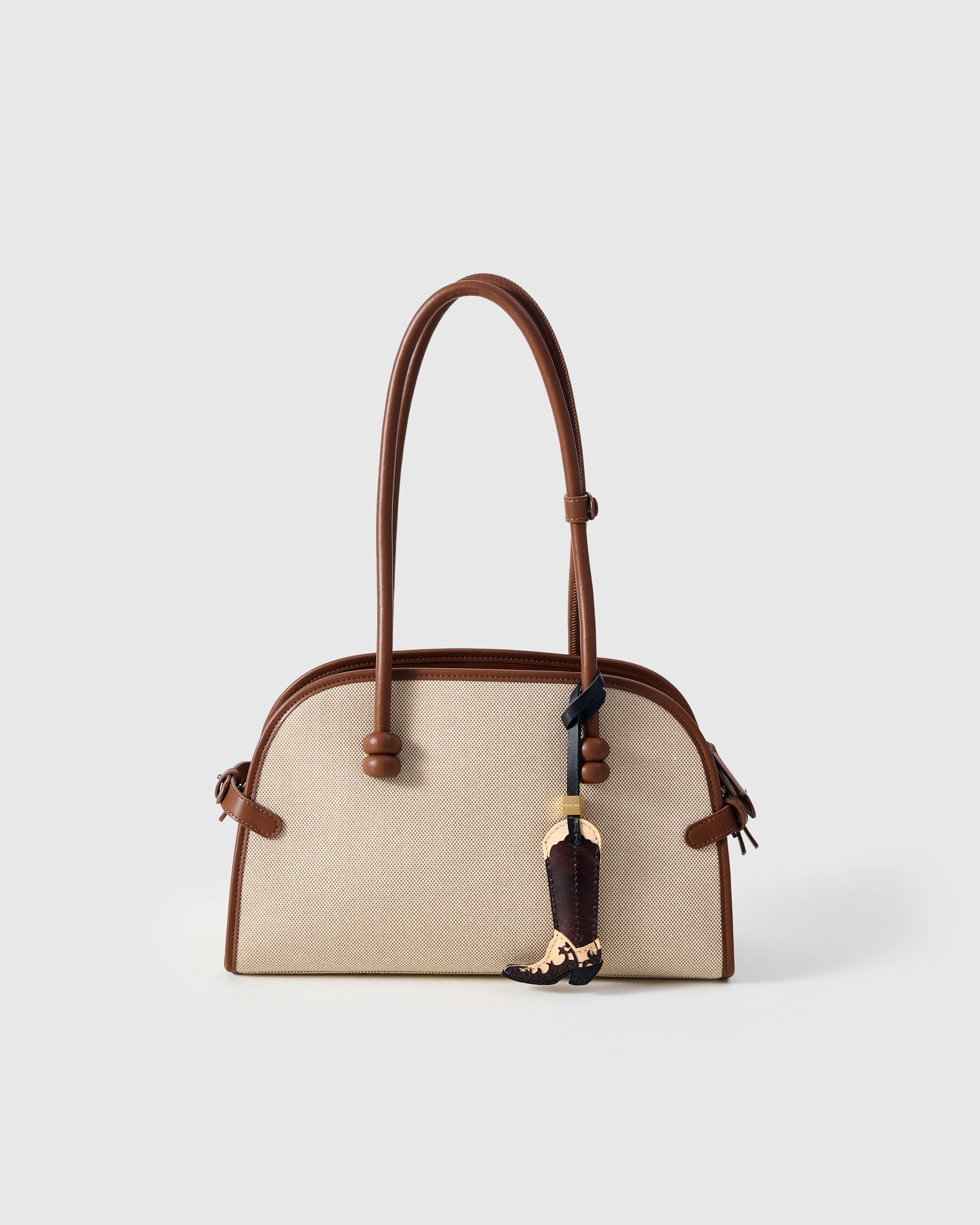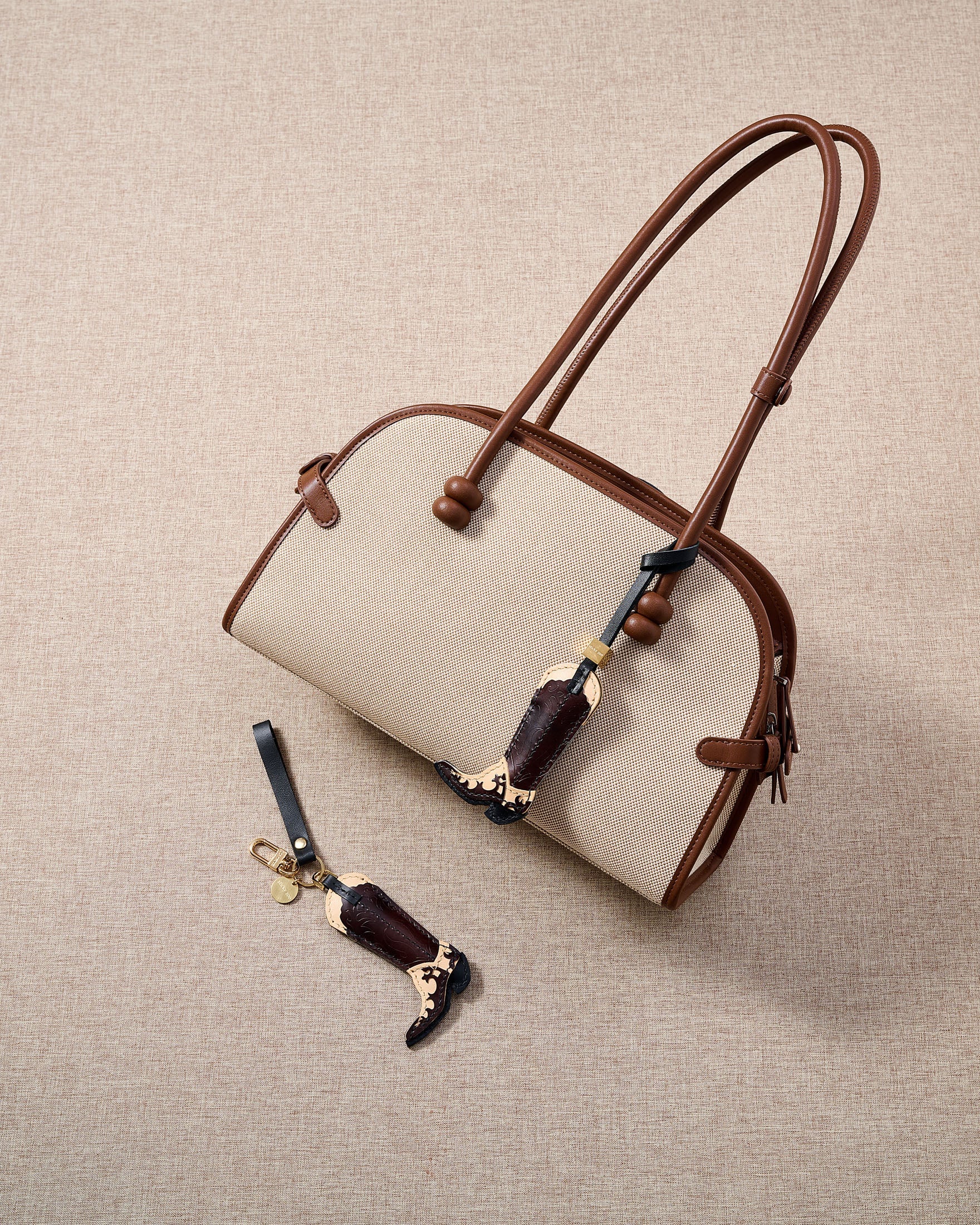 Western silhouette, after-dark allure – Deep mahogany and cream leather, softly beveled edges, and embossed scrollwork trace the curve of a sculpted toe and heel. The profile is elegant yet bold—made to sway from your bag and invite the inevitable, “Where did you get that?”