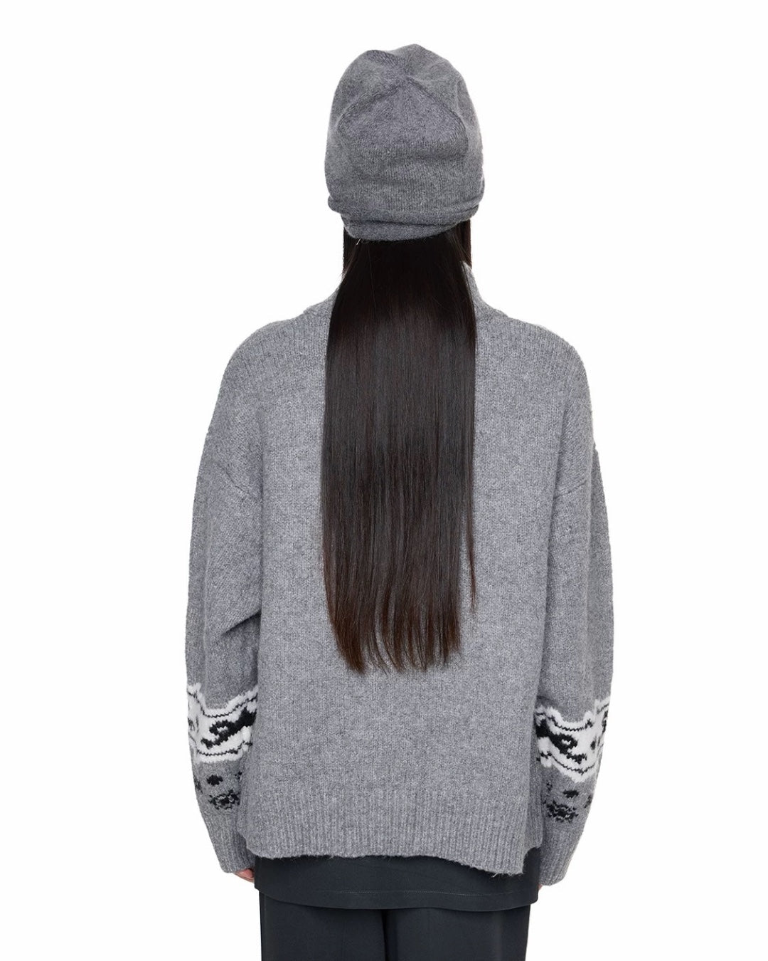 | Craftsmanship | Jacquard puppy motif; ribbed cuffs and hem; button-up closure |