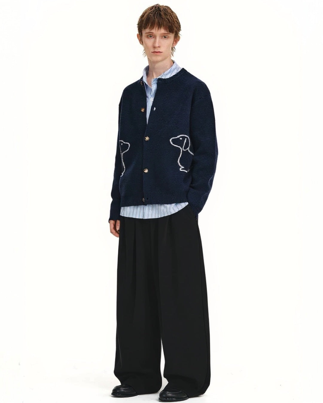 The DACHSHUND CARDIGAN from STICKY ZOO uses a fine anti-pilling wool blend to create a soft, structured drape that stays comfortable all day. Twin dachshund motifs anchor the design — clean, simple, and instantly recognizable.