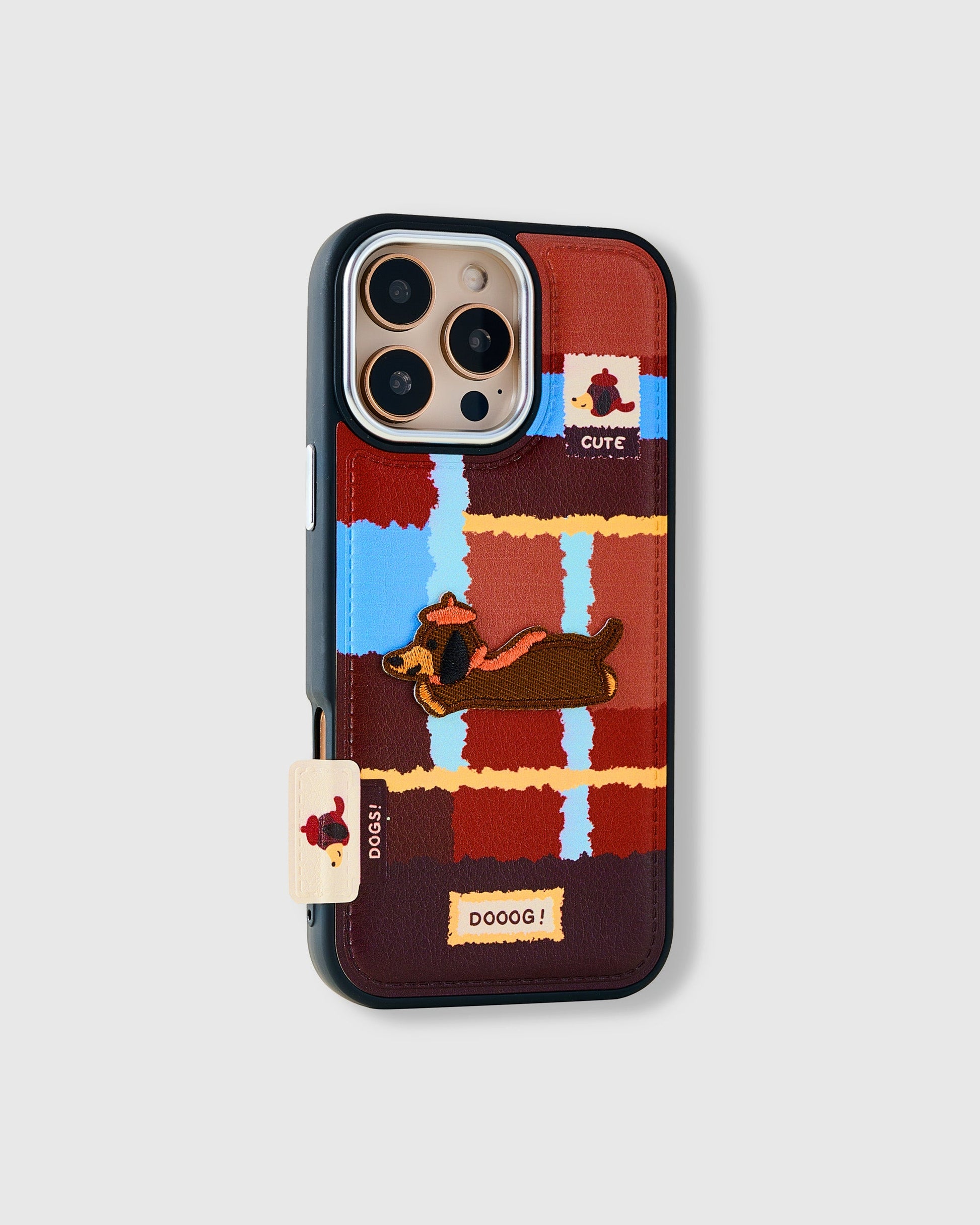 The DACHSHUND CASE from Sticky Zoo® brings retro plaid aesthetics together with adorable doggy charm. Rich burgundy, blue, and orange checks form the background, while a textured embroidered dachshund patch wearing a tiny hat becomes the star. Fun text accents like “DOGS!” and “DOOOG!” add extra character. Built with a rigid polycarbonate back, TPU bumper, microfiber lining, and a Polished stainless-steel camera ring engraved with Sticky Zoo® logo, it’s protective and stylish. Not MagSafe compatible.
