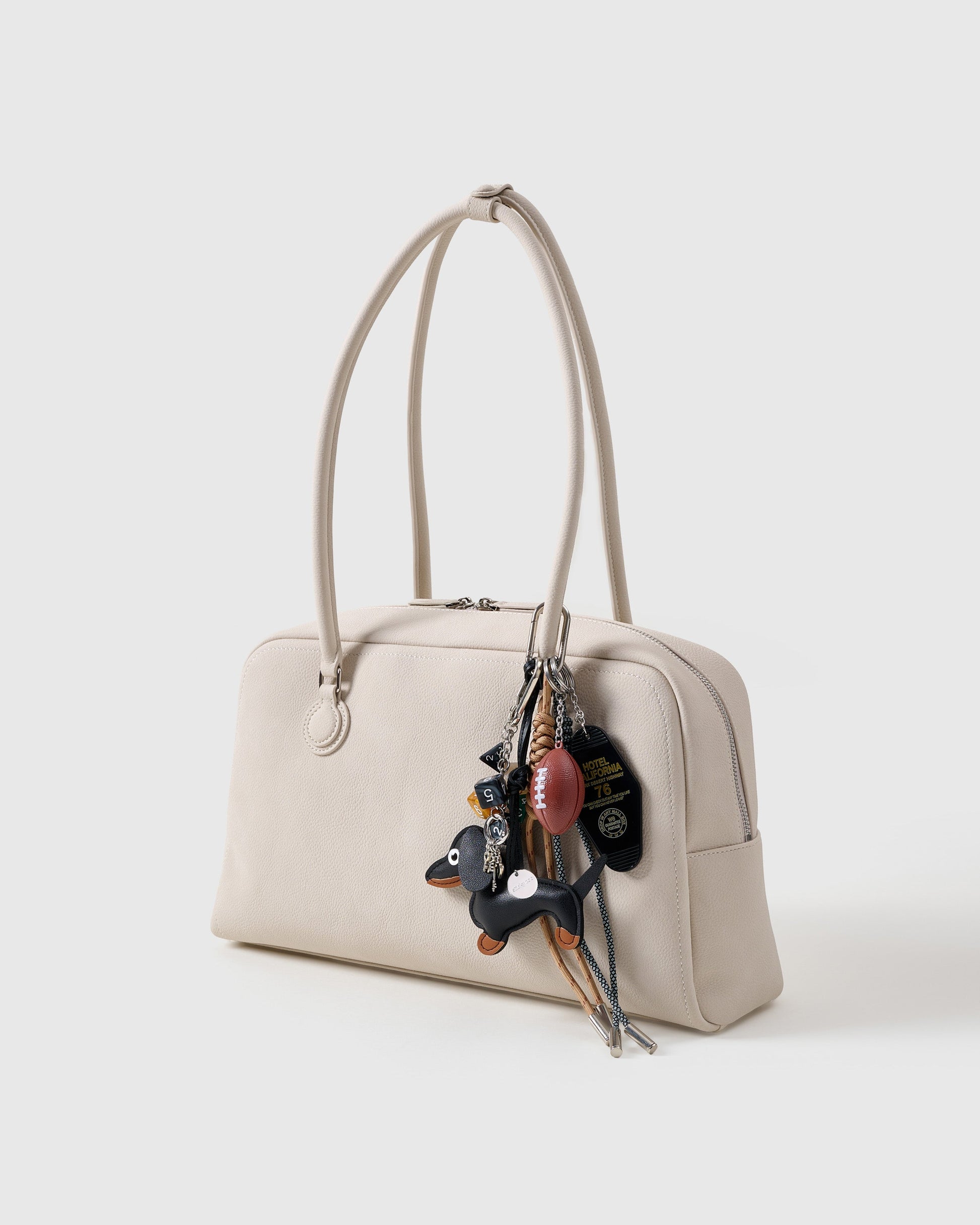 You either know the magic of a wiener dog—or you’re about to find out. The DACHSHUND DICE STACK CHARM brings bold style and playful personality wherever it hangs. Led by a striking black faux-leather dachshund, this charm stack features molten-colored gaming dice, a Hotel California key tag, and a squishy football charm. Clip it to your backpack, tote, or crossbody for an instant main-character moment.