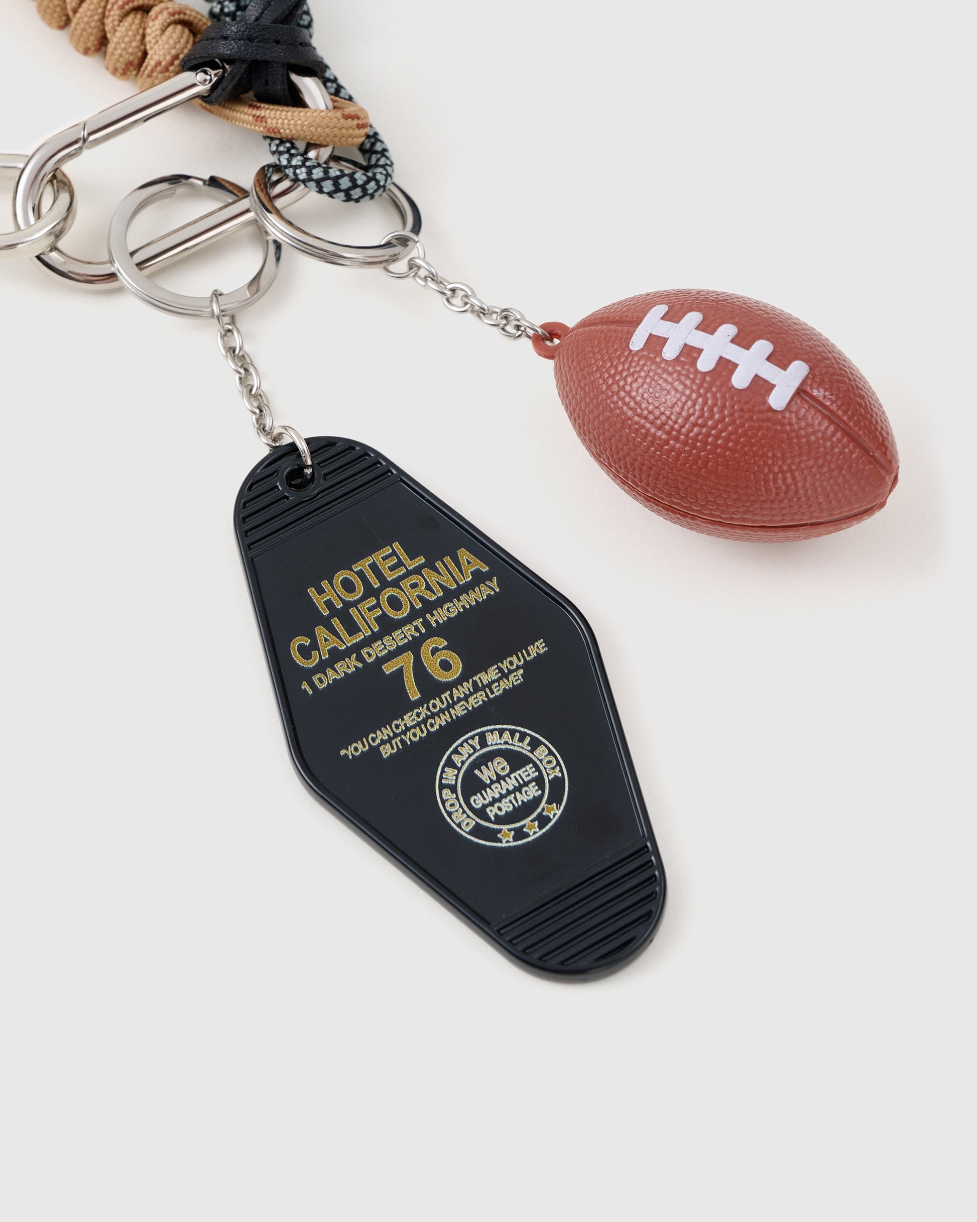 - Playful accessories: molten resin dice, rubber football, iconic Hotel California key tag