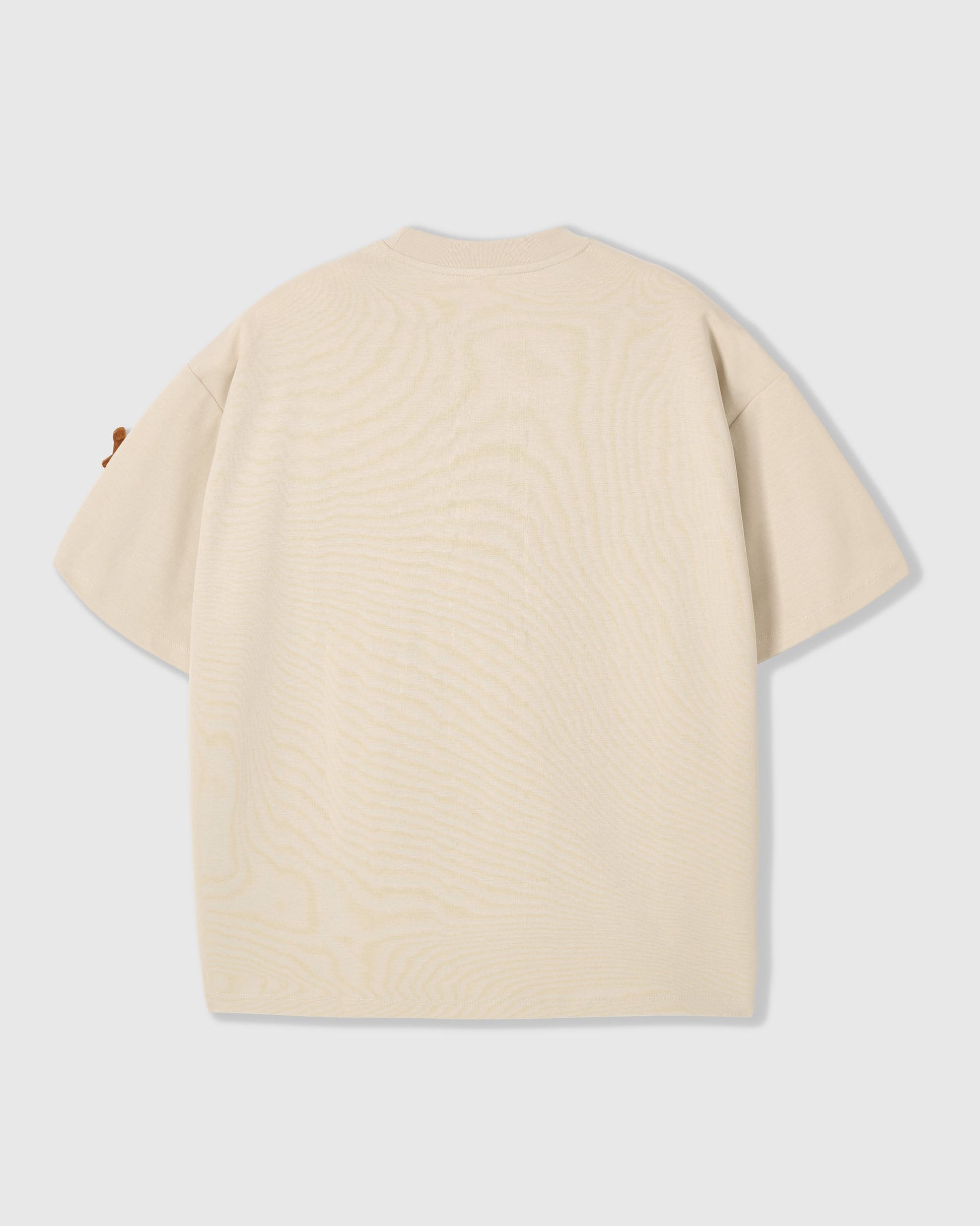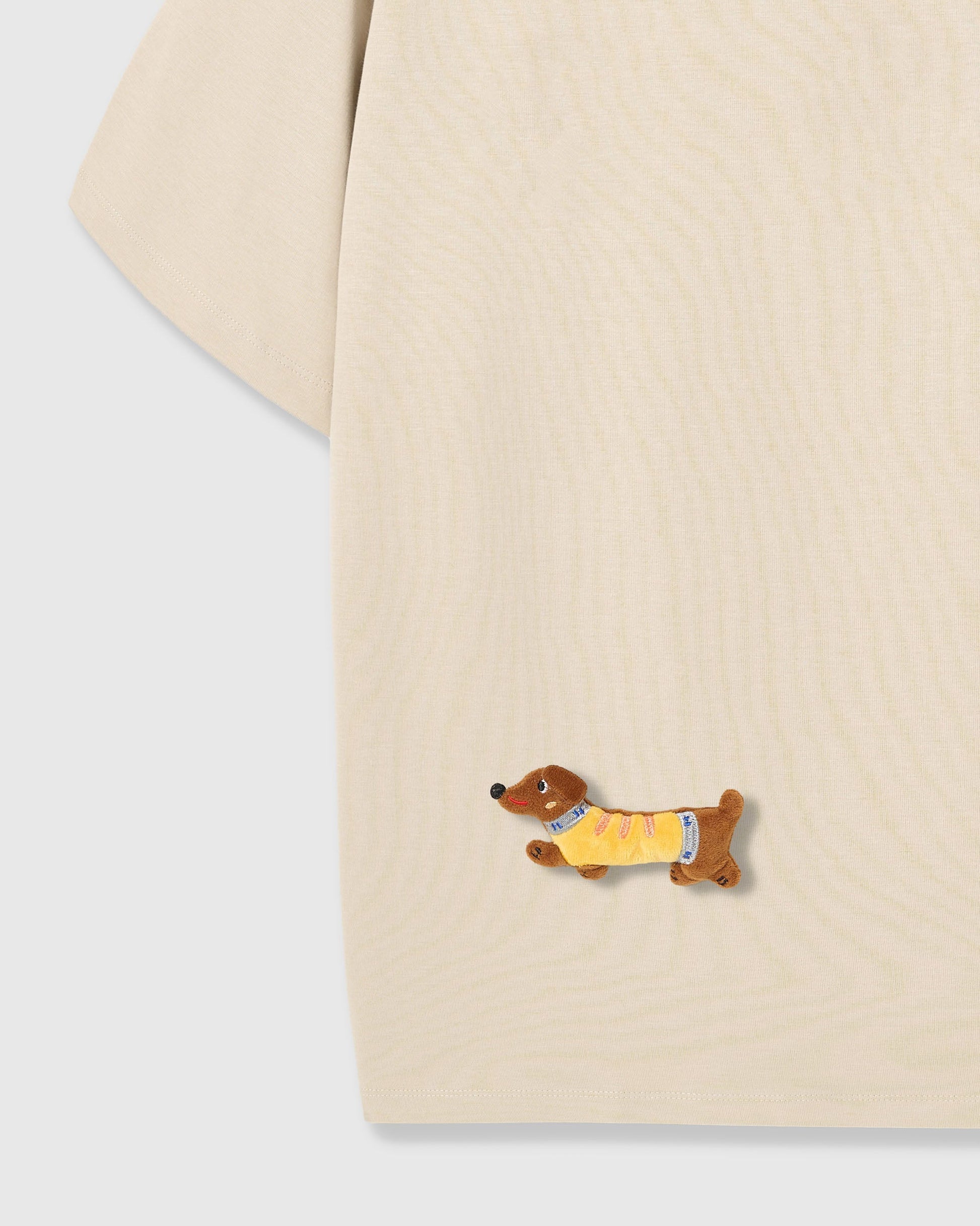 “Some T-shirts stroll. This one parades.” Three hand-sewn plush dachshunds bring joyful texture to a cool, refined silhouette—subtle from afar, irresistible up close.