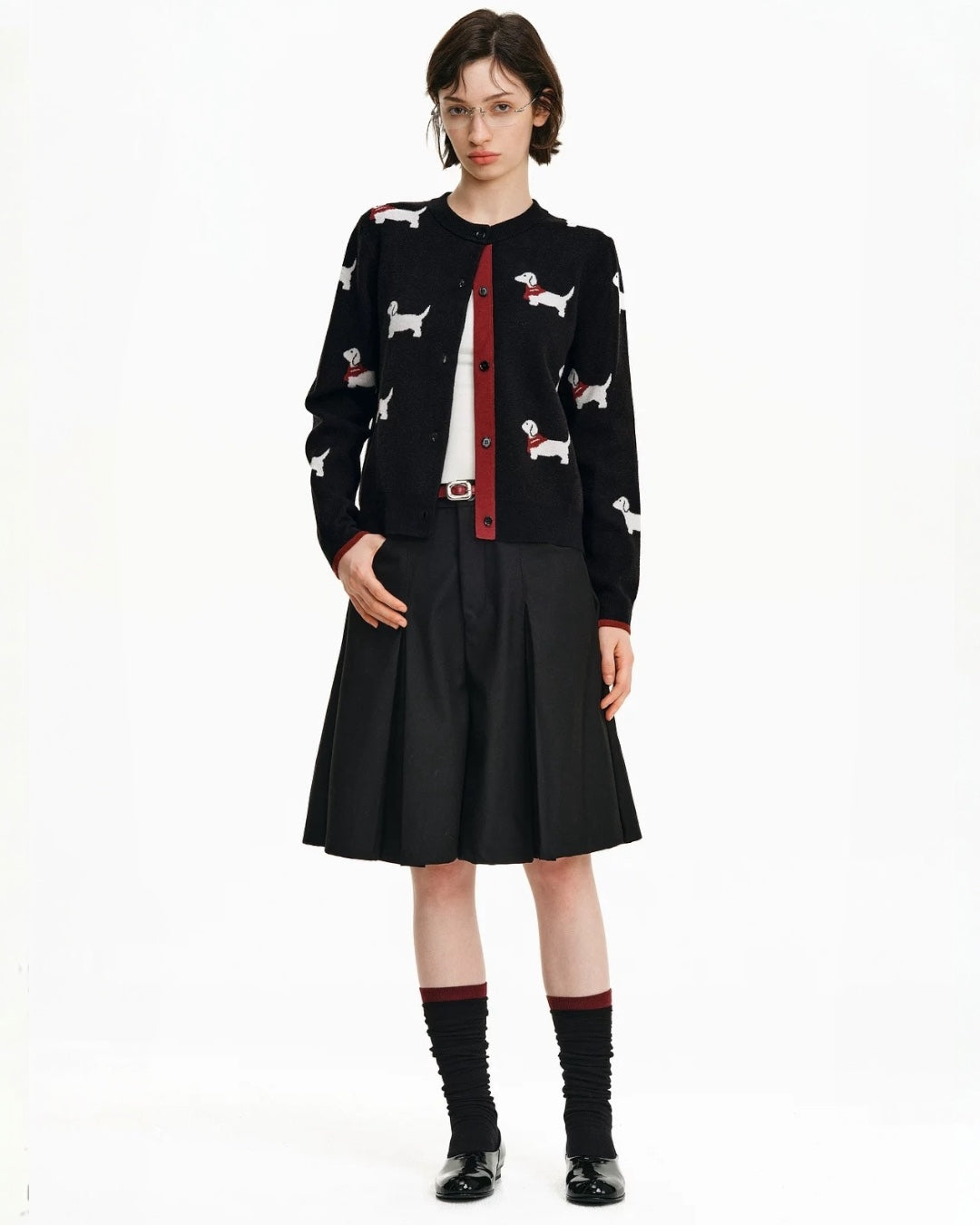 | Craftsmanship | Jacquard dachshund knit; contrast trims; button-up front |