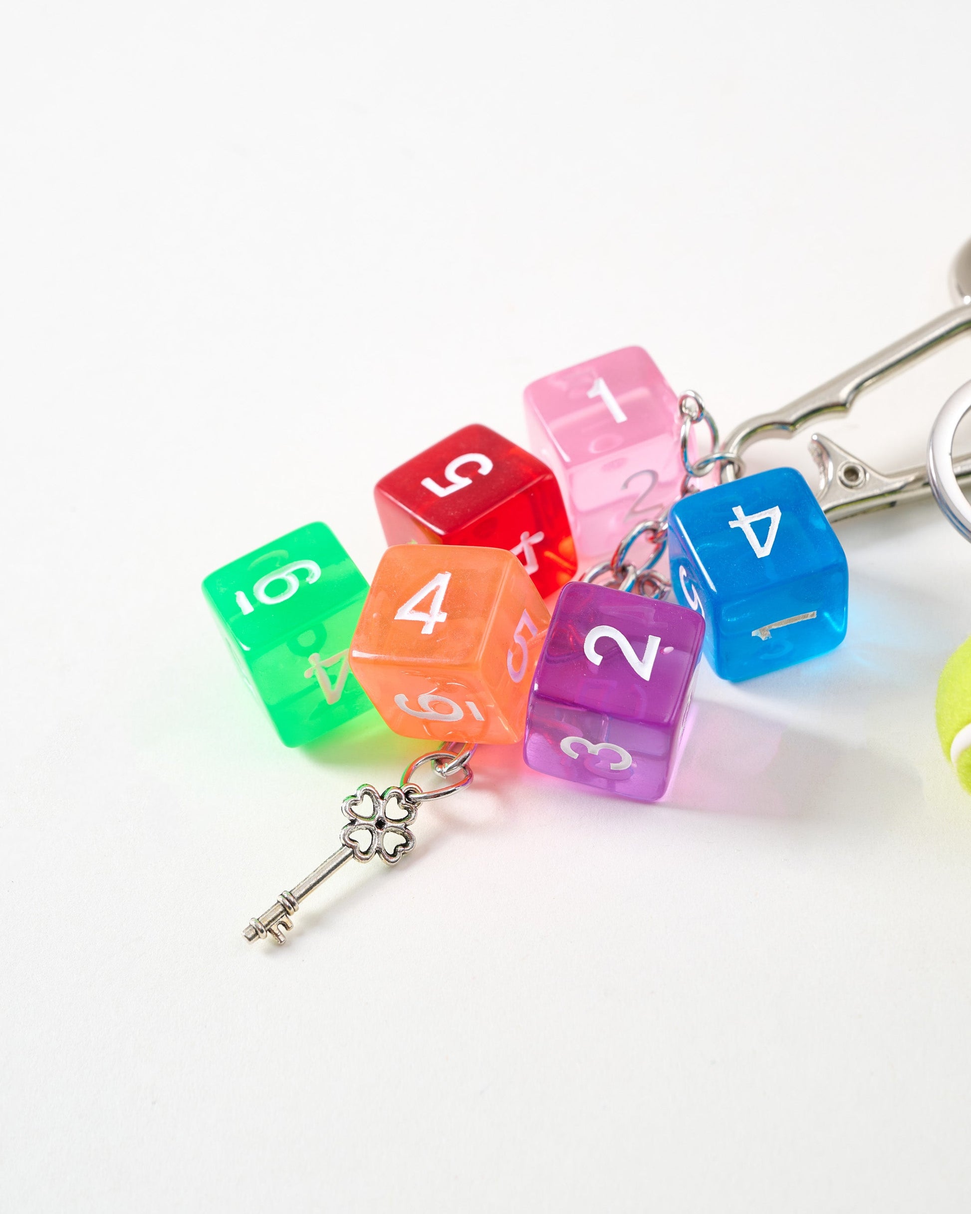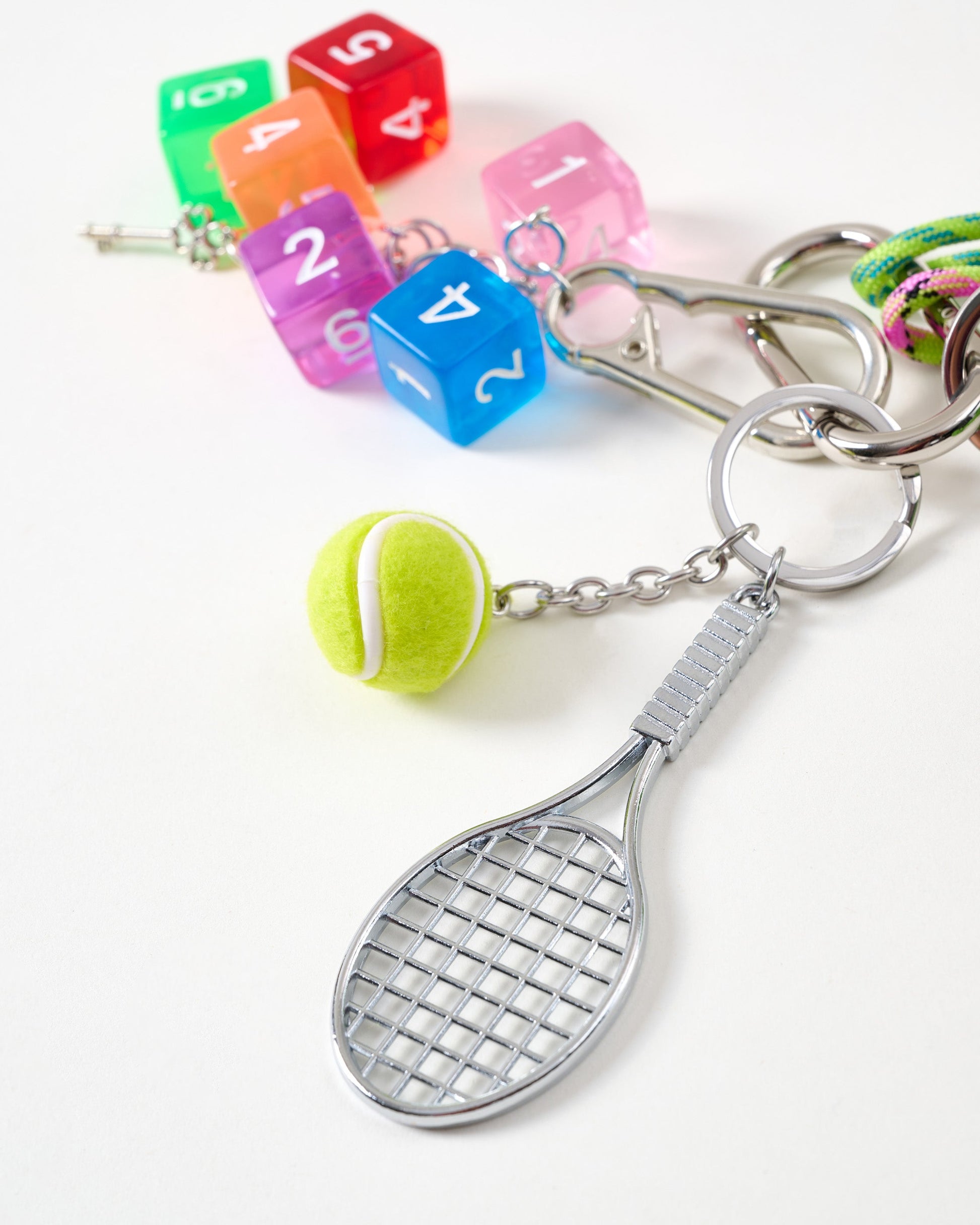 Materials: Includes colorful numbered dice, a green resin dinosaur, soft felt tennis ball, and silver-tone racket mini charm.