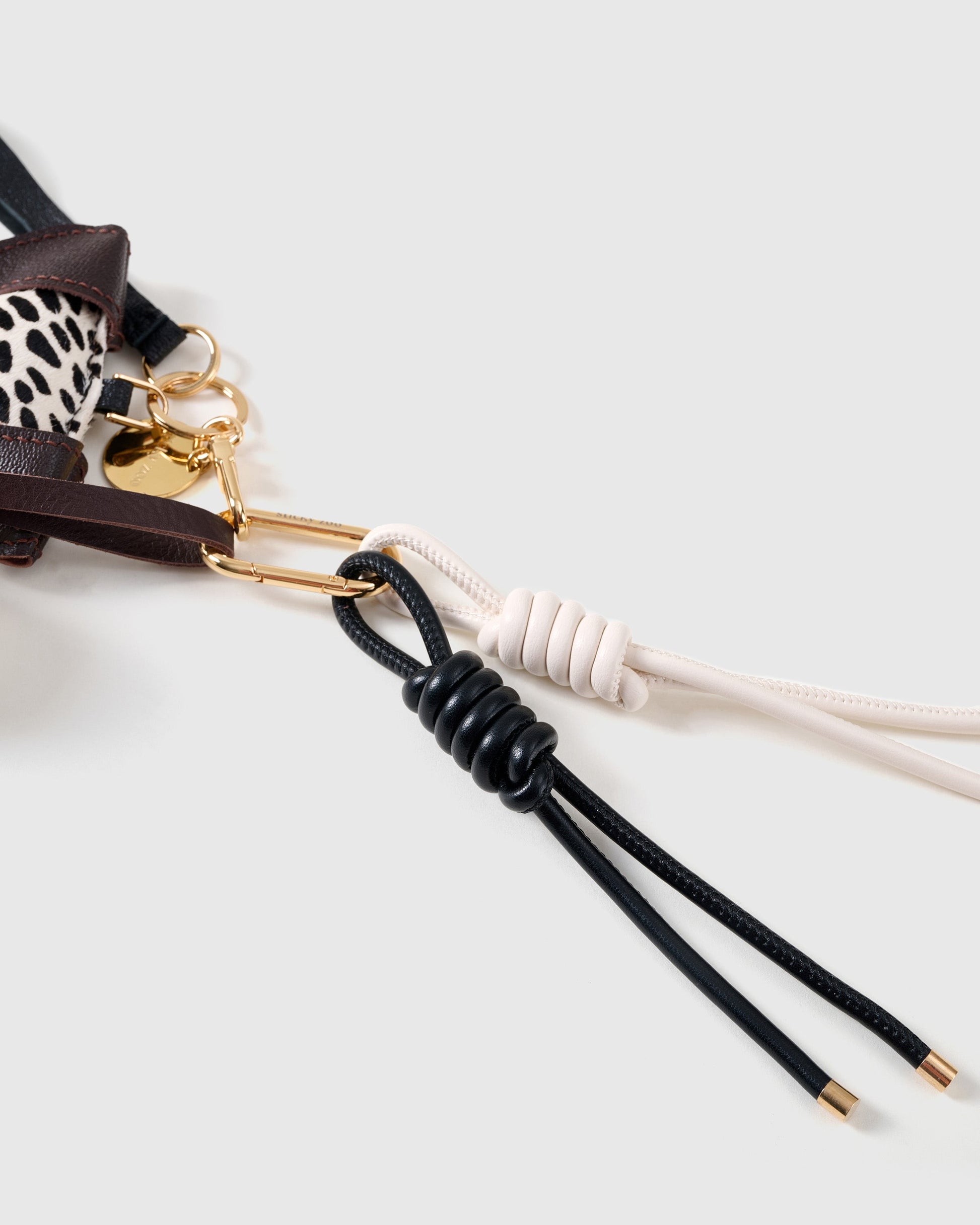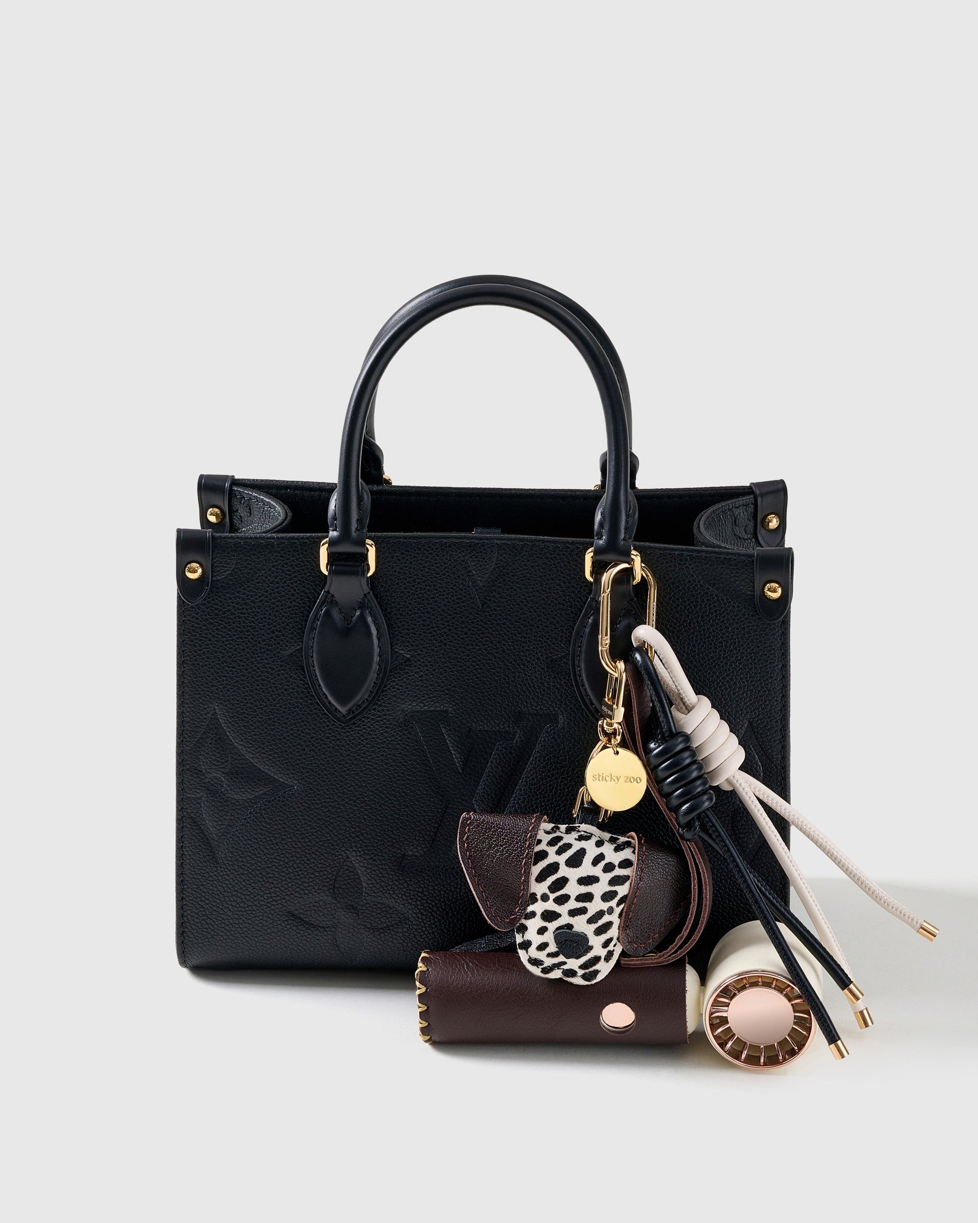 Dot Dot Charm is your monochrome moodboard in motion. Featuring a fully handmade dalmatian dog face crafted from premium goat leather and soft sheepskin ears, this collectible is stitched, sculpted, and cut by hand over 3 days. The palette? A creamy-black tone-on-tone with leather ropes in jet and chalk white, perfectly balanced by a pink power button and gold Sticky Zoo® tag.