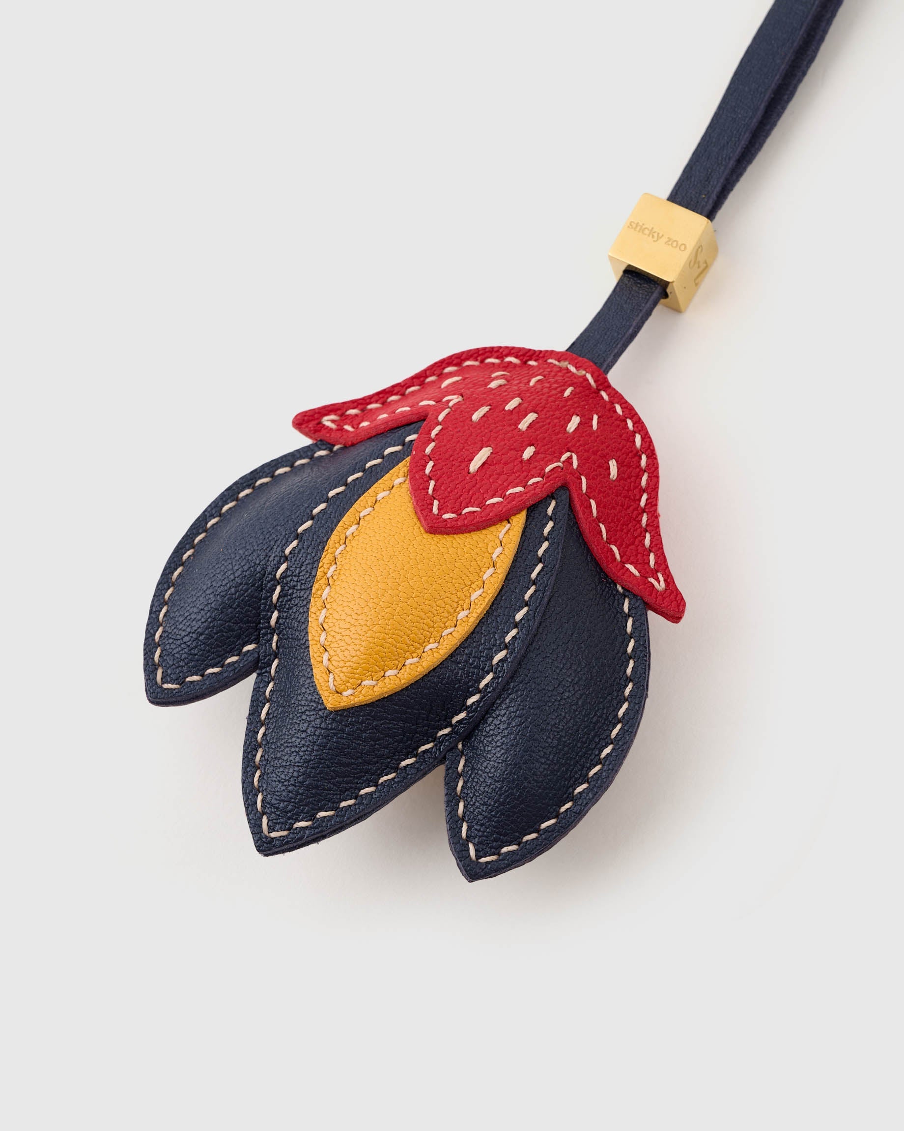Flora is all sass, shape, and sunshine. Her curved navy petals frame a golden center and top off with a red cap stitched in expressive threadwork. She's sculpted from imported ALRAN French sheepskin leather—known for its durability and vibrant grain—then paired with a navy strap or gold-plated keychain hardware for flexible styling.