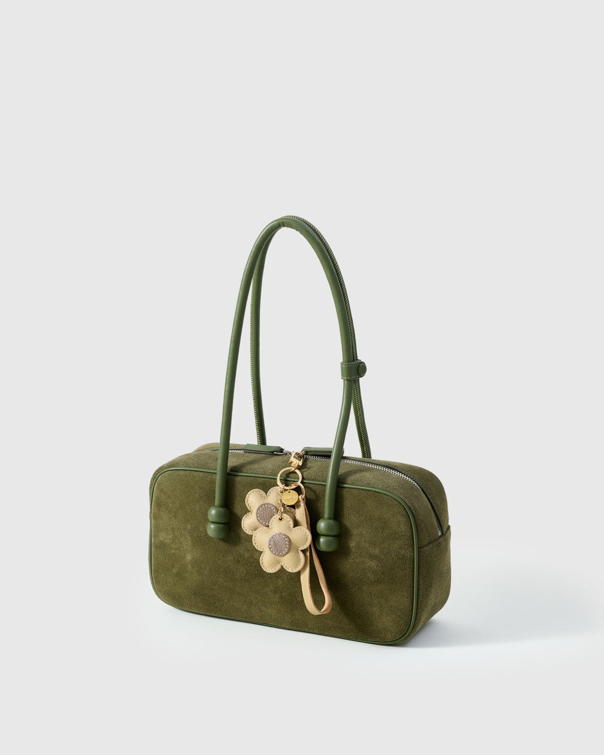 This charm is crafted by hand from supple leather, with two padded flower motifs joined by a fine gold chain. The sculpted petals and contrasting color centers create a balanced harmony between modern minimalism and nostalgic craft. Whether clipped to your favorite handbag or used as a statement keychain, it embodies effortless charm with a refined touch.