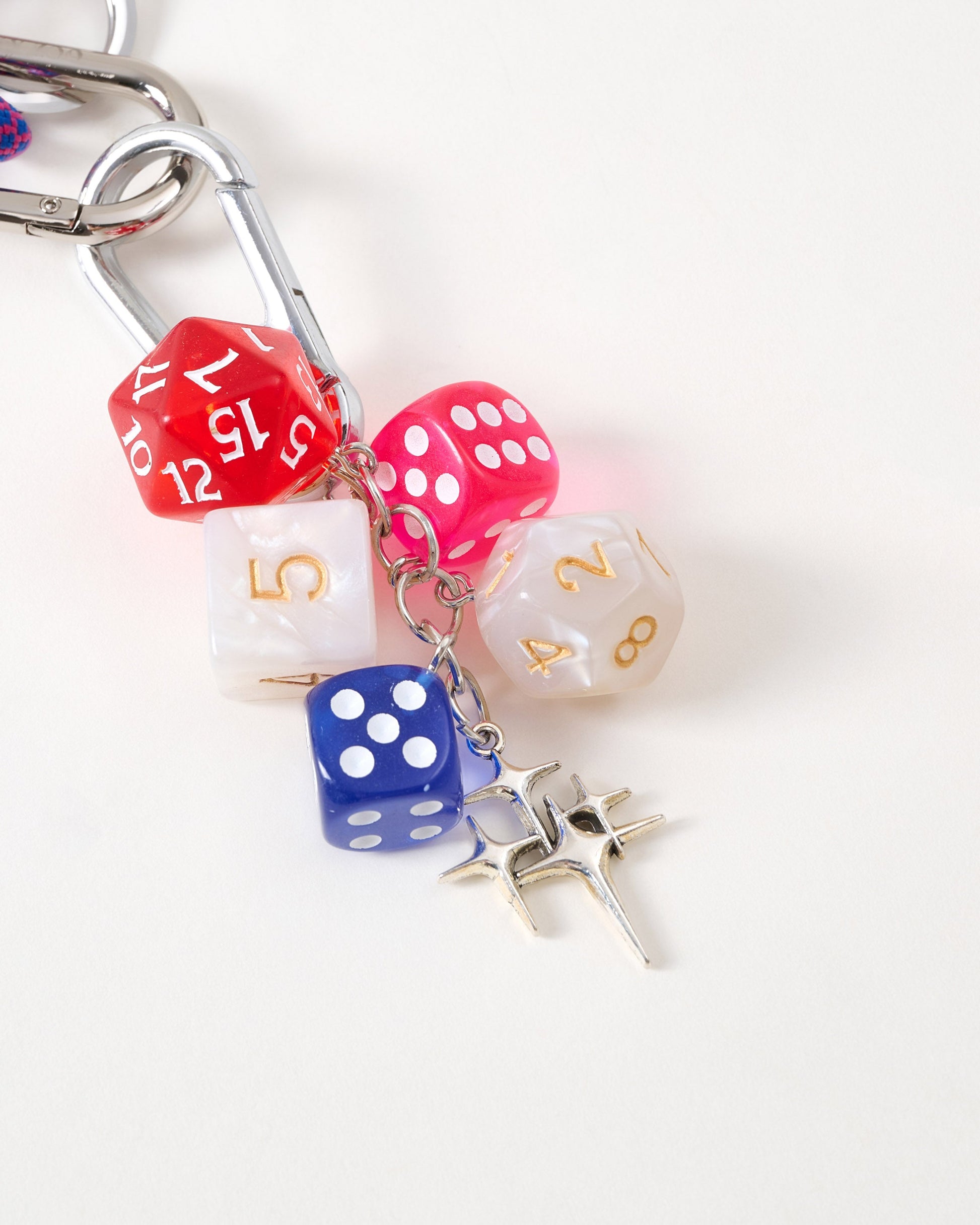 | Materials | Plastic LCD game keychain, acrylic RPG dice, vinyl minifigure, nylon cord |