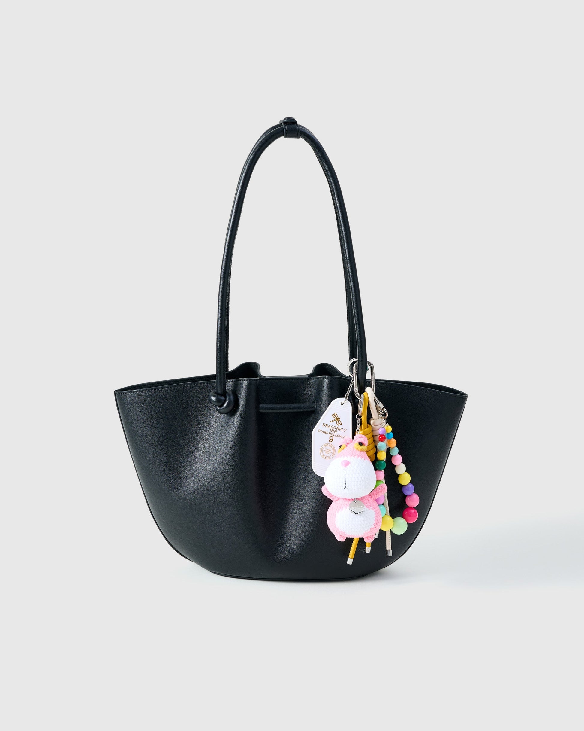 | Materials | Crochet plush hippo mascot; pastel bead bracelet loop; motel-style tag; vegan-leather rope cords (mustard & ivory); stainless-steel hardware |