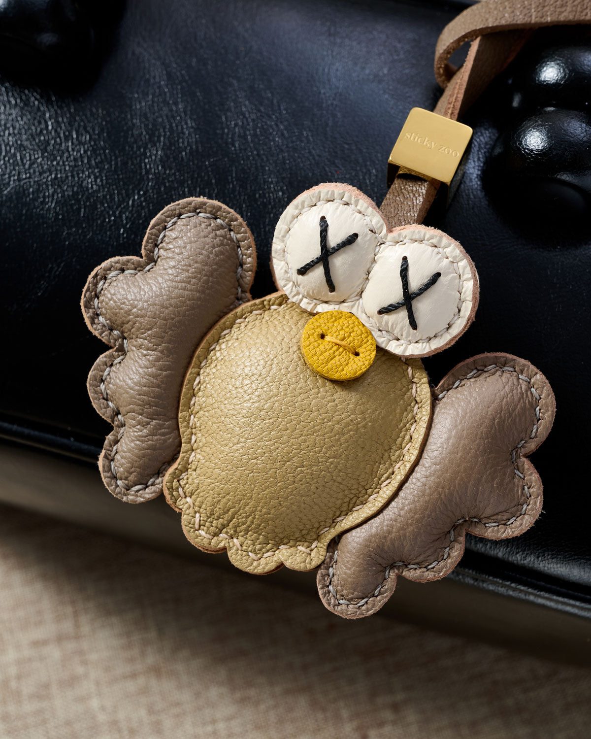 Design story: Crafted with STICKY ZOO®’s signature humor, Hootie’s sleepy-but-sassy face hides hand-sewn detailing and a layered wing construction. The deep charcoal tone contrasts with the cream eyes and yellow beak, giving it a moody charm that pairs beautifully with black, tan, or neutral-toned bags.
