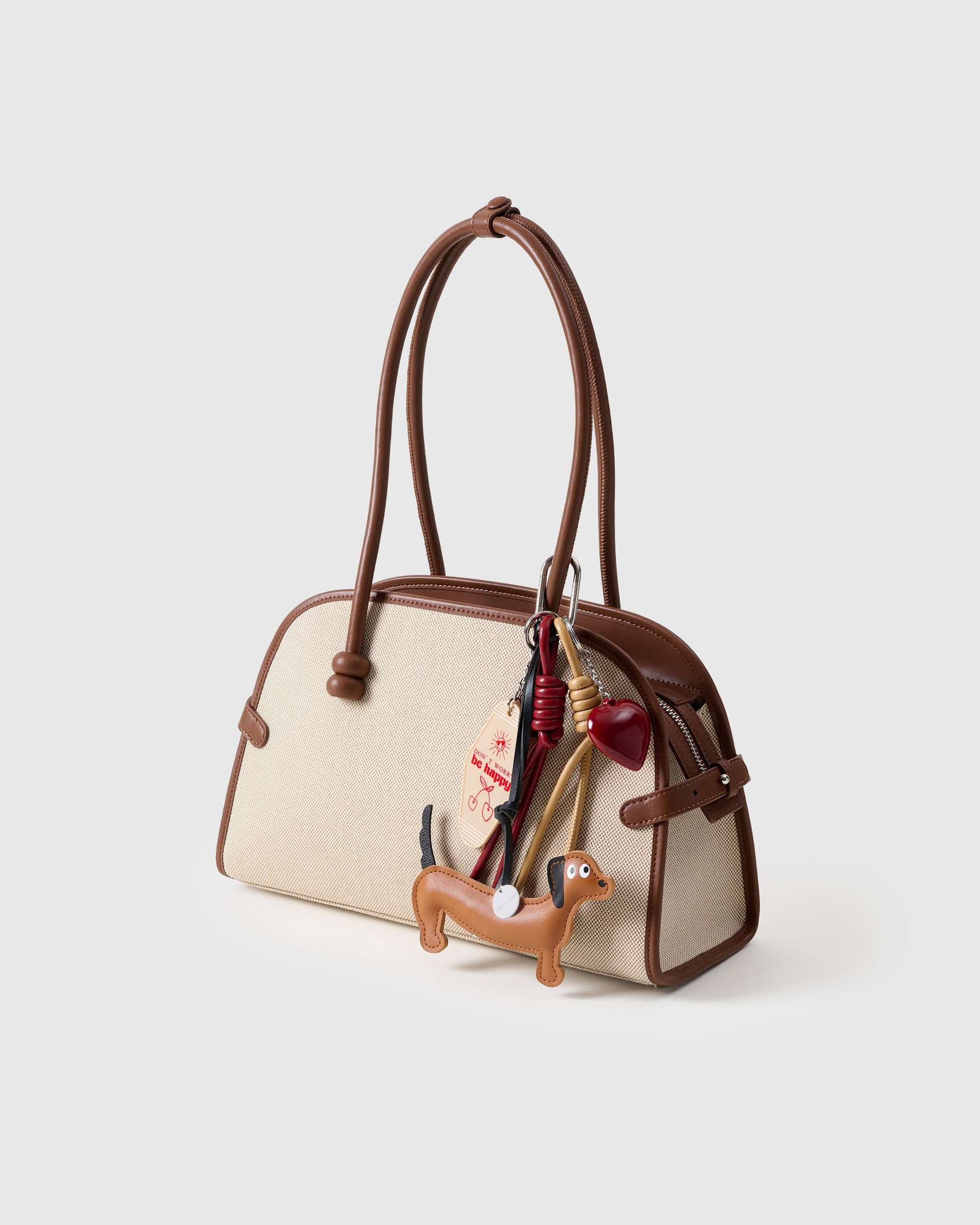 HOTDOG HUGGER™ is crafted in buttery faux leather with a snoot that points forward and a tail that means business. His glossy resin heart and cherry-red motel tag give him retro dog-park drama, while twisted leather cords in caramel + ketchup add spice to your carry.