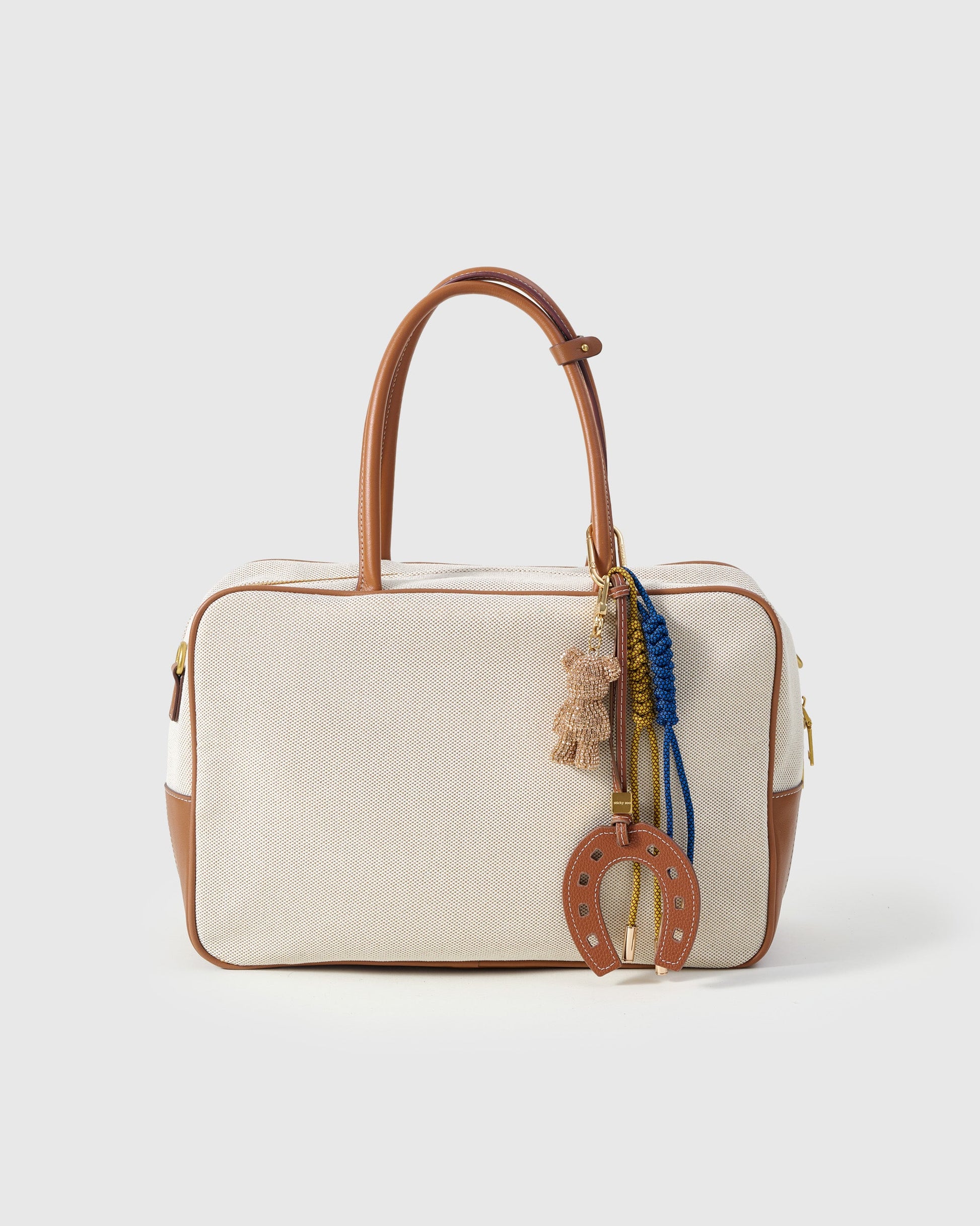 | Materials | French Alran leather horseshoe (caramel, contrast stitch); pavé crystal teddy bear charm; braided paracord tassels (royal blue & mustard); engraved Sticky Zoo® cube accent |