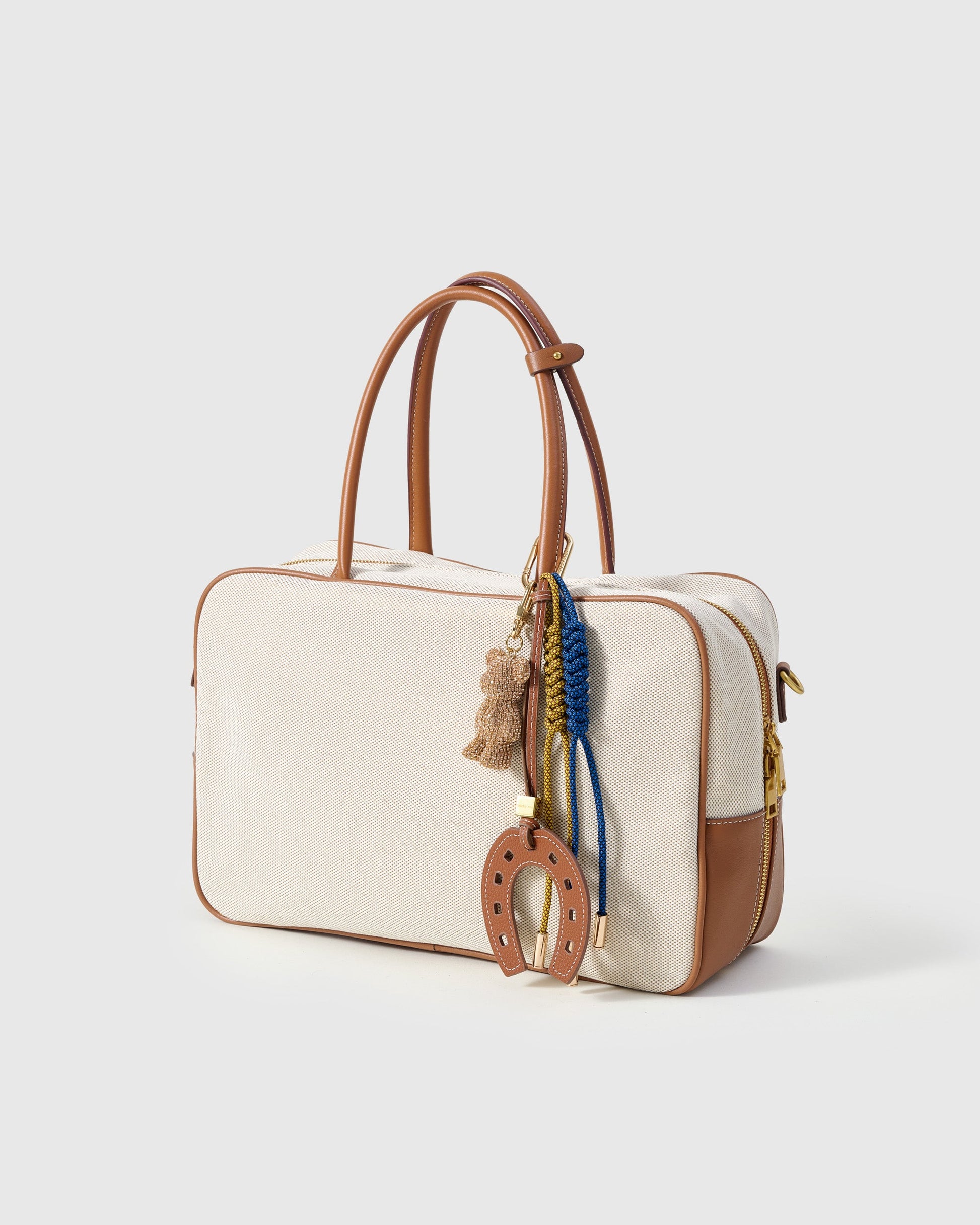The LUCKY HORSESHOE BEAR STACK CHARM from Sticky Zoo® is a chic talisman for every day. Hand-assembled with a French Alran leather horseshoe (pebble grain, contrast saddle-stitch), a champagne pavé teddy bear, and braided blue/mustard cords, it layers on handbags, keys, camera straps, and weekender totes with effortless shine—secured by a Polished 18K gold clip engraved with Sticky Zoo® logo.