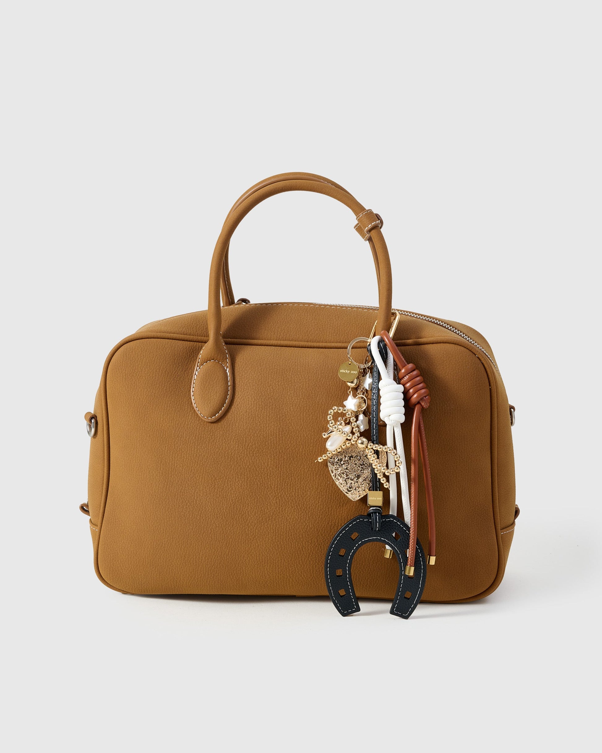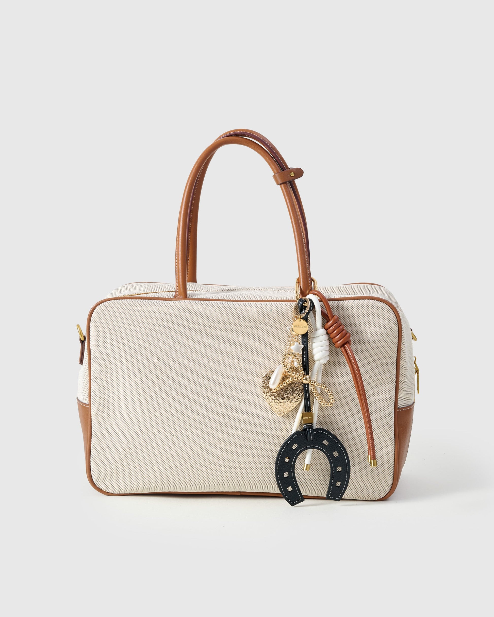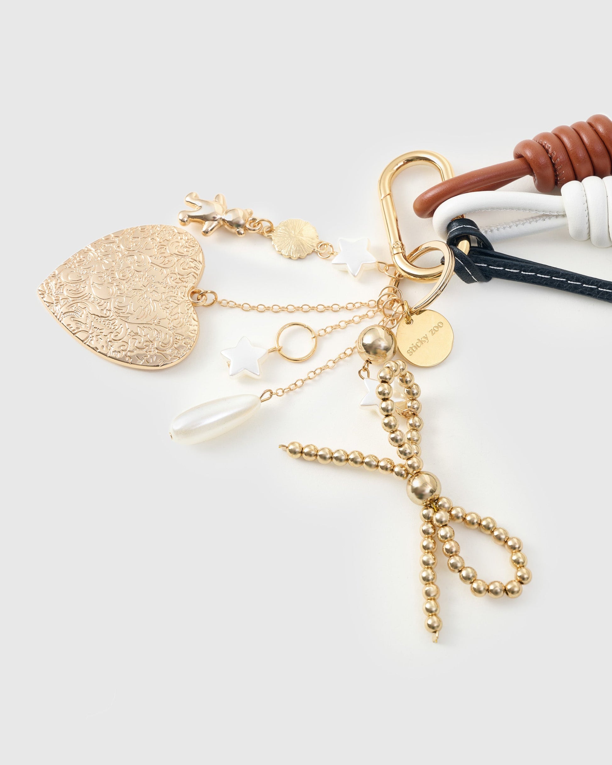 - Materials: Alran leather horseshoe, gold bow, heart & star charms, ivory & cognac cords