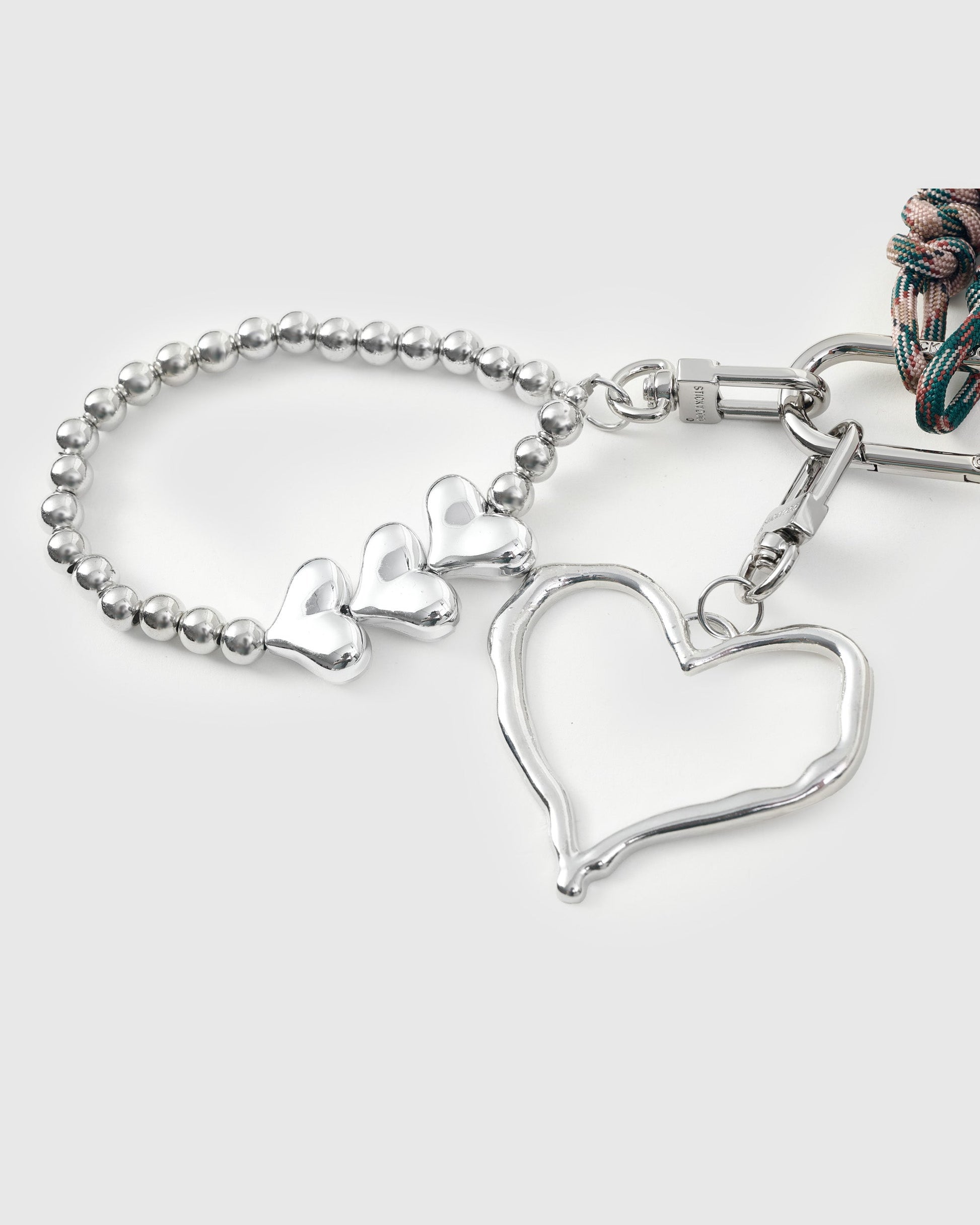 The LUCKY HORSESHOE HEART STACK CHARM from Sticky Zoo® is a chic talisman for every day. Hand-assembled with a French Alran leather horseshoe (pebble grain, contrast saddle-stitch), a silver open-heart charm, a silver beaded mini-bracelet with triple hearts, and braided paracord tassels in forest/rose mix—secured by a Polished stainless steel clip engraved with Sticky Zoo® logo. Layer it on handbags, keys, camera straps, and weekender totes.