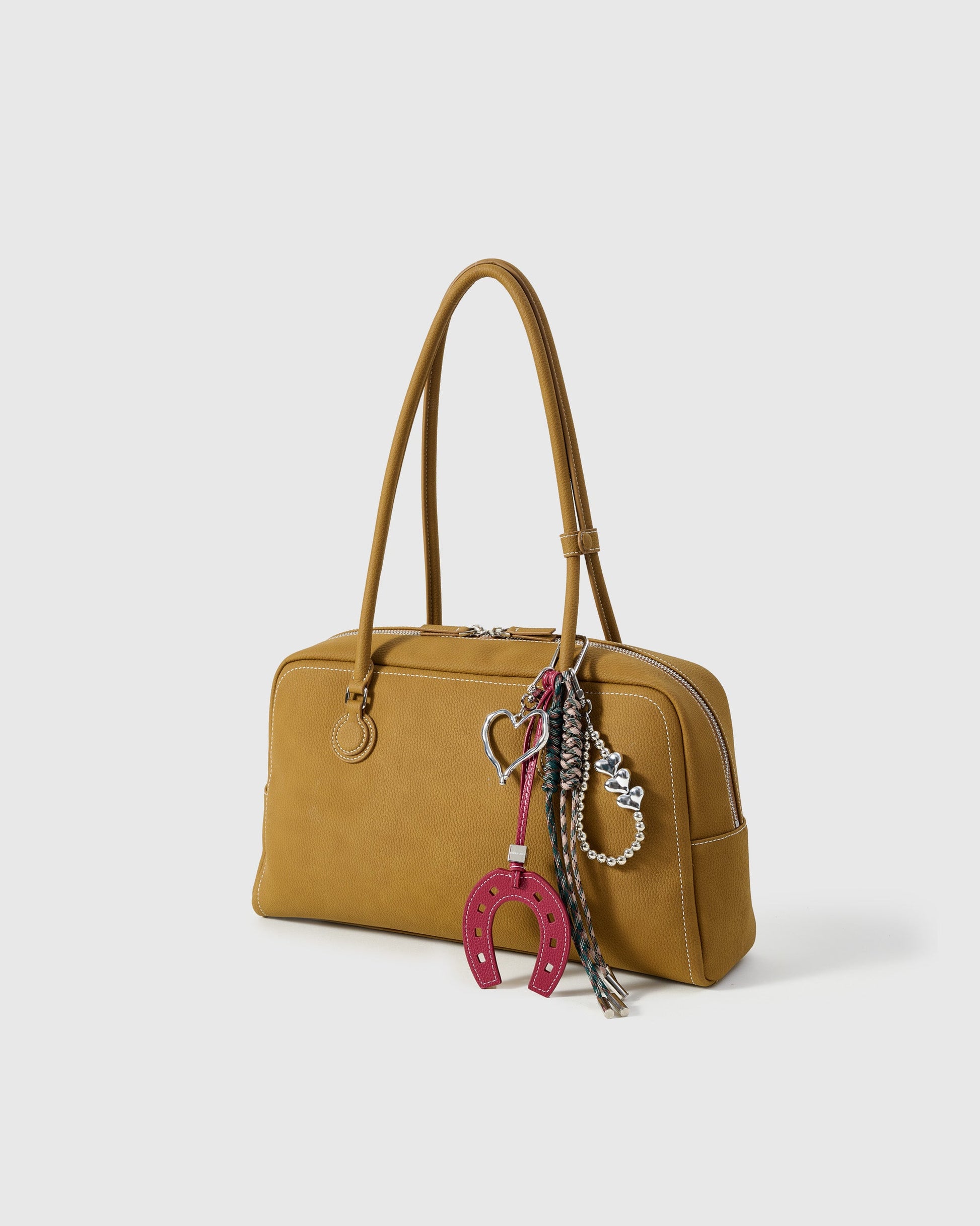 Good luck, clipped. A magenta leather horseshoe and sculptural silver hearts invite fortune and help shake off bad vibes—one clip, styled and protected.