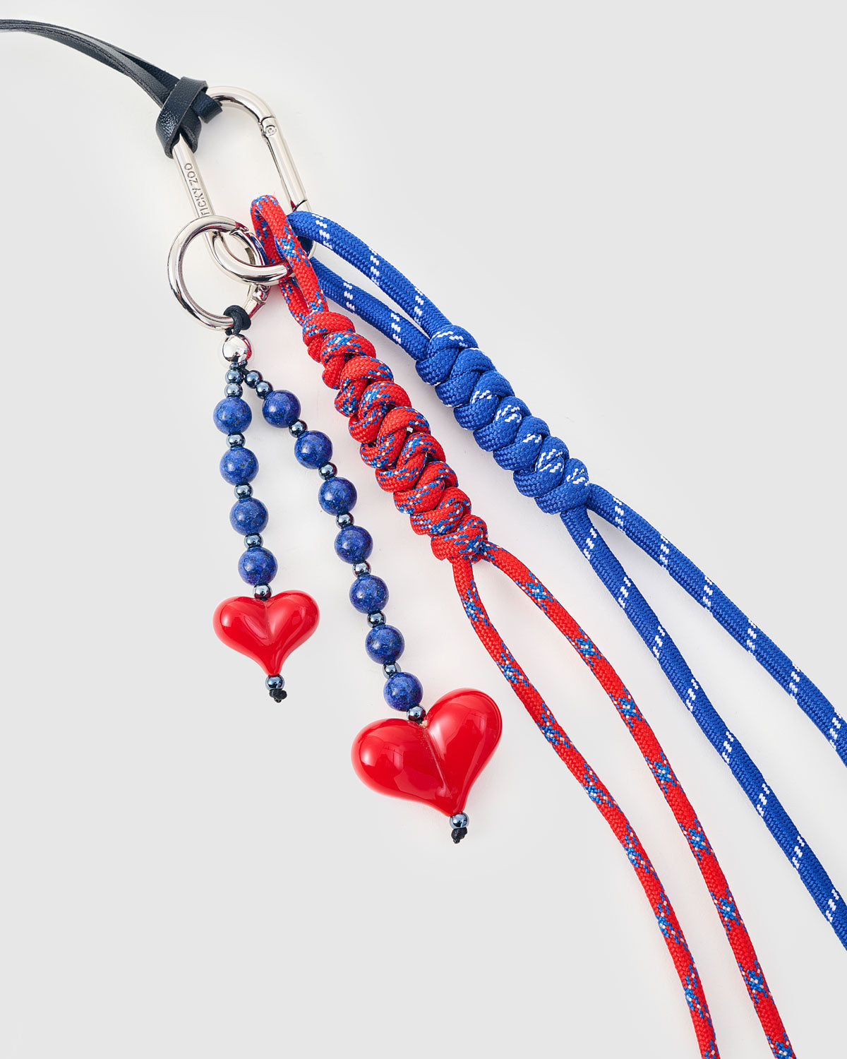 - Materials: Vegan-leather cat mascot, resin heart beads, blue stones, paracord tassels