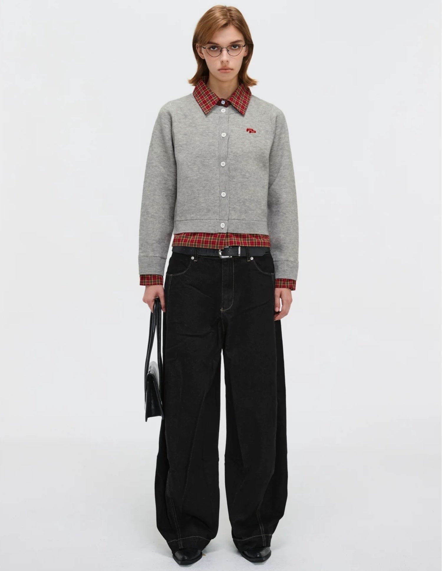 - Plaid collar + cuff contrast → built-in layered effect