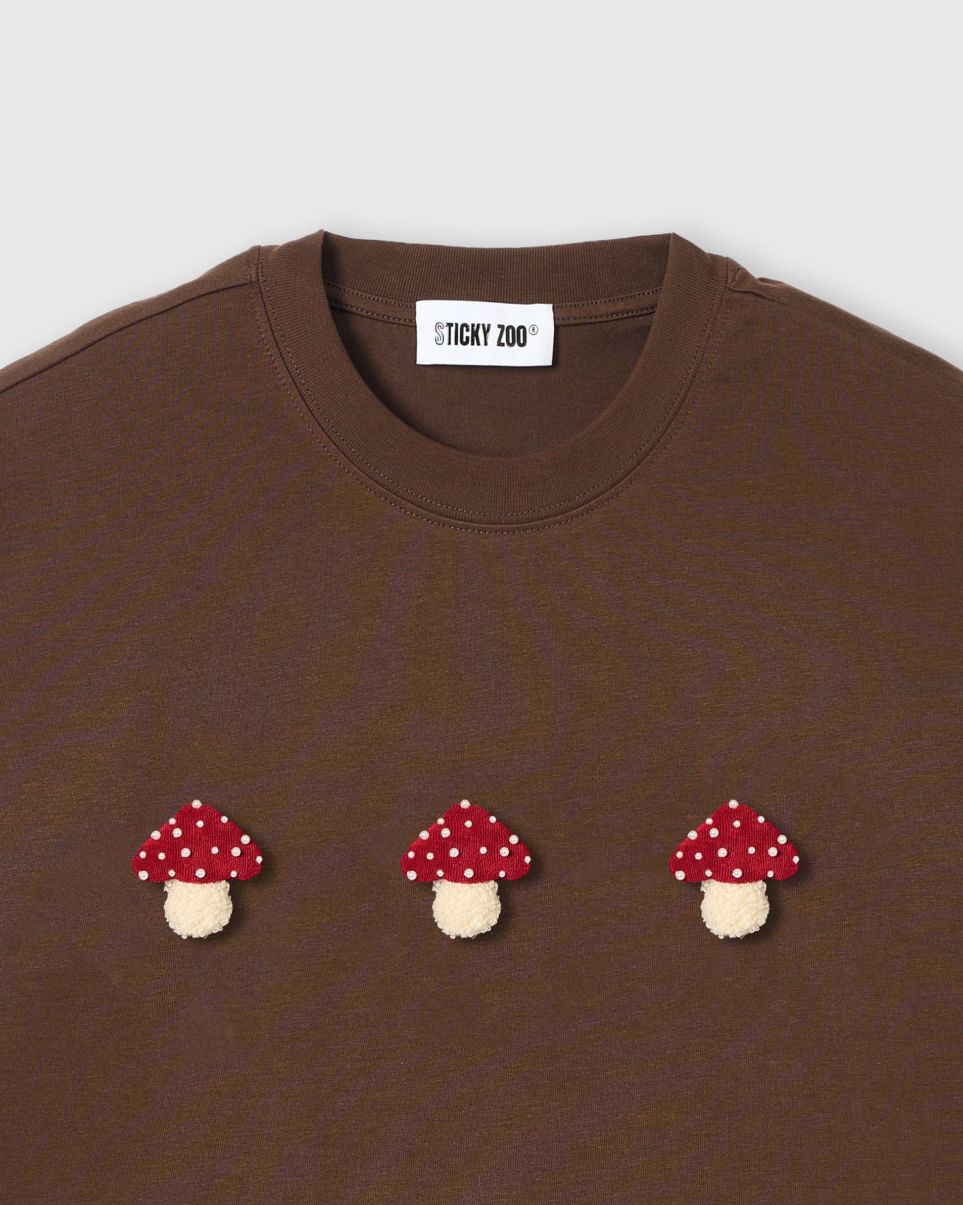 “Playful luxury, stitched to smile.” Three plush mushrooms, hand-sewn one by one, turn a simple T-shirt into your most complimented moment.