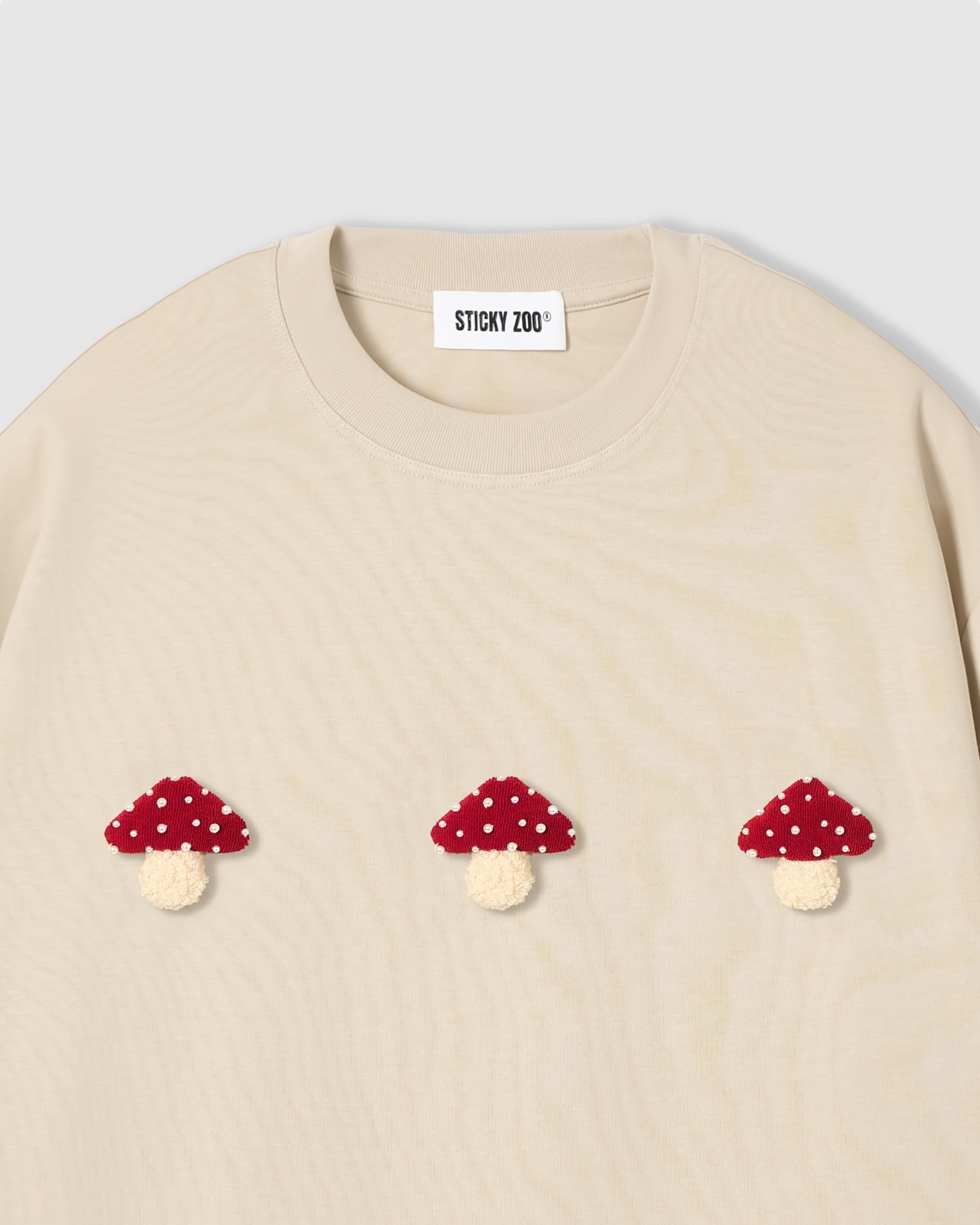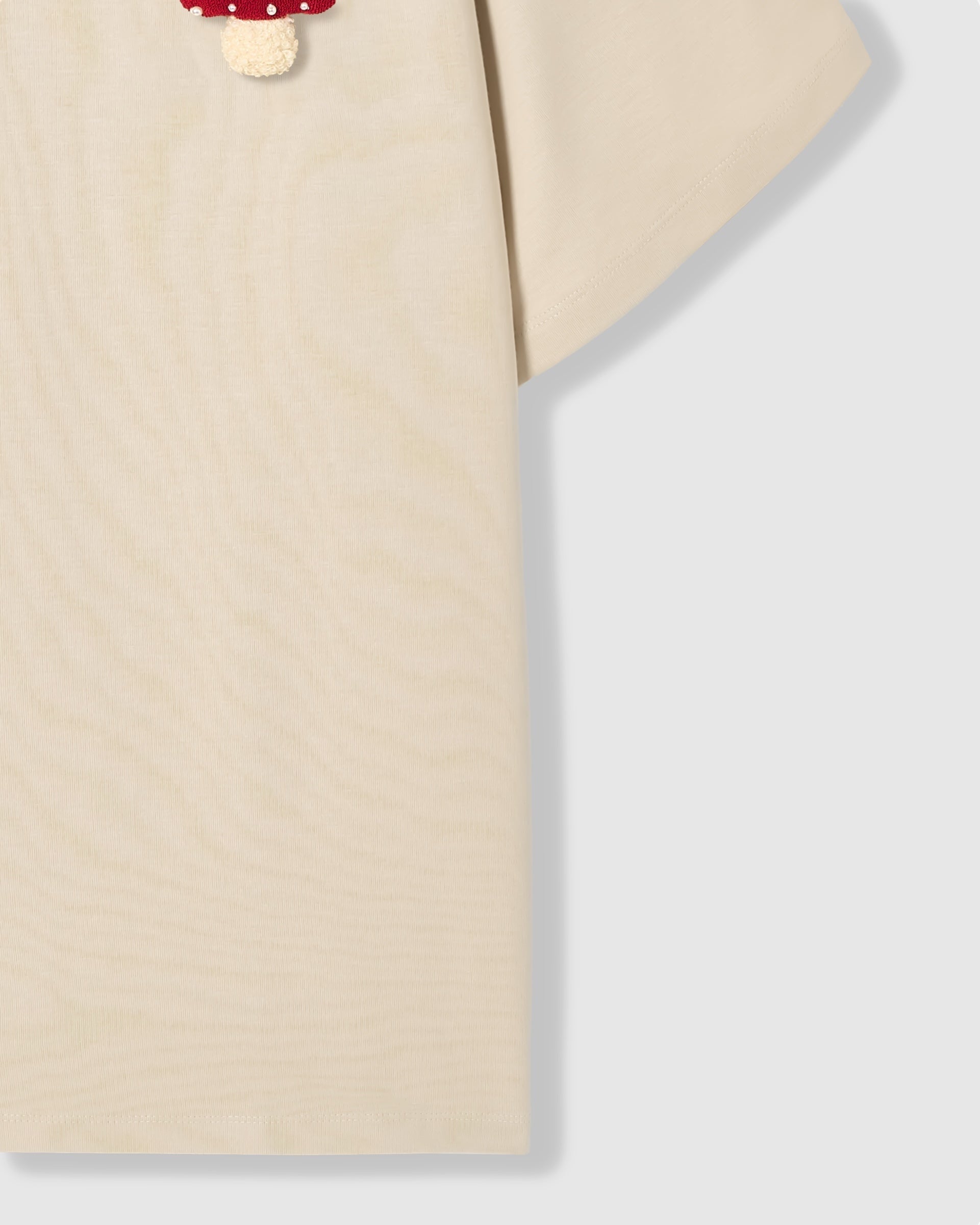 “Playful luxury, stitched to smile.” Three plush mushrooms, hand-sewn one by one, turn a simple T-shirt into your most complimented moment.