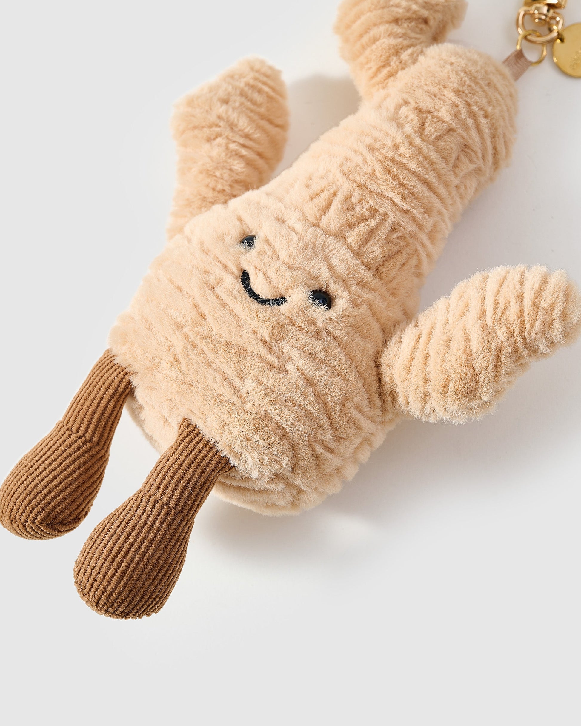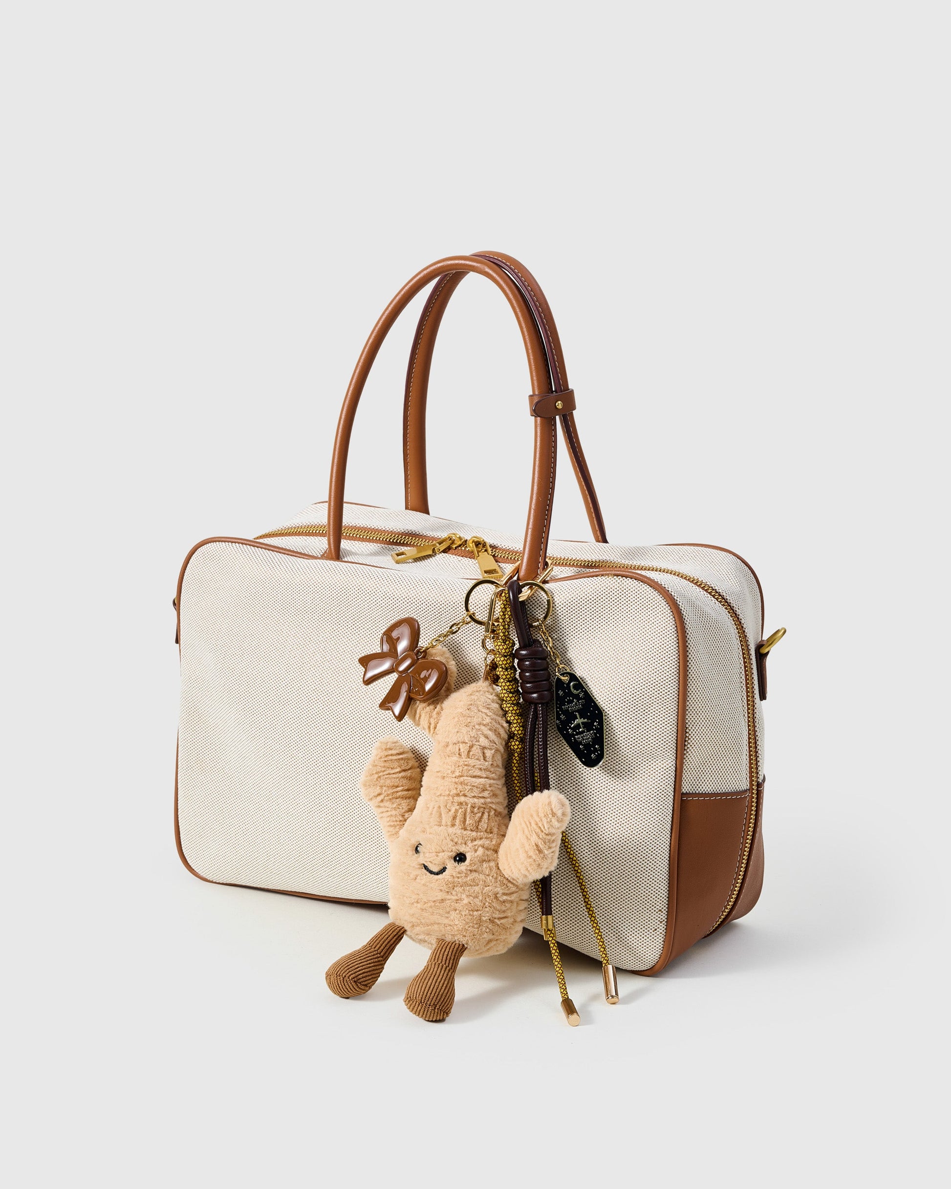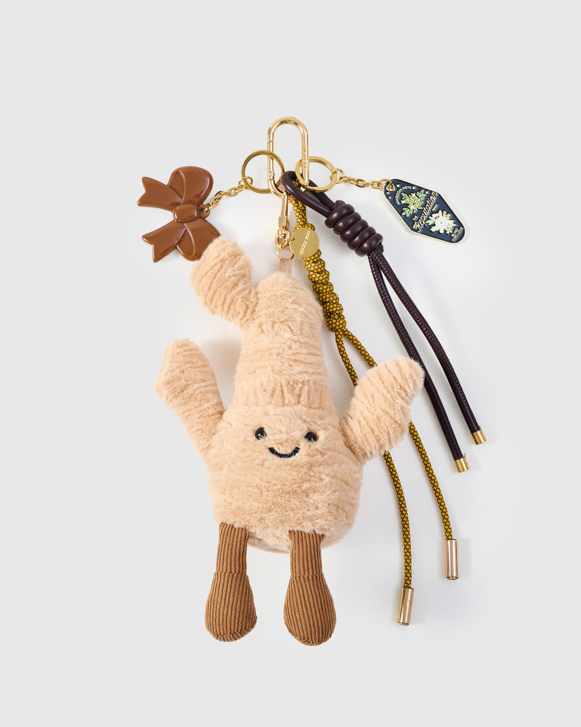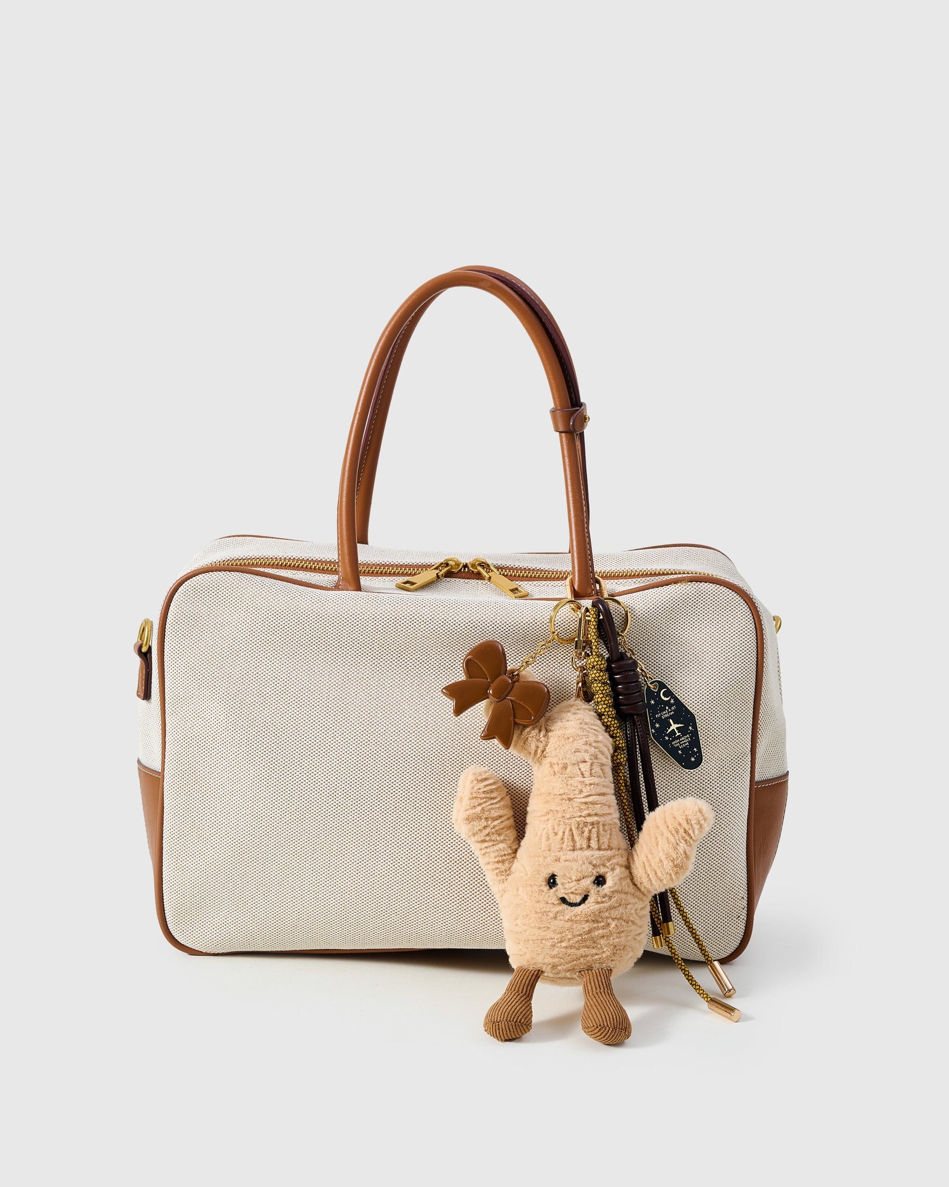 - Materials: Plush croissant, glossy bow, enamel travel tag, vegan-leather tassels