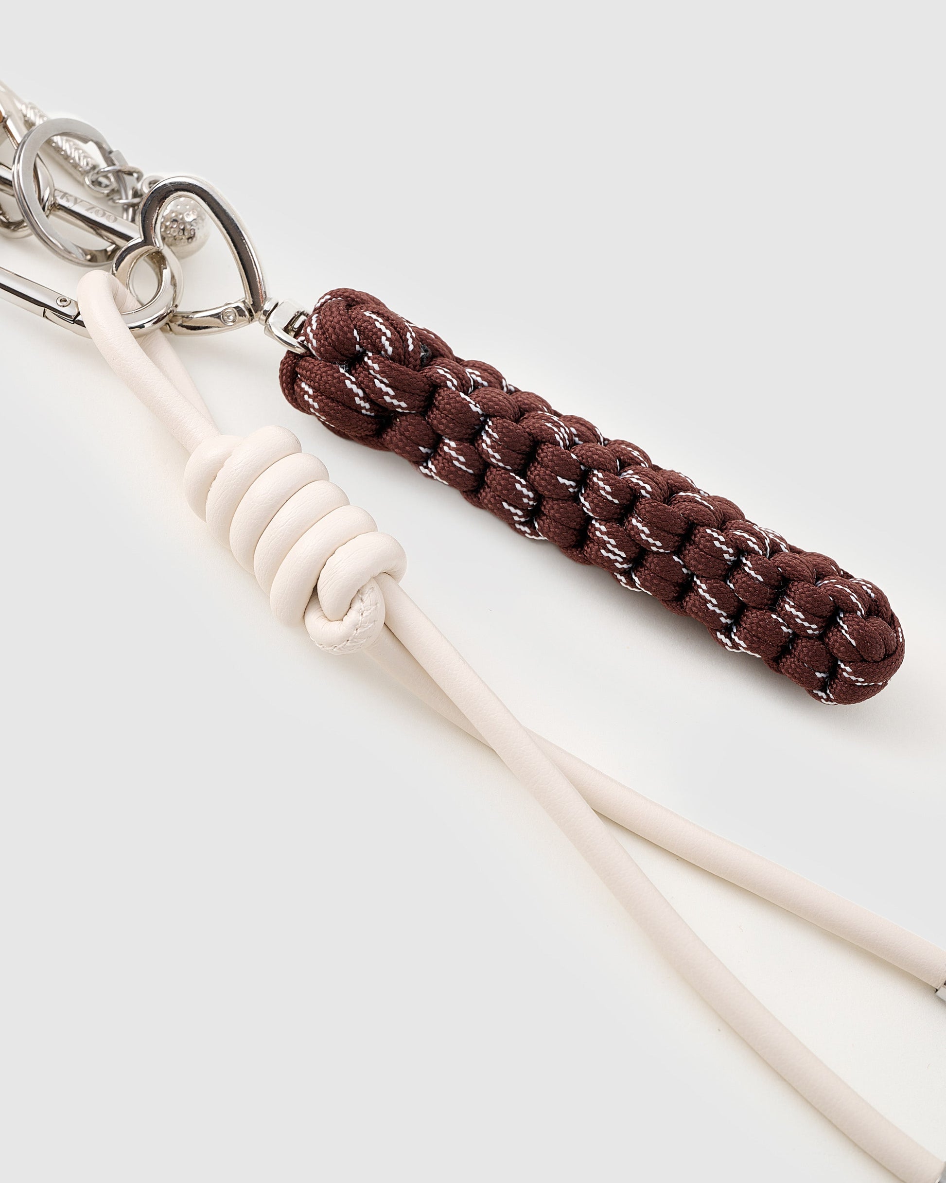 - Materials: Plush crochet yarn, resin chocolate charm, faux leather & paracord ropes