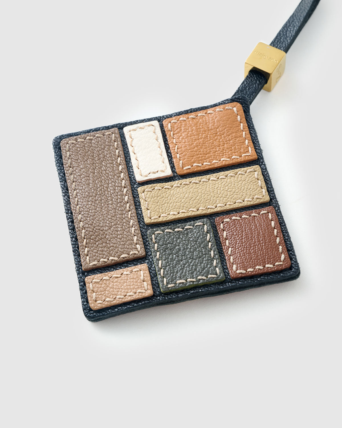 Design story: Inspired by the abstract works of Piet Mondrian, this charm transforms minimalist geometry into tactile beauty. The structured leather blocks form a striking composition that represents balance, creativity, and order — a small artwork designed to travel with you.