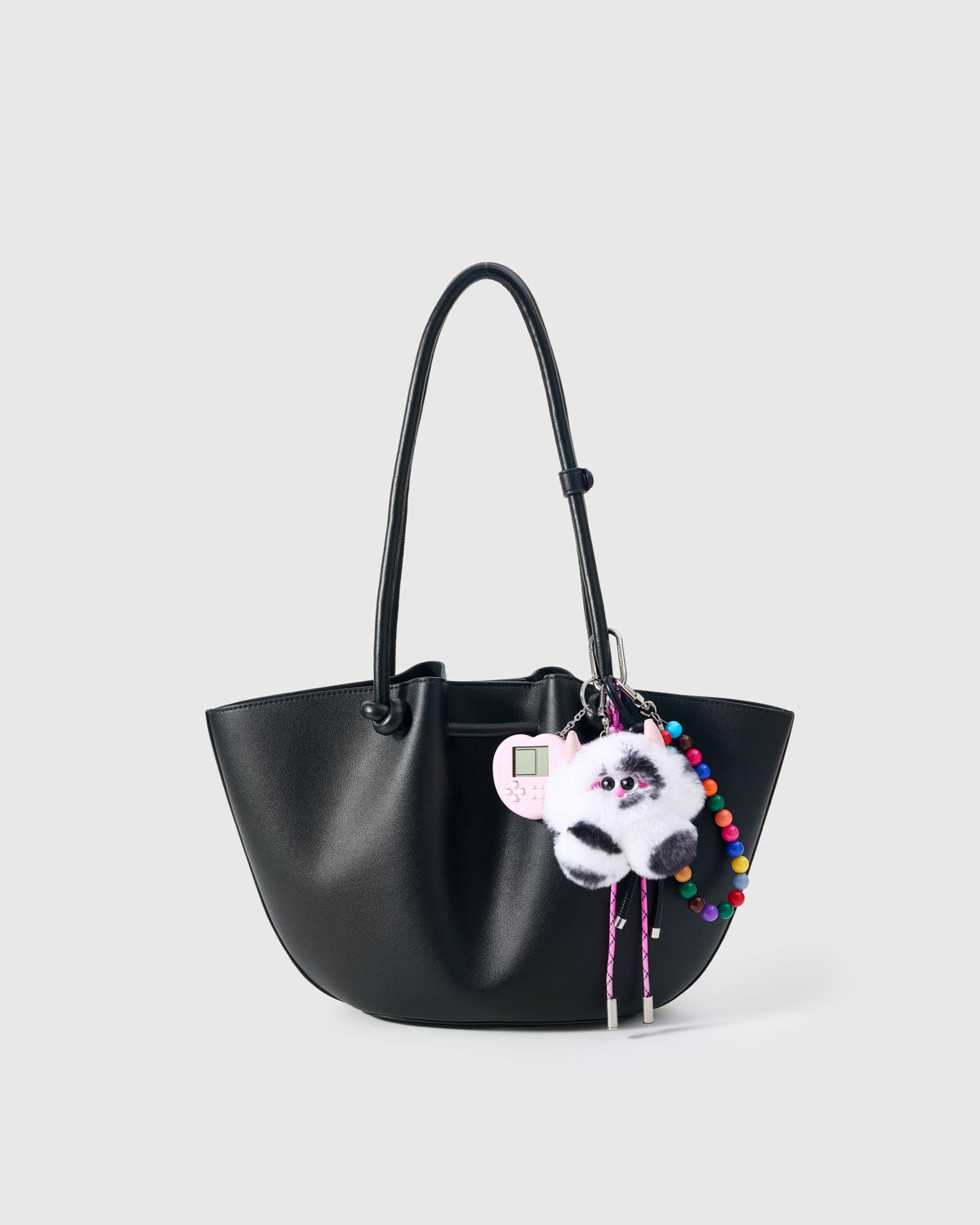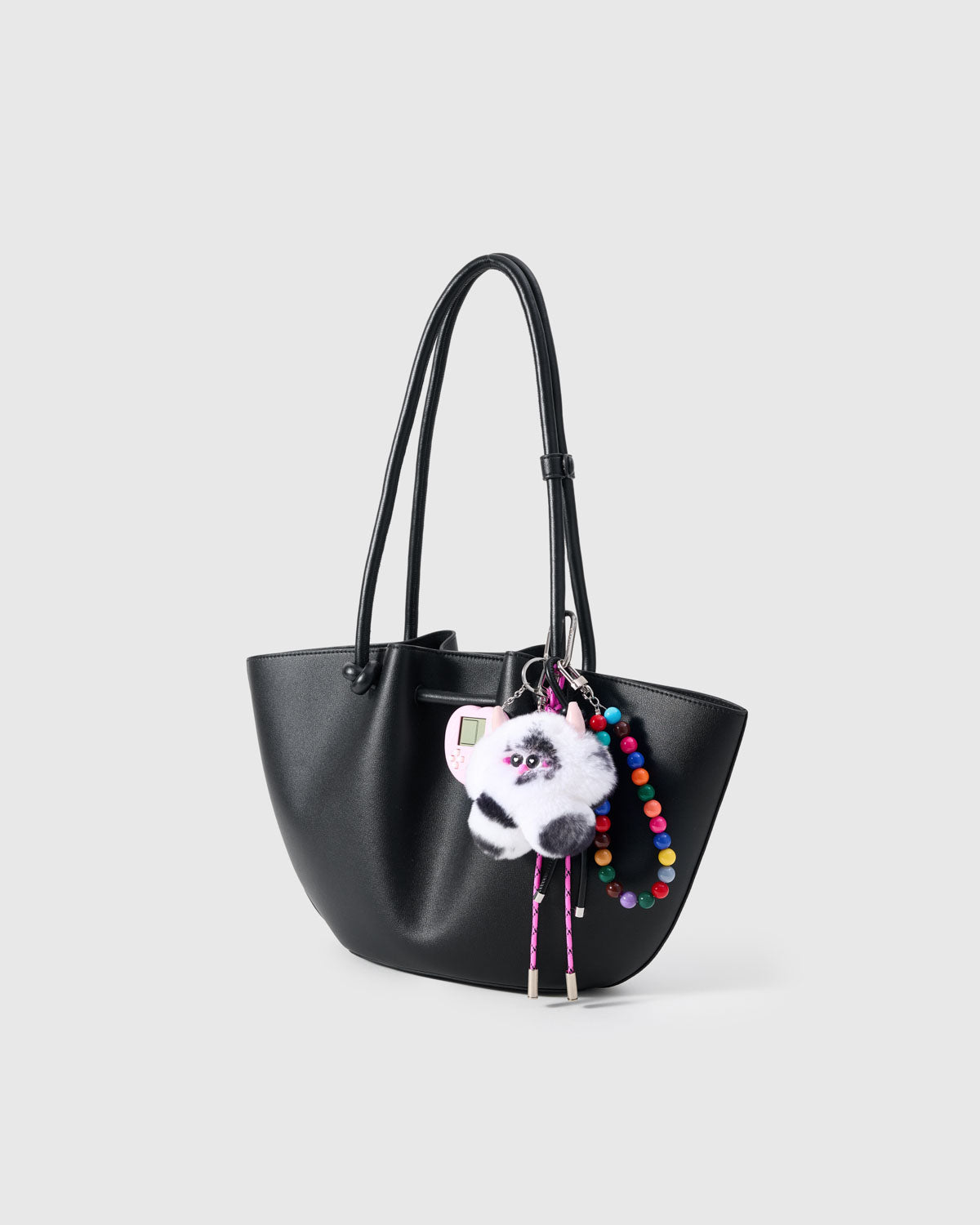 | Materials | Plush puff mascot (black & white fur); ABS mini game console (lavender); acrylic rainbow beads; nylon cords (hot-pink & black); stainless-steel hardware |