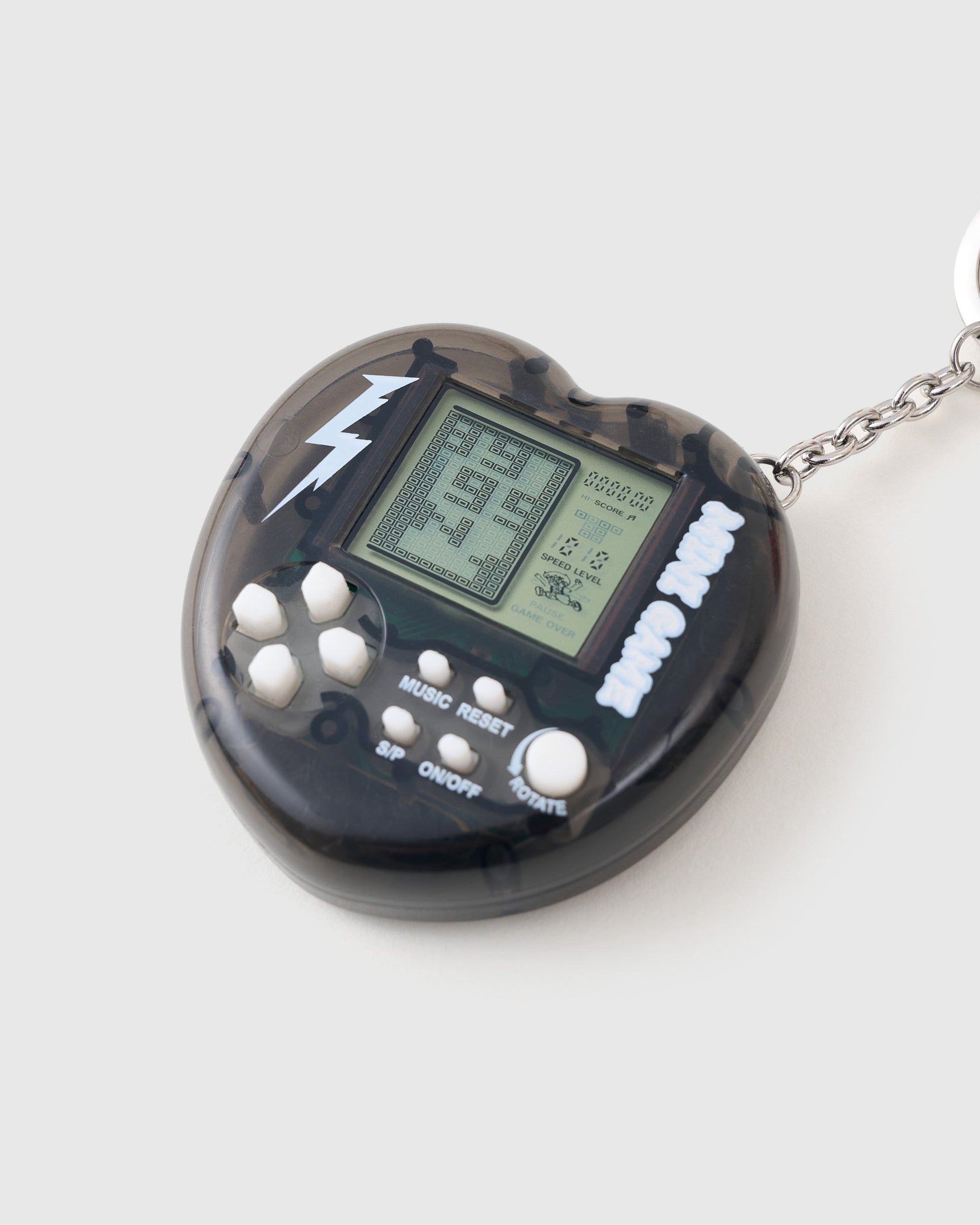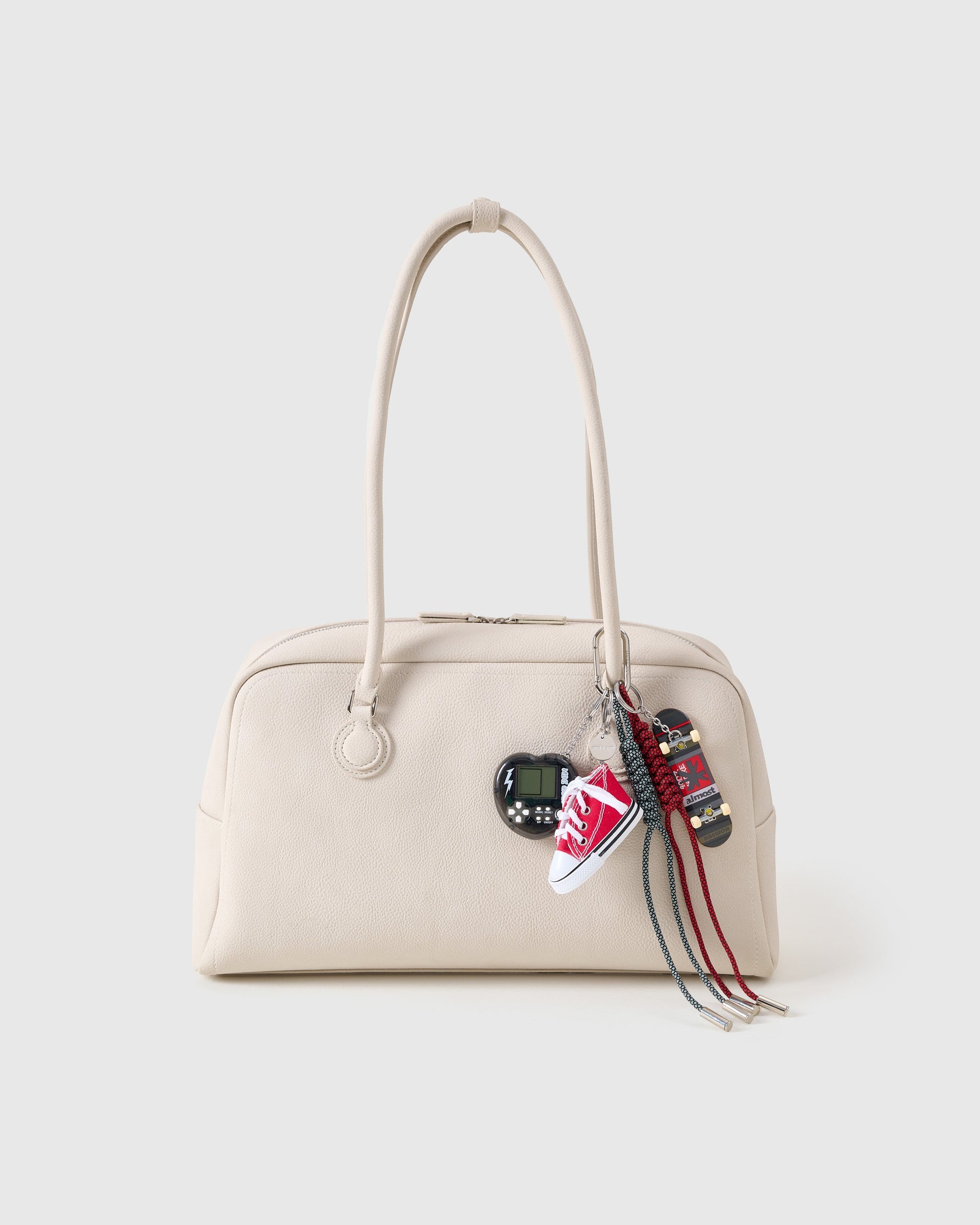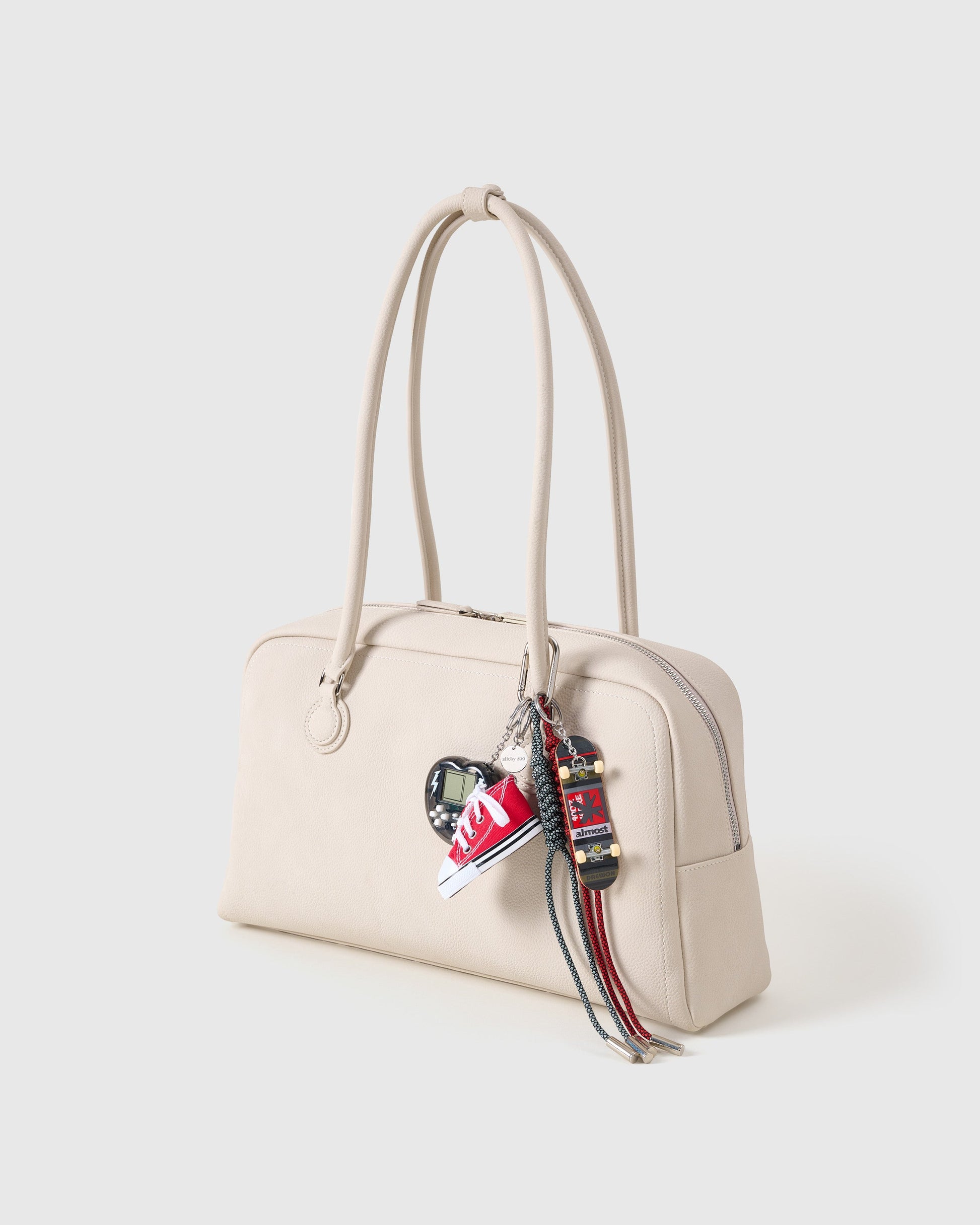 SKATEBYTE STACK CHARM blends nostalgia with real craft. The standout piece: a mini skateboard carved from real wood, hand-finished and assembled for flick-ready detail. It's paired with a canvas sneaker charm, pixel game heart console, and double-wrapped paracord ropes to create a charm stack that rides as hard as you do.