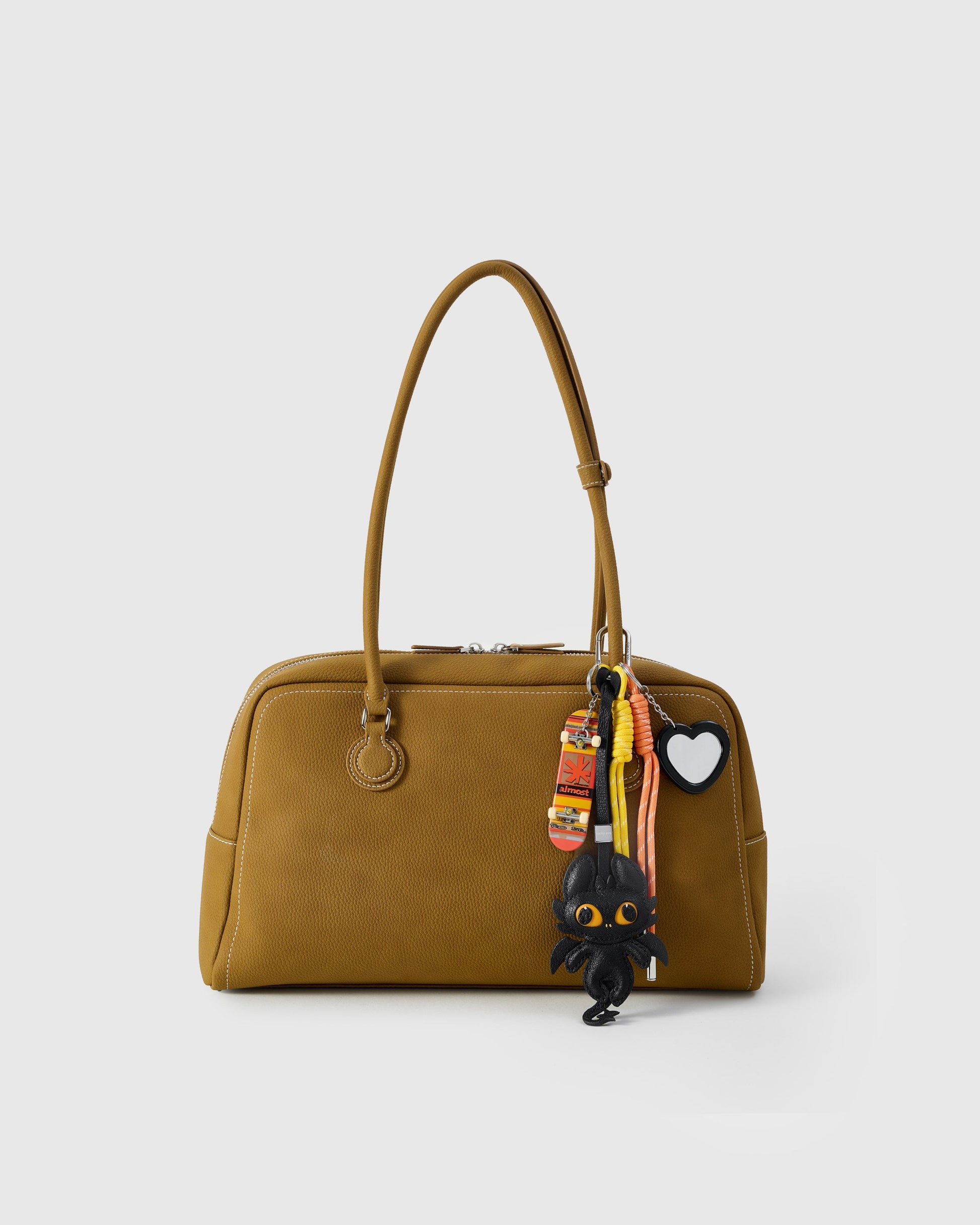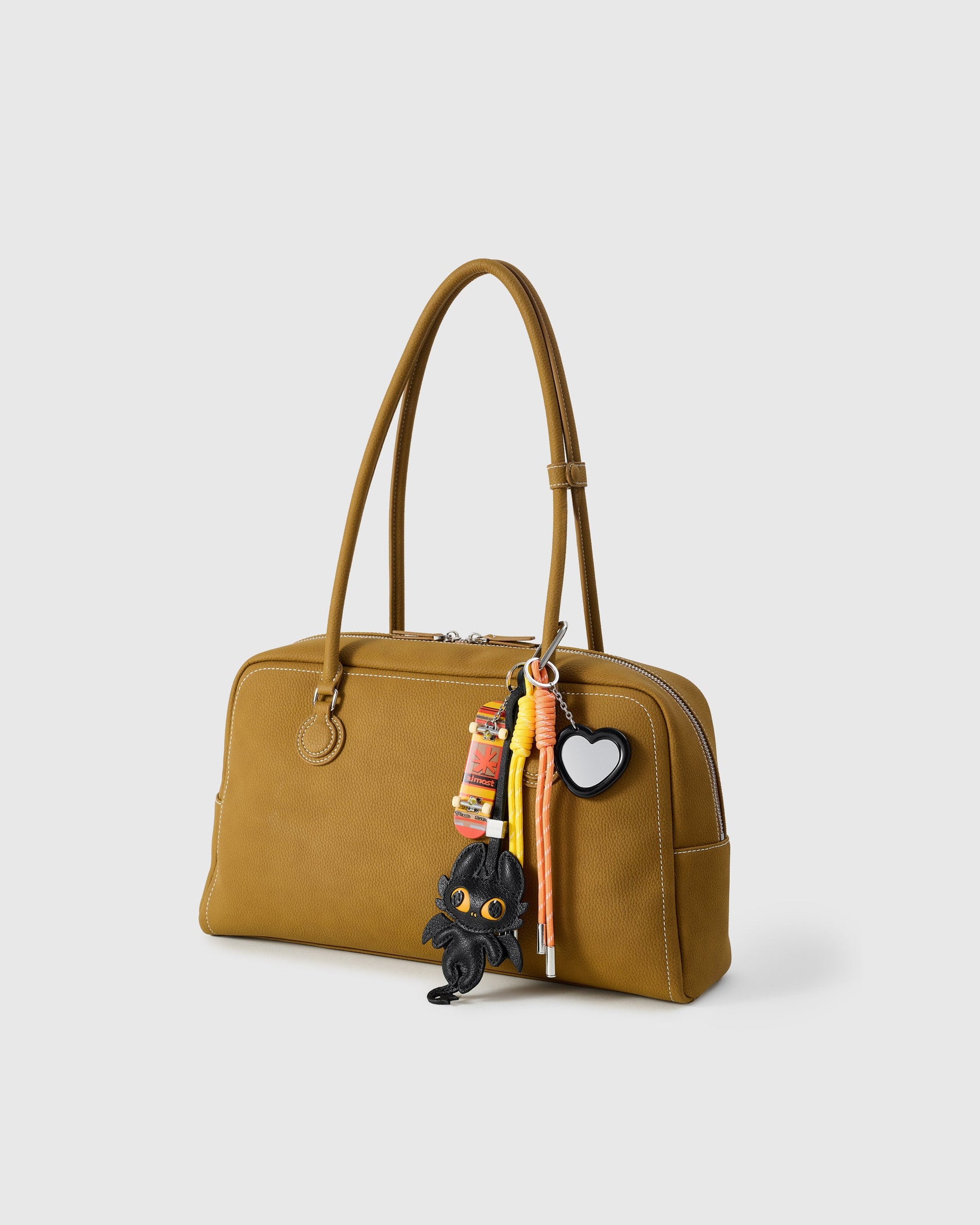 | Materials | French Alran sheepskin leather (dragon), acrylic heart mirror, mini skateboard charm, nylon paracord |