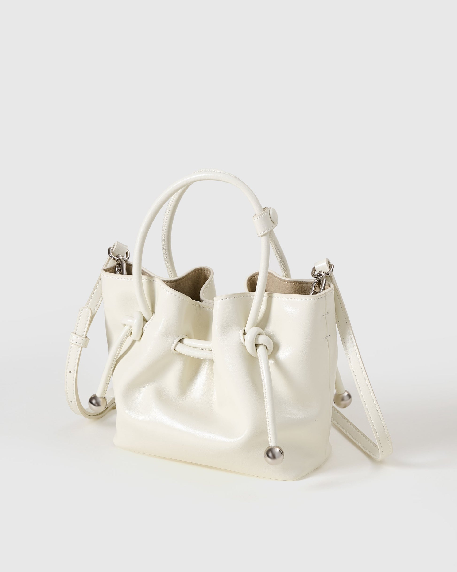 THE SOHO VEGAN LEATHER MINI TOTE is bold, chic, and confidently stylish. Crafted from premium vegan leather with a luxurious feel, its signature drawstring detail with polished stainless steel accents adds a playful twist to classic sophistication. Available in two delicate shades—soft cream and elegant ivory—this mini tote includes an adjustable, detachable long strap for versatile, hands-free wear.