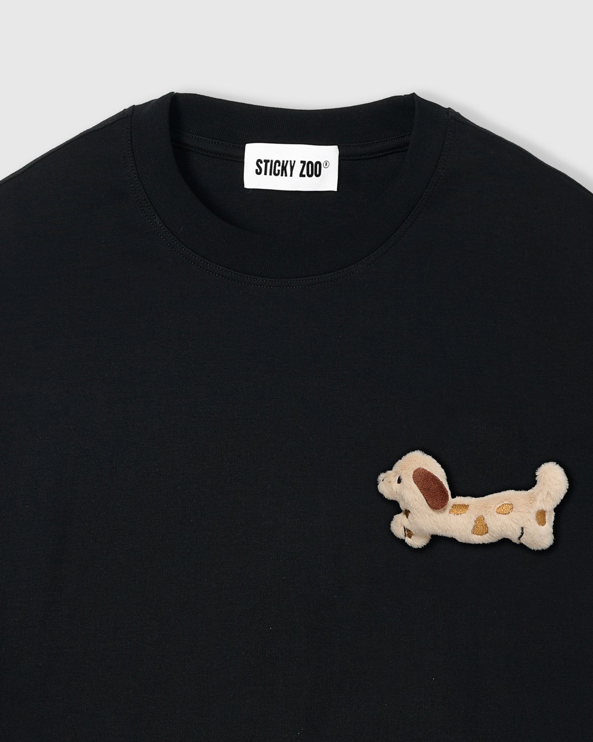 SPOTTY DASH DACHSHUND T-SHIRT brings cozy energy with a dose of puppy love. Designed with hand-stitched plush dachshunds in creamy fur and spotty patterns, this shirt is more than wearable—it’s your daily serotonin hit. Whether you dress it up or down, the soft drape and structured silhouette keep your look elevated.