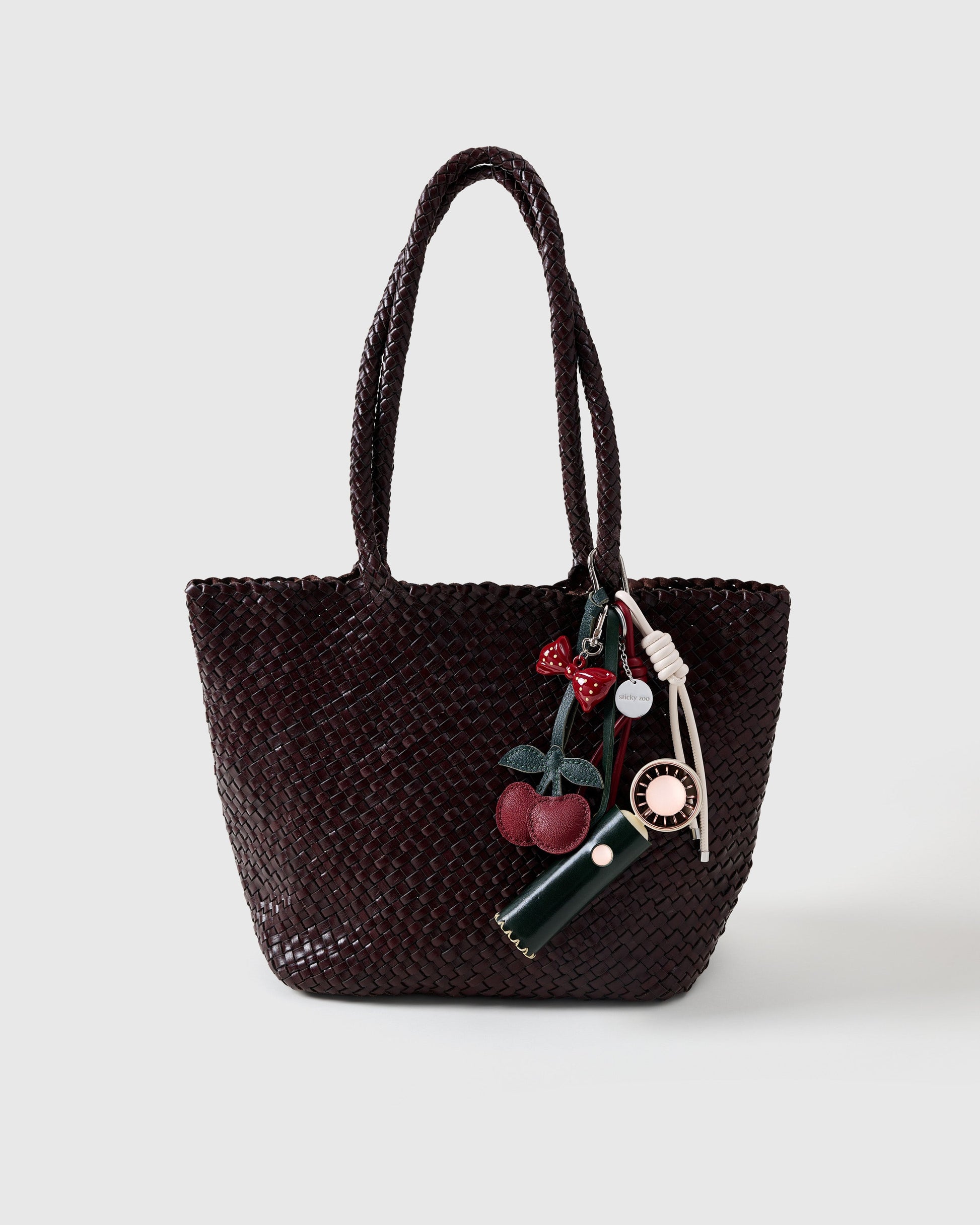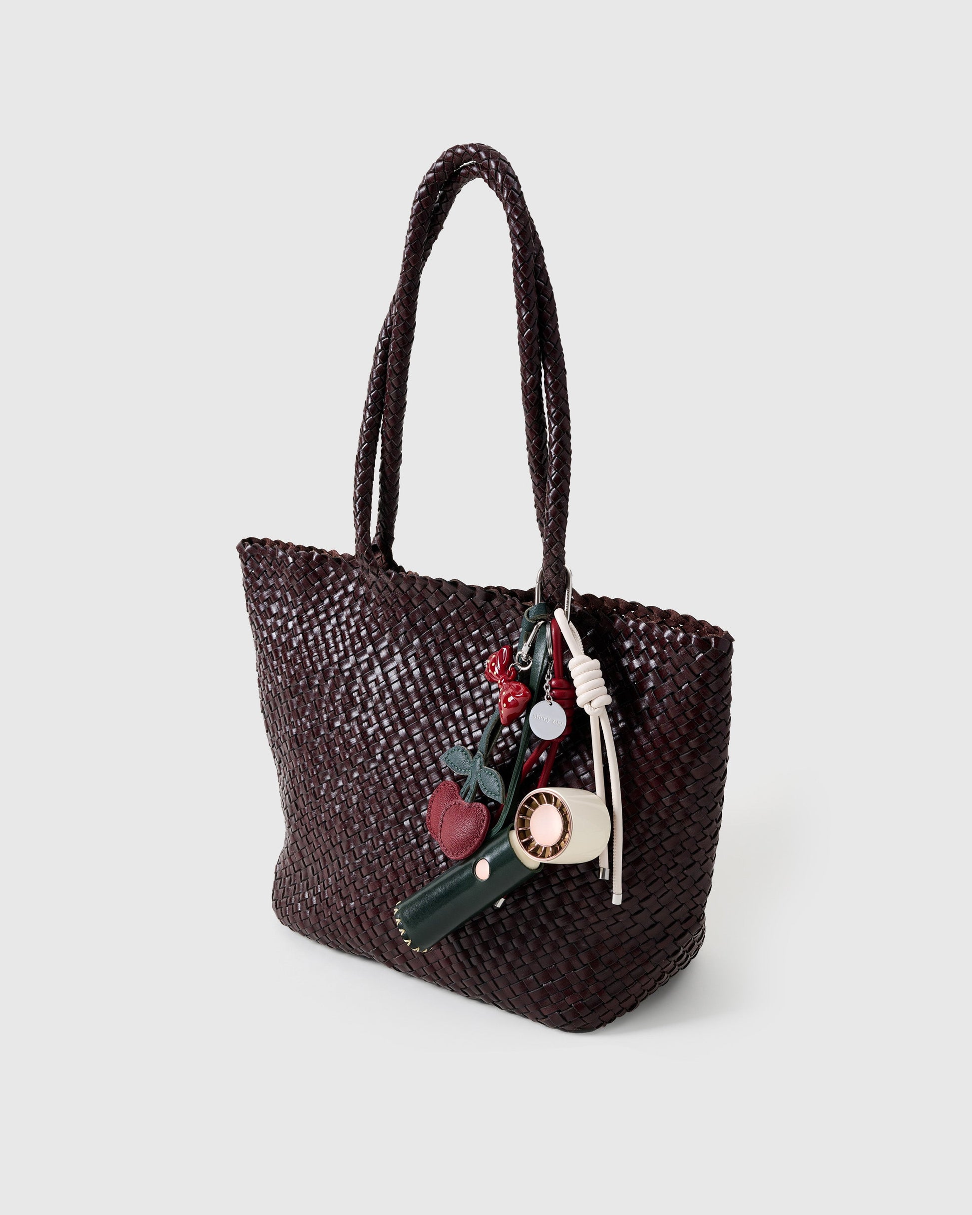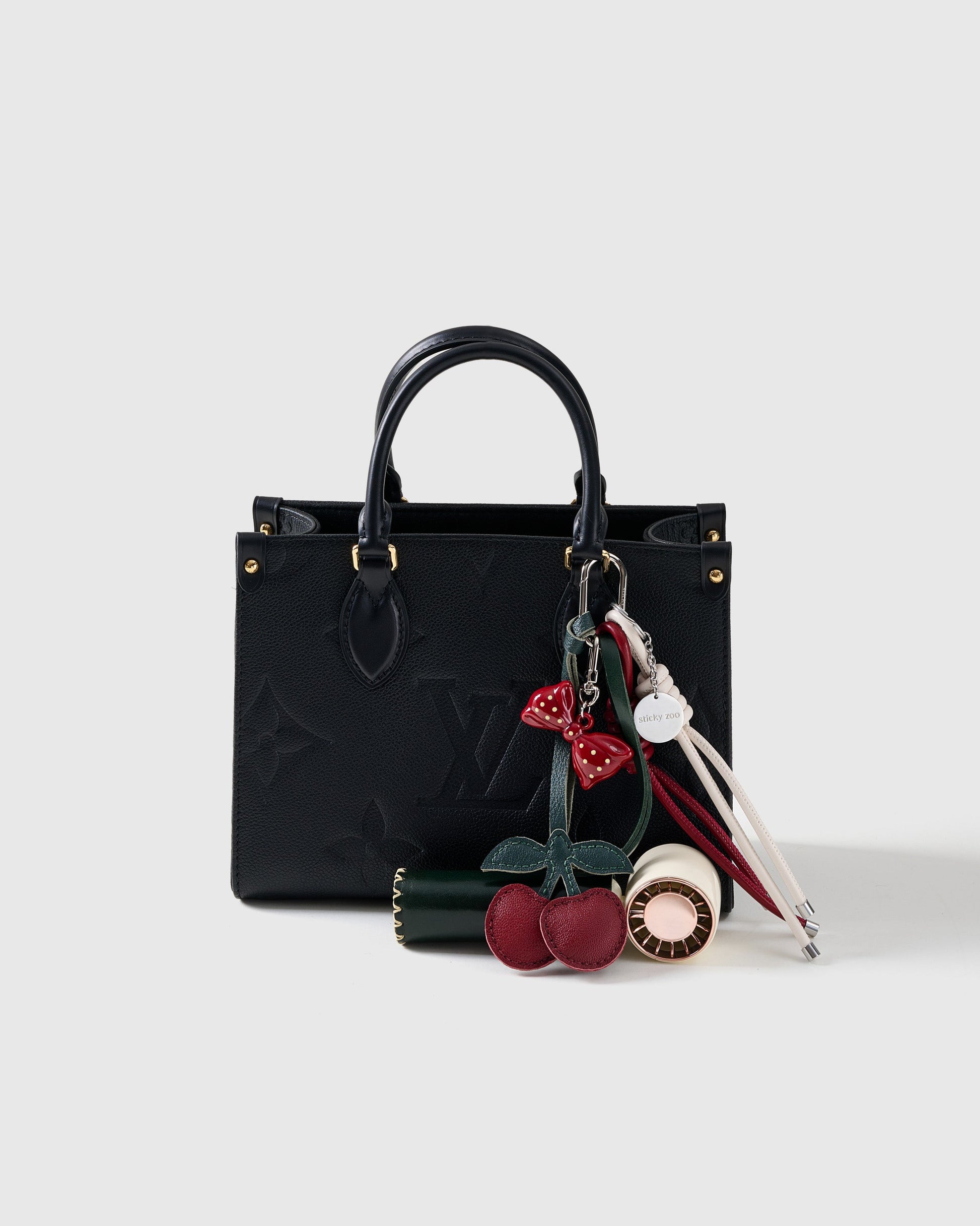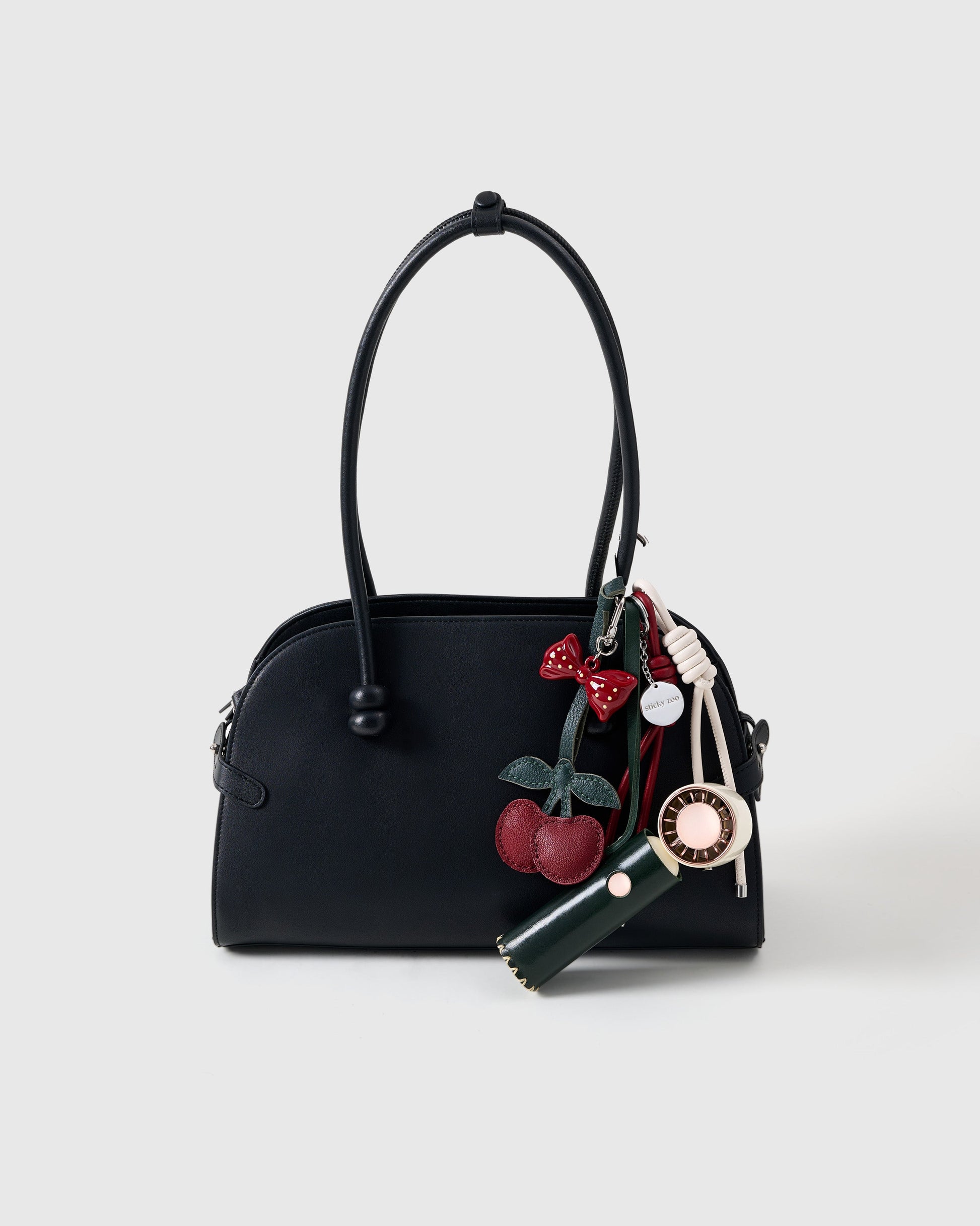This one’s cherry-picked to perfection. The Cherry Charm - Cool Stack features a deep forest leather shell, glossy bow topper, and stitched double-cherry dangle for that polished-yet-playful vibe. But it’s not just a looker—hidden inside is a rechargeable, whisper-quiet mini fan (yep, really), perfect for heatwave commutes or glam breaks between snaps. Finished with vanilla and cherry red Sticky Zoo® ropes and a stainless steel hook engraved with our logo, it's everything you didn’t know you needed, but now totally do.