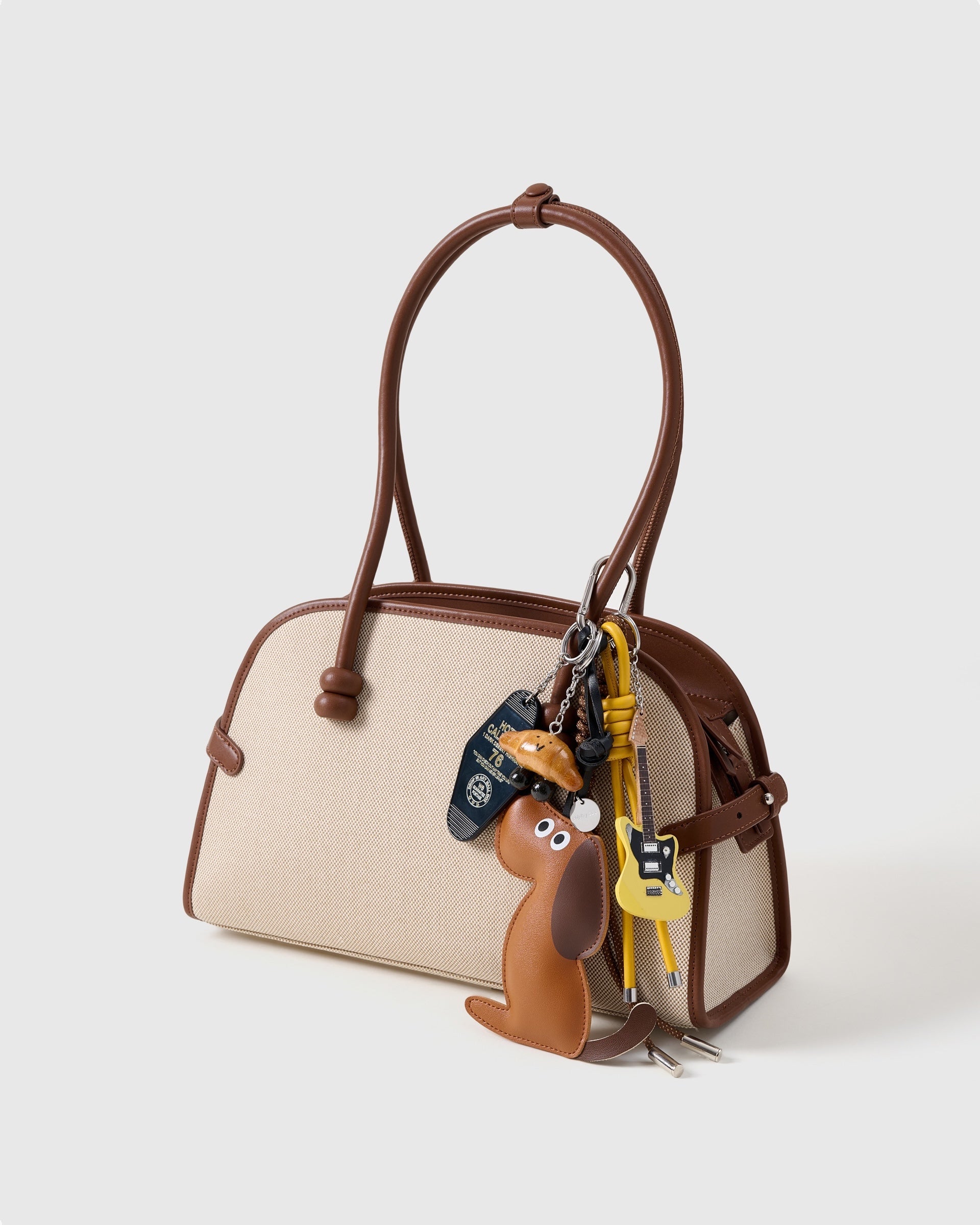 Built from caramel-brown vegan leather and stitched into a sitting pose that’s ready to beg for attention, it’s finished with a croissant charm, a tiny electric guitar, and twist-wrapped dual-tone leather ropes. From Hotel California tags to eye-pop details, every piece hits like a secret souvenir from a world only real charm collectors know.