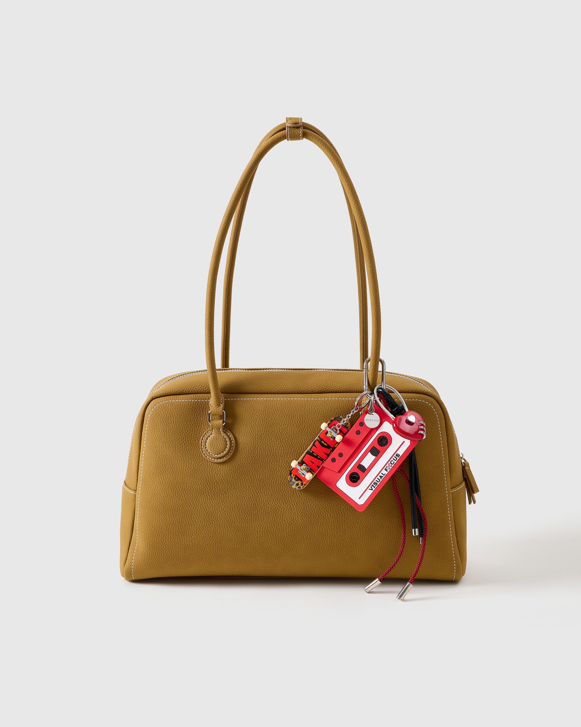 🎶 Meet the CASSETTE TAPE STACK CHARM—your new favorite remix of joy and memory. Built around a mini yellow recorder-style cassette (yes, the tape rolls!), a crocheted sleepy bear plush, and a metallic smiley bead chain, this one sings a retro tune. Paired with dual-tone leather and paracord ropes, it’s your bag’s backstage pass to good vibes.