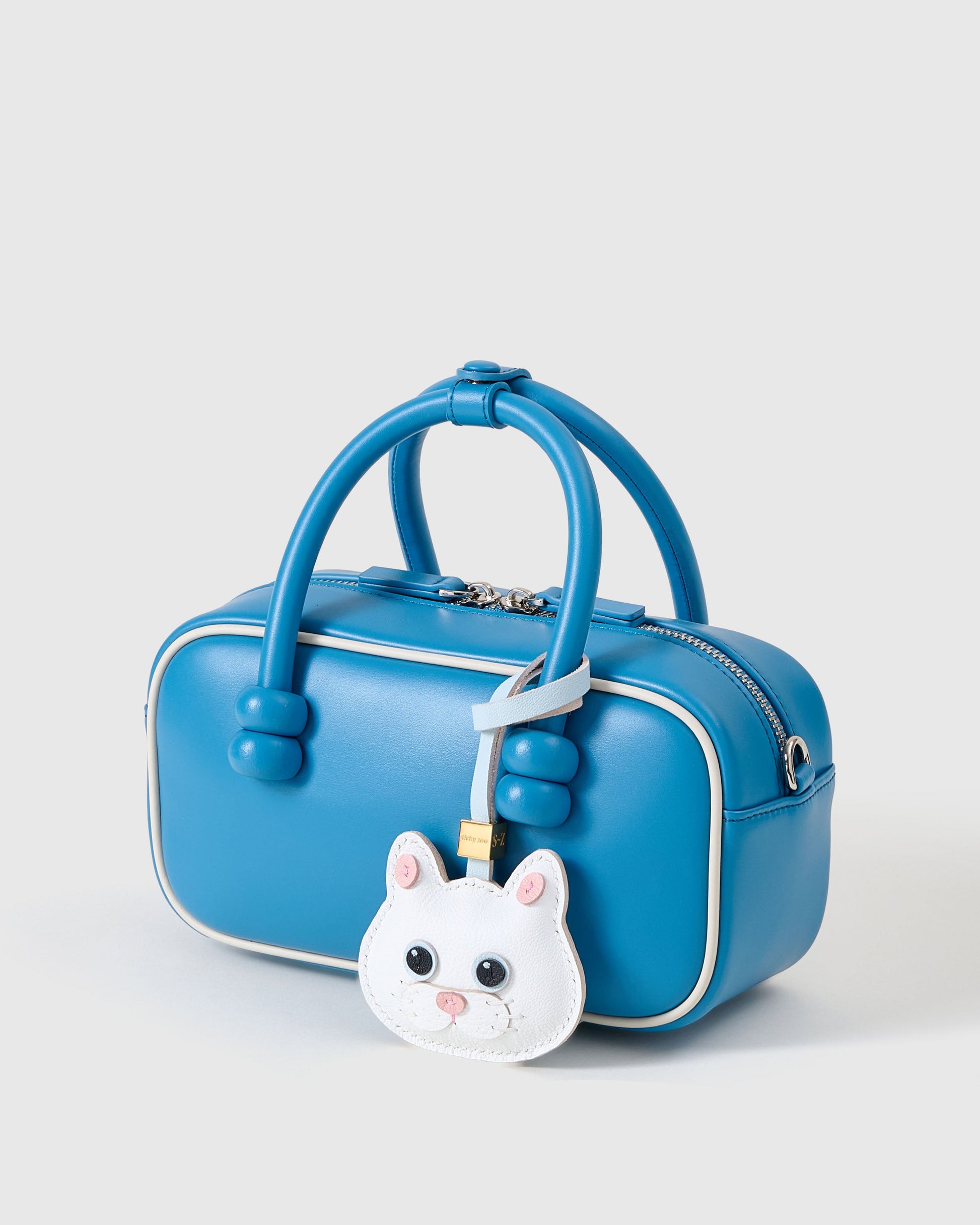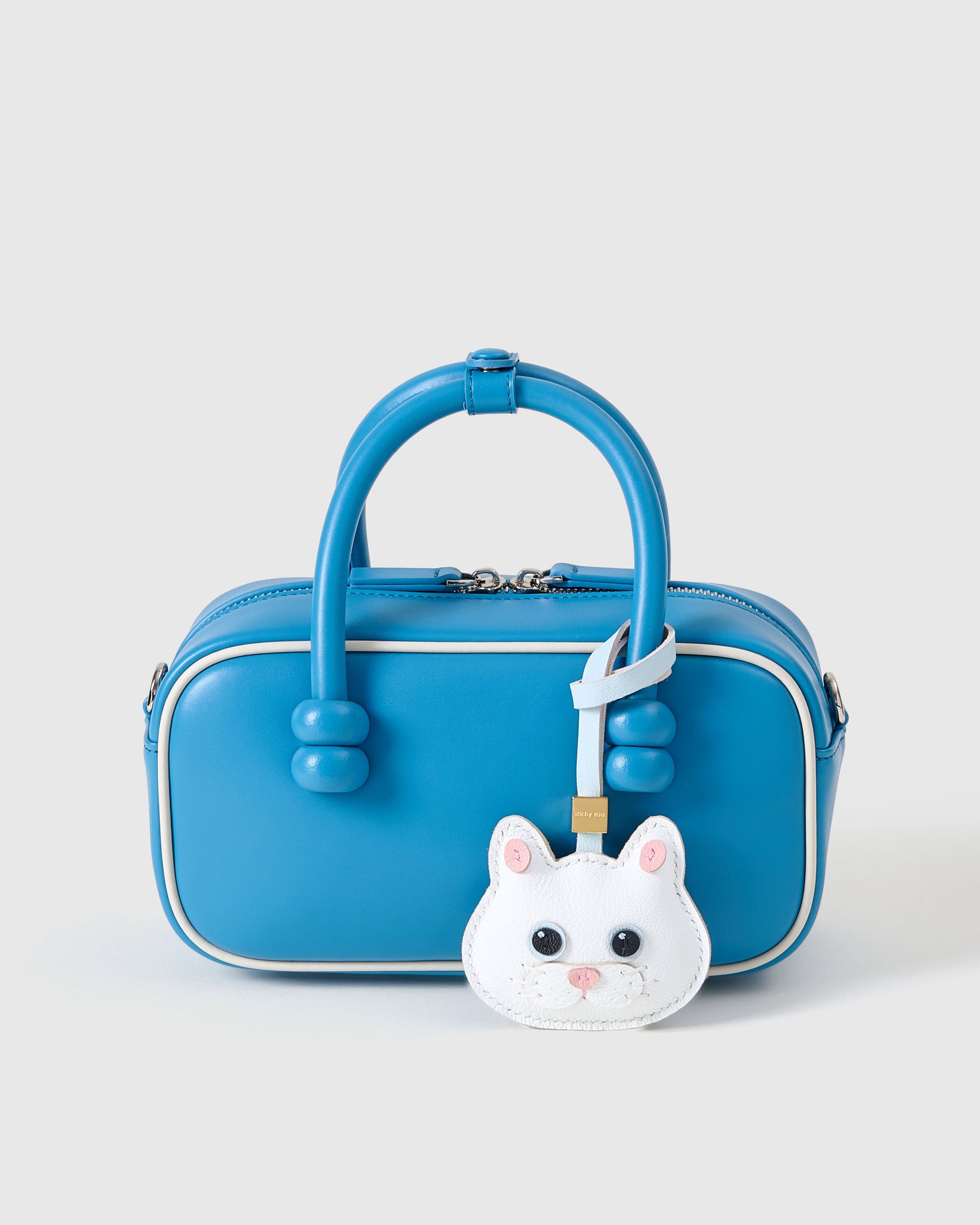 The BRITISH SHORTHAIR CAT CHARM is handcrafted in a crisp white finish with baby pink ear and nose details, capturing the refined sweetness of this beloved breed. The sky blue strap and gold cube hardware complete the minimalist palette with a dreamy touch.
