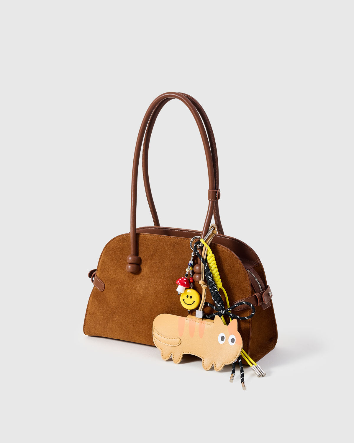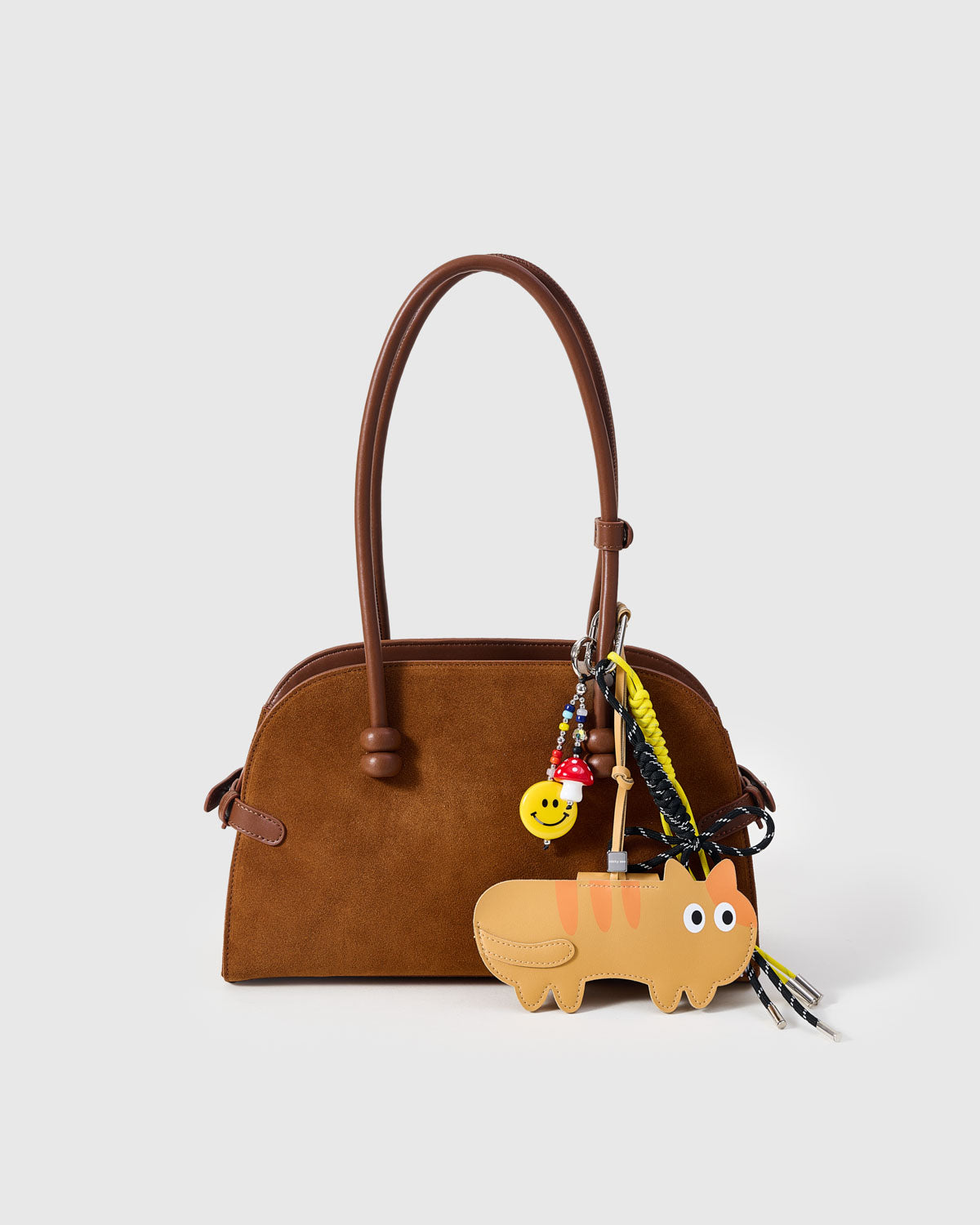 Sunshine, smiles, and a dash of weird. A happy orange cat, smiley bead, and mushroom charm turn your bag into an instant good-vibe machine.