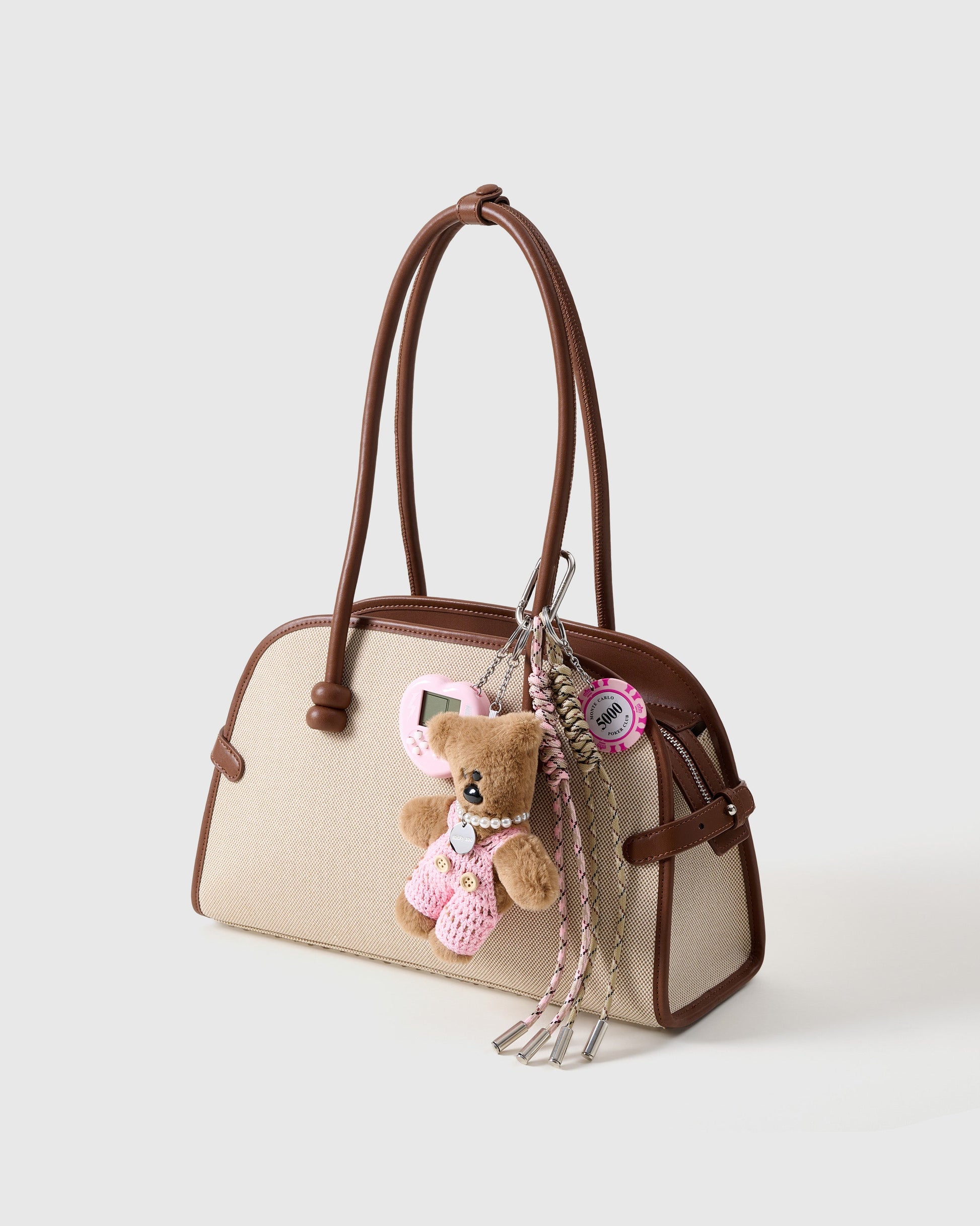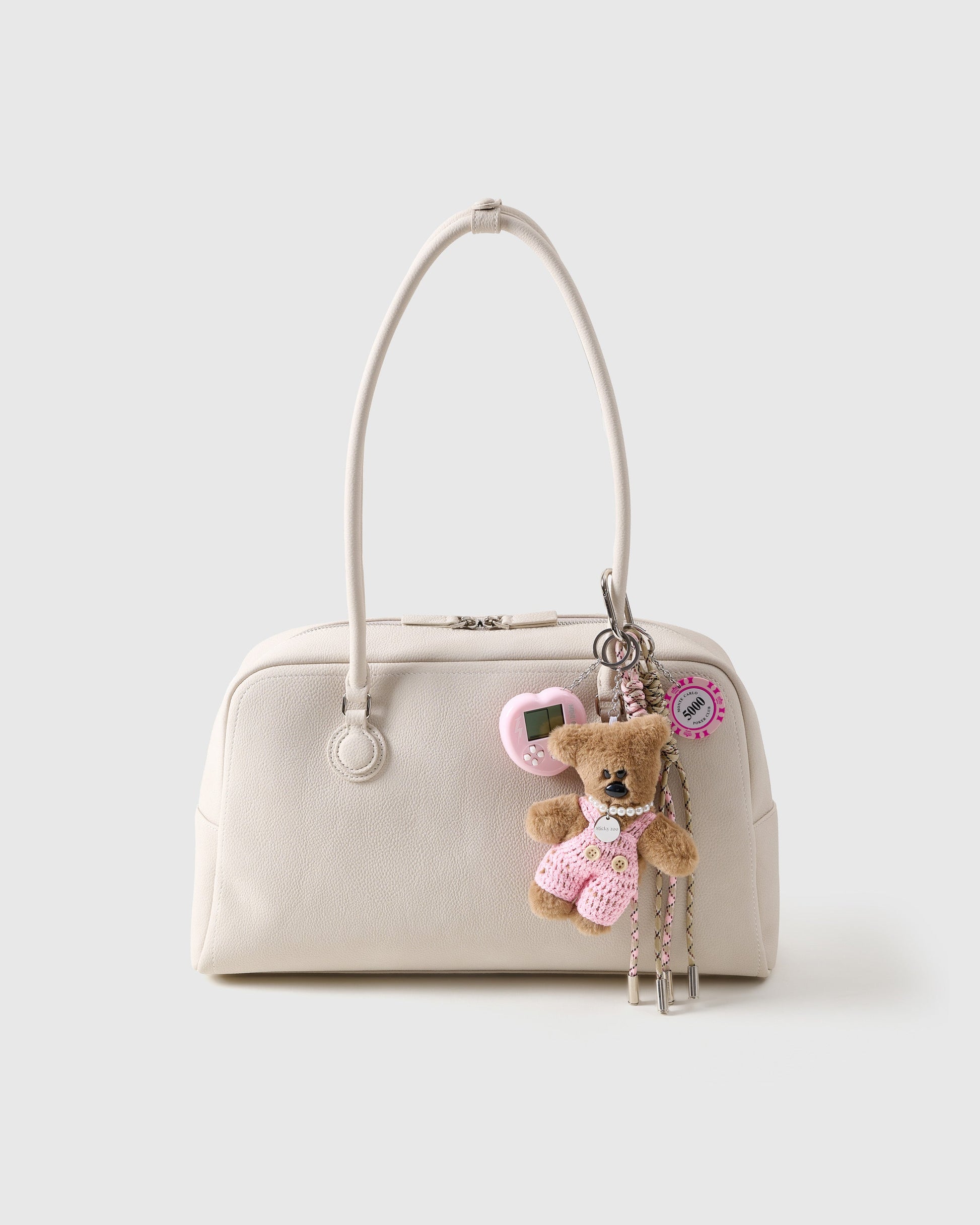 TINO PINK HUSTLE CHARM isn't just cute—it’s pure ambition in plush form. Celebrating dreams, drive, and hustle, this candy-colored teddy wears handcrafted pink crocheted overalls, adorned with plush faux pearls, casino-inspired charms, and a nostalgic mini game accessory. Every stitch radiates confidence, style, and playful determination.