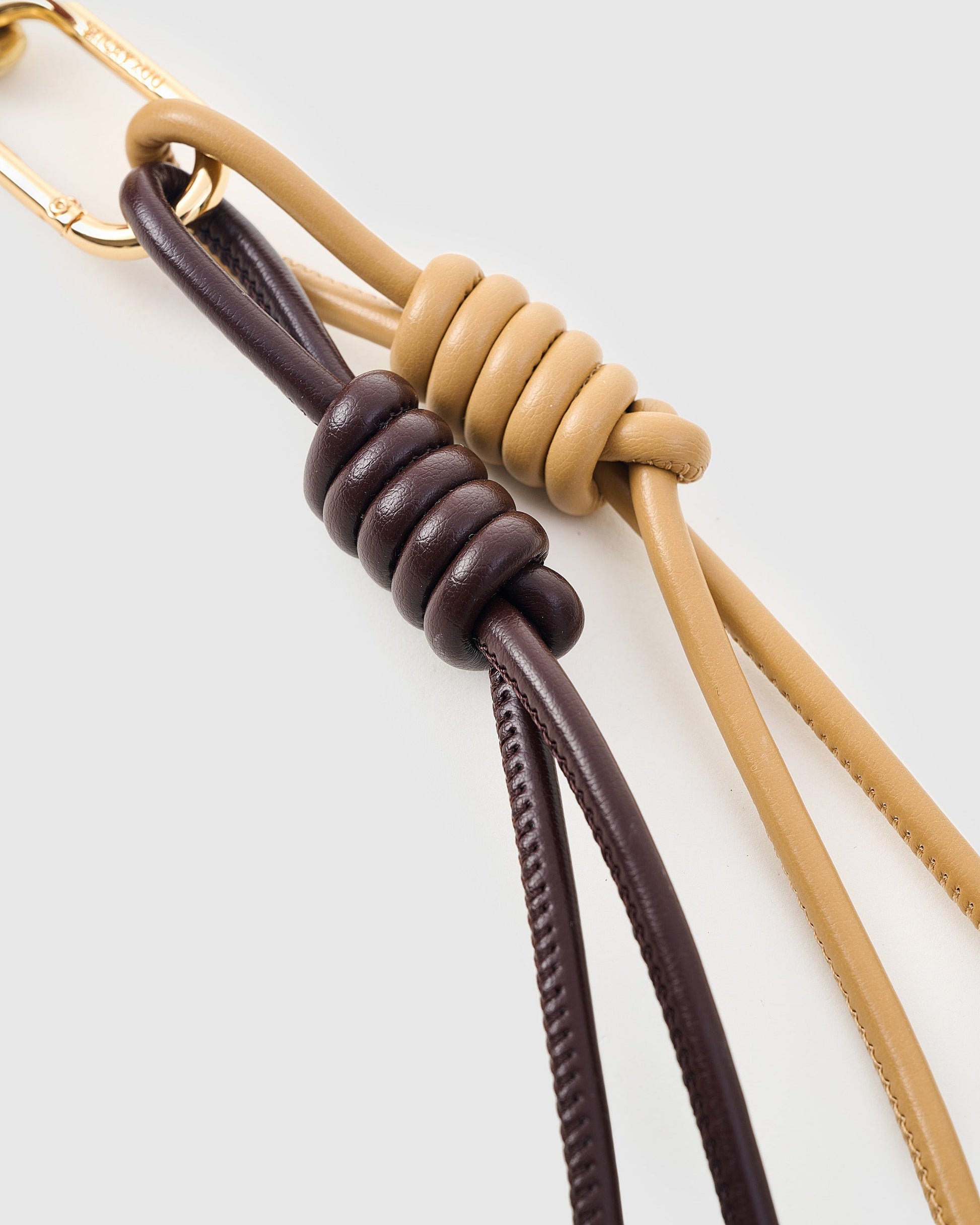 | Materials | French Alran leather mini cap (panel-stitched); French Alran leather rope cords (cocoa & sand); gold-tone accents |
