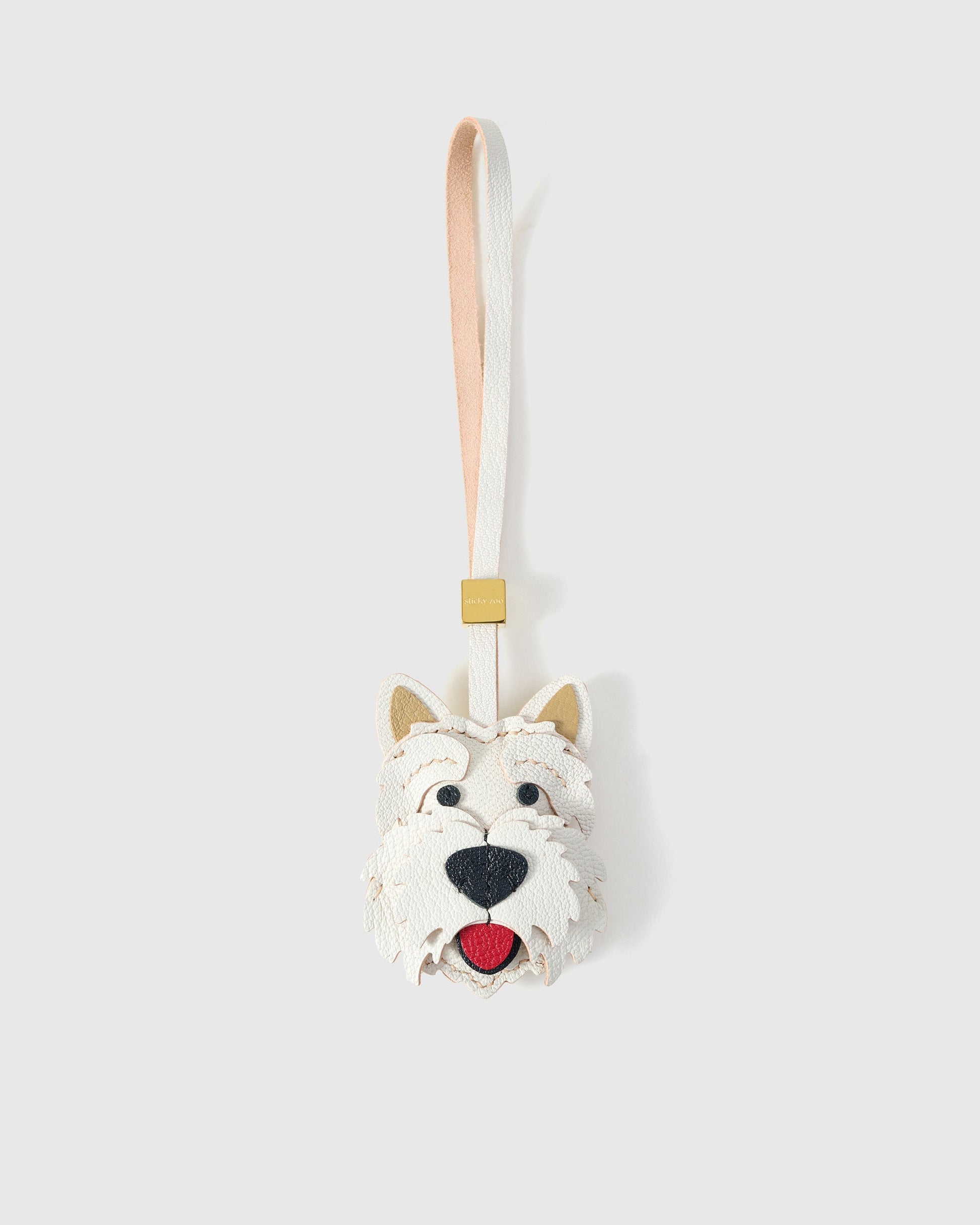 West Highland White Terrier — known for its soft white coat and lively spirit, brought to life through layered leather craftsmanship. With textured appliqué fur, a bold black nose, and a pop of red tongue, every detail captures its joyful expression.