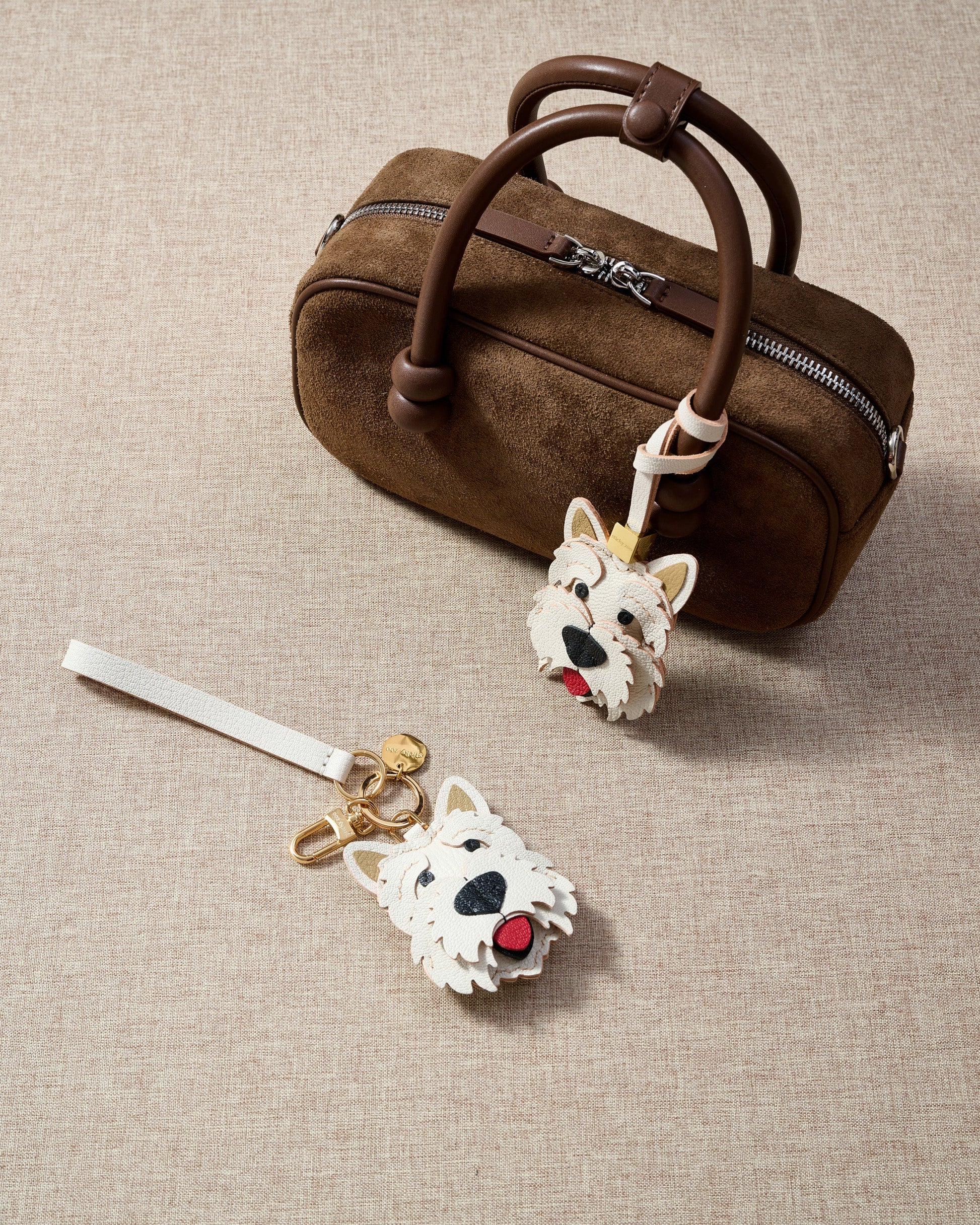 The WEST HIGHLAND WHITE TERRIER CHARM from STICKY ZOO® embodies cheerful sophistication—meticulously handmade from French Alran leather and shaped with layered fur appliqués. Designed to move seamlessly from bag charm to keychain, it celebrates the iconic Westie’s playful yet refined charm.