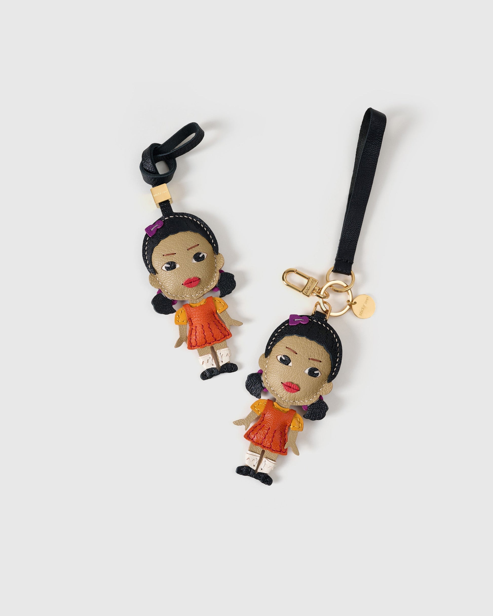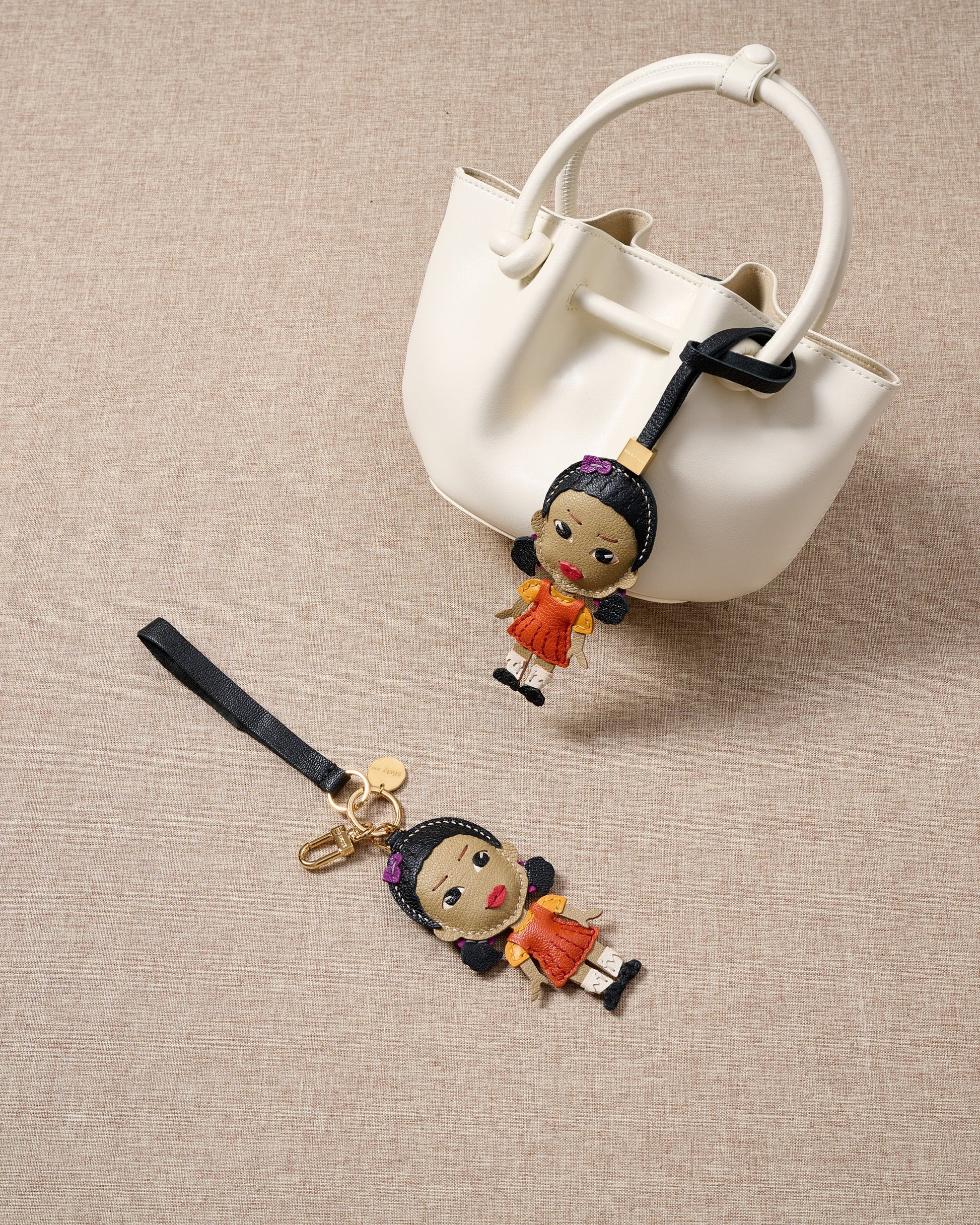 Attach her using the flexible black leather loop or the chic 18K gold-plated keychain clasp, both elegantly engraved—ready to charm your day and style.
